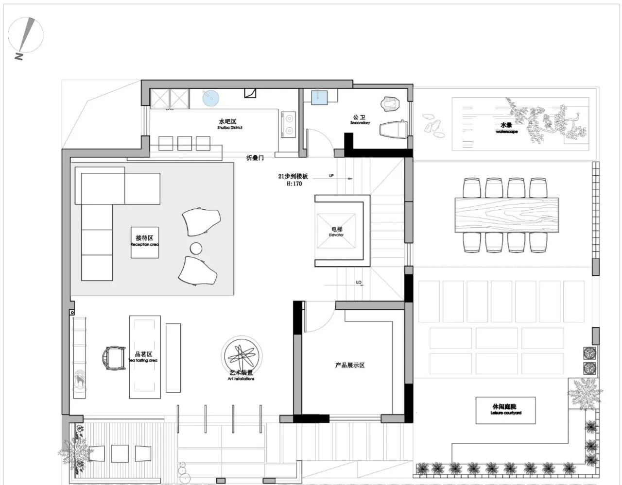 庭院区可以治谈非私密话题、闲谈,或是作为等候区,风格和设施是舒适简约,有特别的设计的绿植墙,摆放一些生机的绿植,让人有一种舒适放松的感觉。