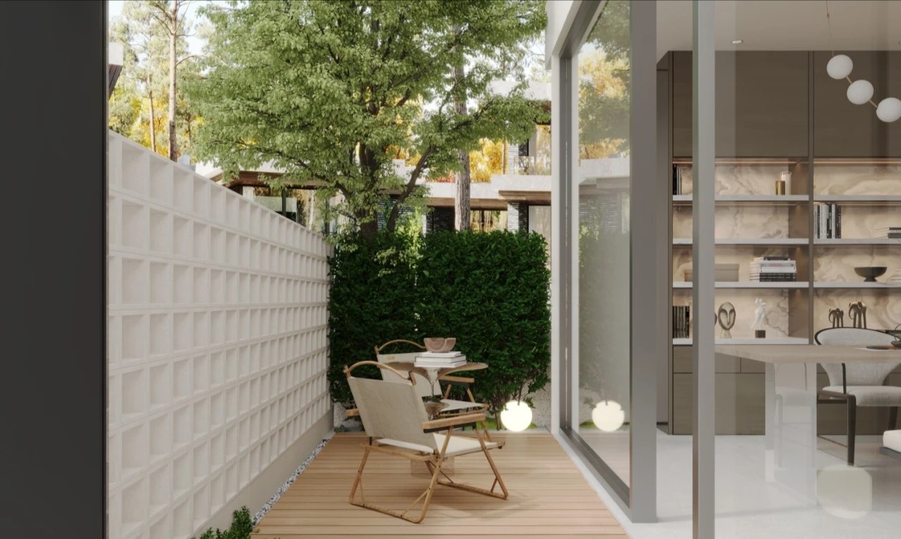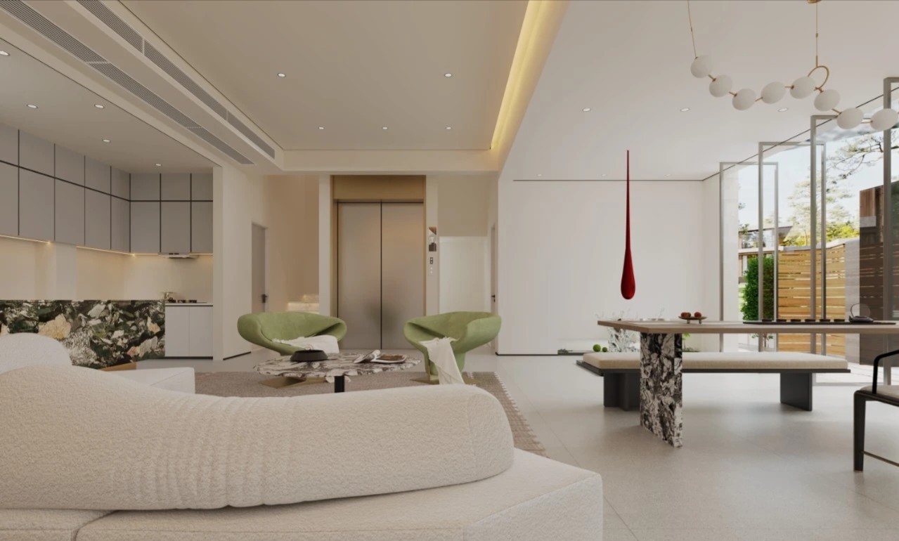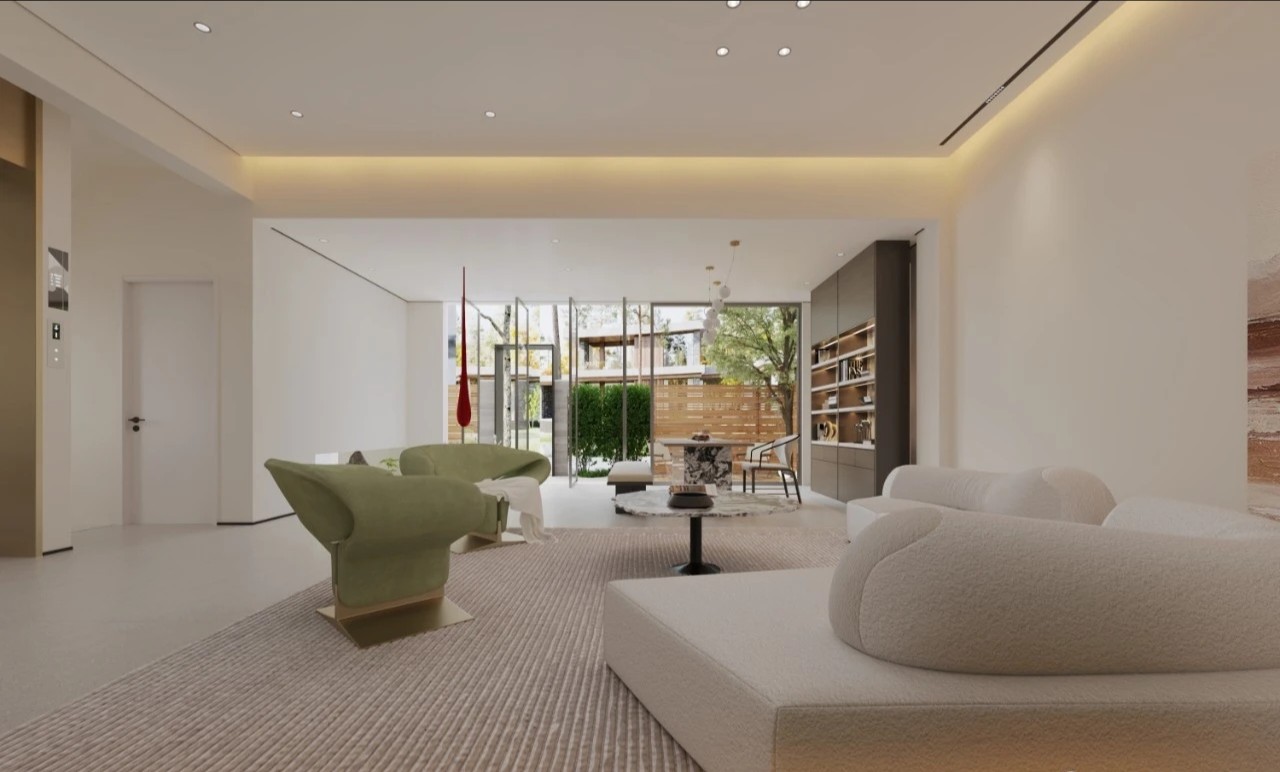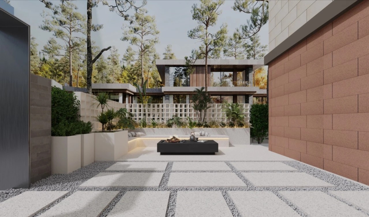 沿着鹅卵石和石板铺辰的小路来到庭院接待区域,引入绿植、山水与温暖的木色点缀,融合户外美学的特点,呈现出一种简单利落且宁静的环境,营造出自然的氛围感,舒适的座椅、艺术性的装置打造了和谐有趣的洽谈区形式,给予客户一种舒适放松的感觉。