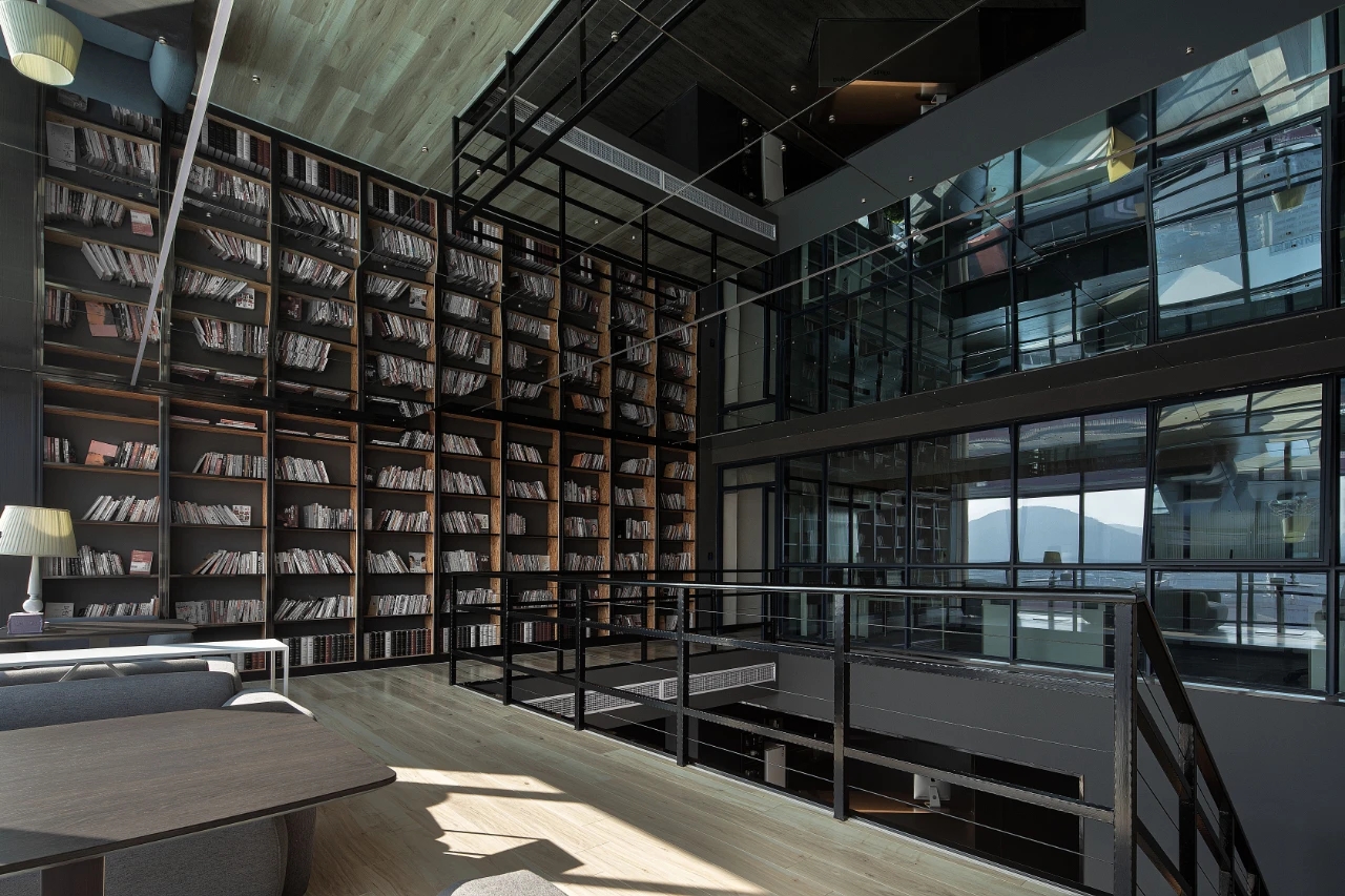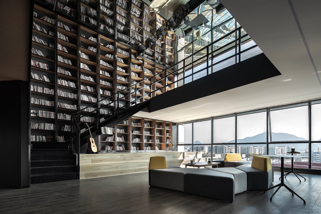 我们在空间中设立了一个读书空间,通高的书架,抬高的榻榻米,顶面上运用镜面将空间拉高作为阅读小歇的区域,打破传统办公空间的呆板ˎ严肃形象,给予办公者最大程度的自主性,释放办公体验,激发不同的办公文化与诉求,在解决功能的同时,我们也塑造了空间的气质和形式。