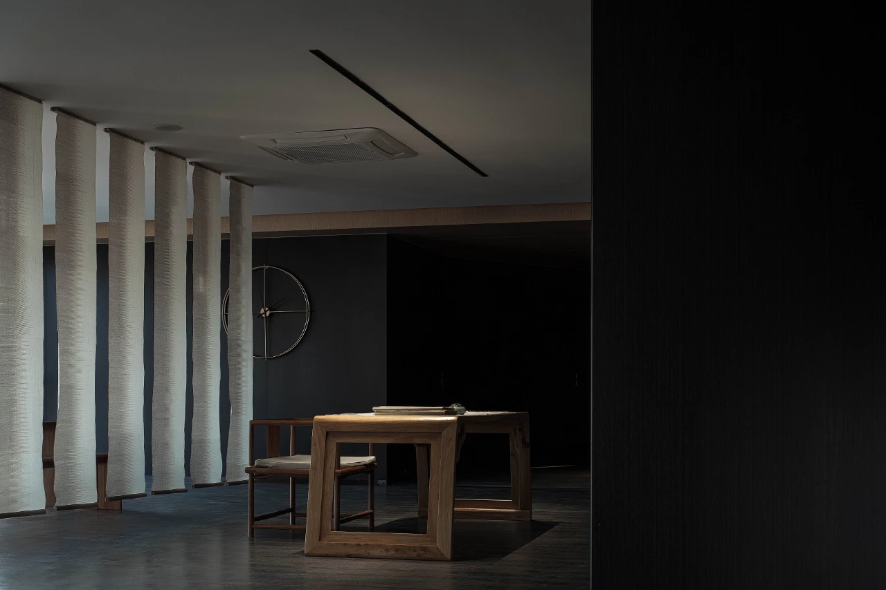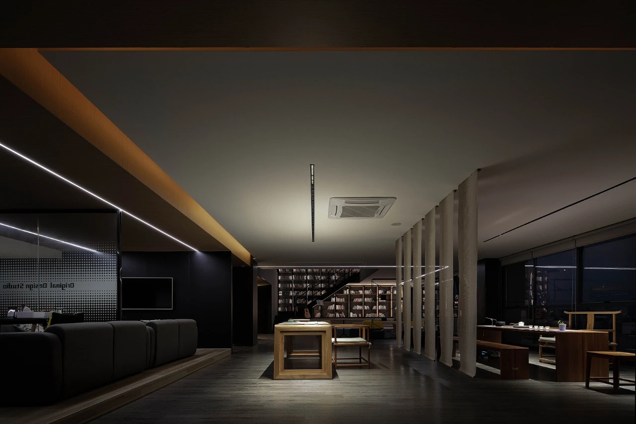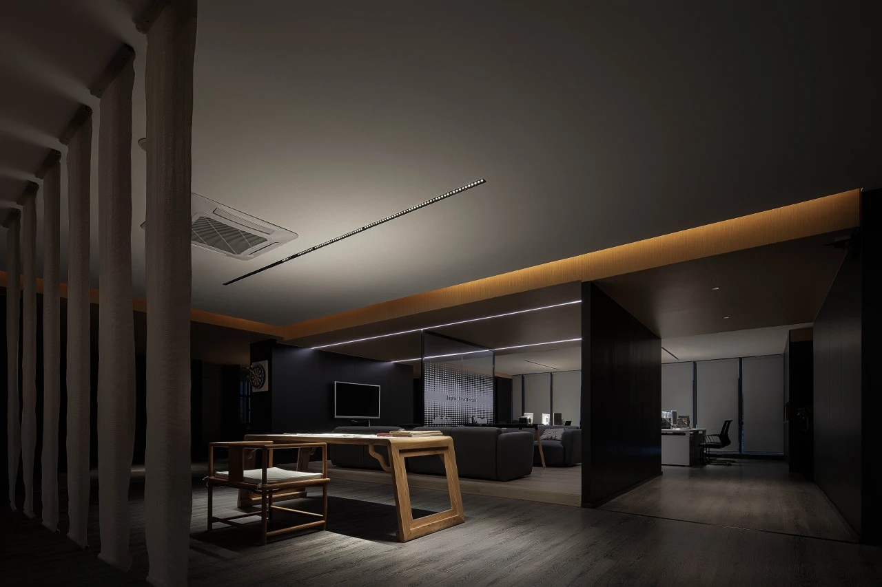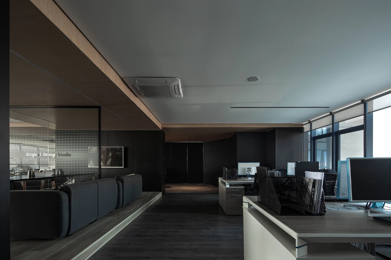 本次设计项目为办公空间,整体色调以灰色,原木色为主,墙面运用了深灰色的真木饰面板,让空间尽显沉稳,局部运用原木色做为点缀,作为空间的亮点。不纠缠于繁琐,用极简的设计诠释空间美学,去繁就简剔除多余的装饰元素,用最直白的设计语言营造新办公空间体验氛围。在办公区划分出来水吧台ˎ书法桌和茶桌作为休息洽谈区域,闲暇之余员工可以在这里沟通交流。