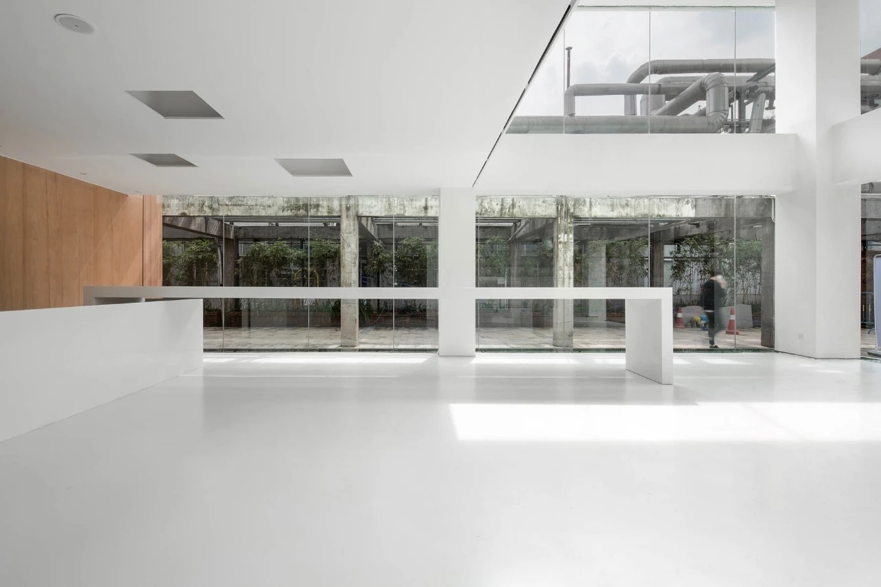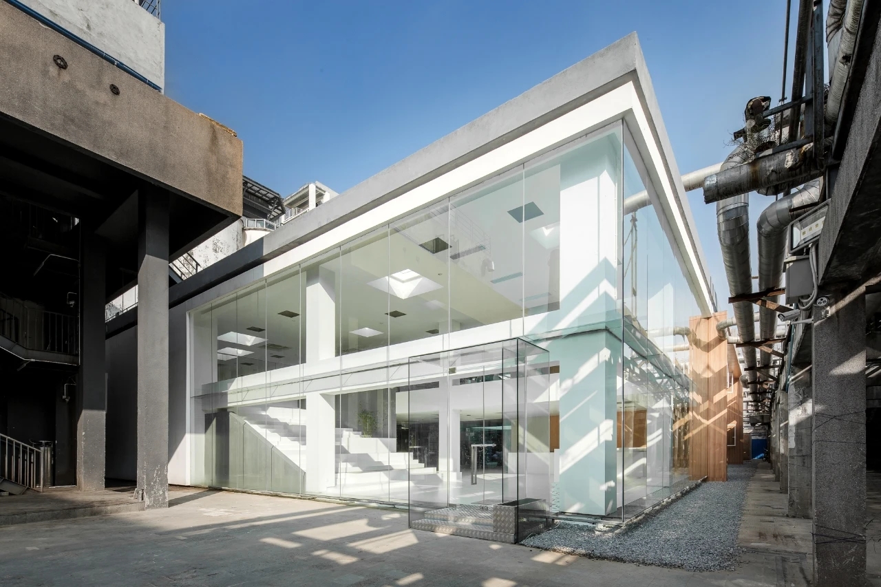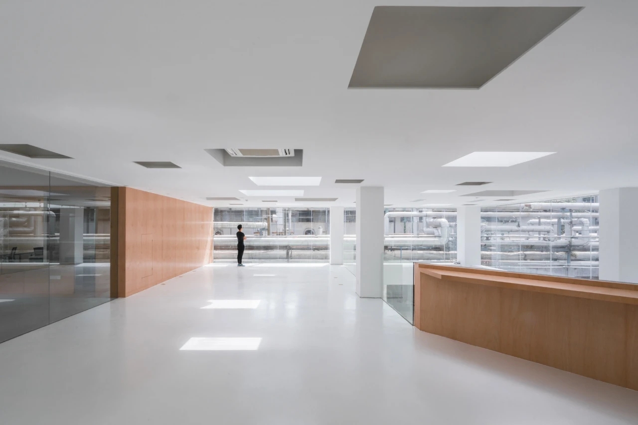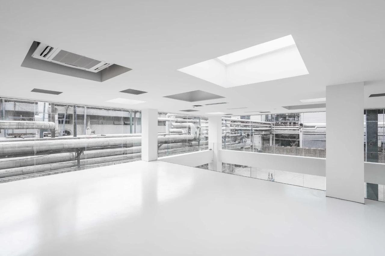 项目位于园区的中部,是一栋两层高,主体呈正方形的生产车间, 方形的四周几乎被高大的厂房包围,唯有西南角毗邻户外运输管道走廊,和外部广场连通。新植入的功能是集共享办公、健身、轻餐饮、买手店、路演讲座和艺术展示于一体的新型复合业态的综合生活馆。改造后的空间希望为人们提供新型现代社交活动空间的场所,传达新型的健康生活的理念,并通过人们的参与重新激活周边这一片区域。