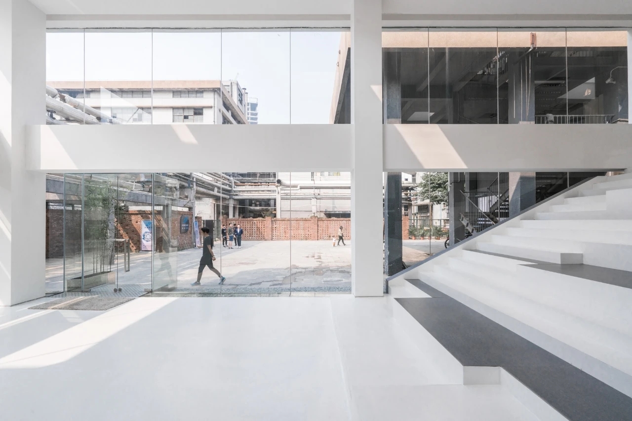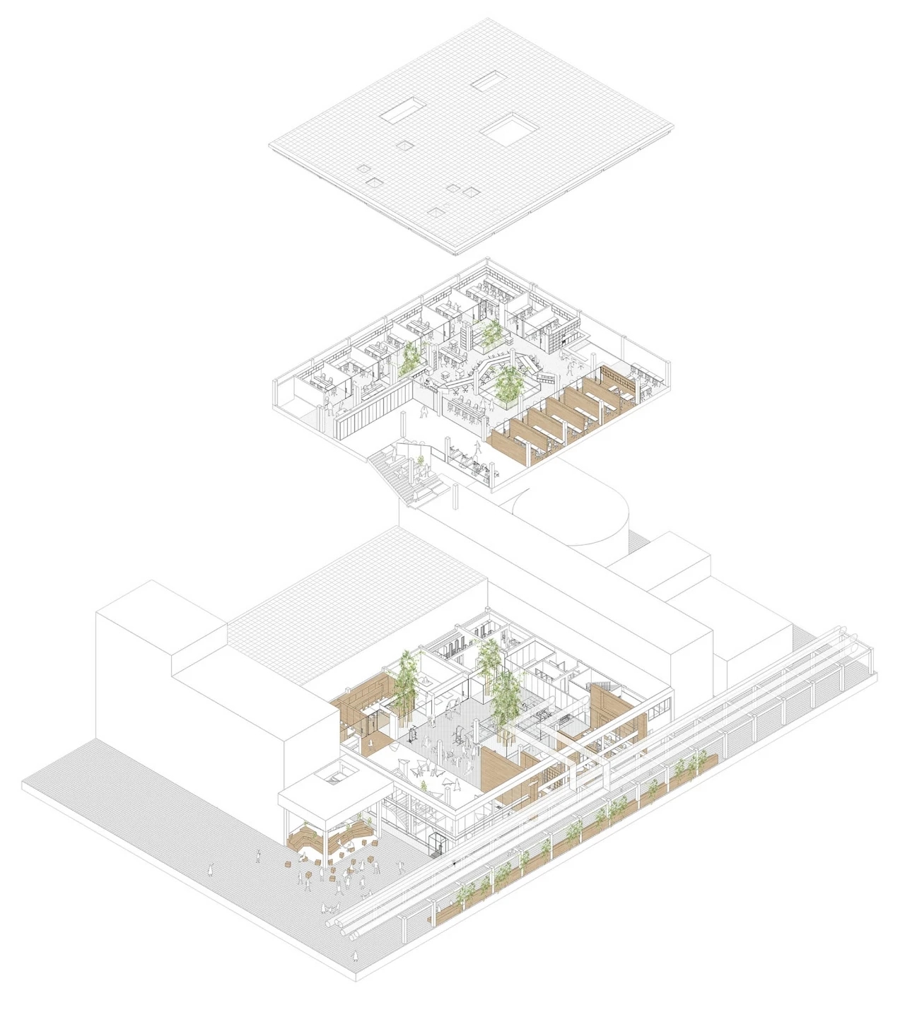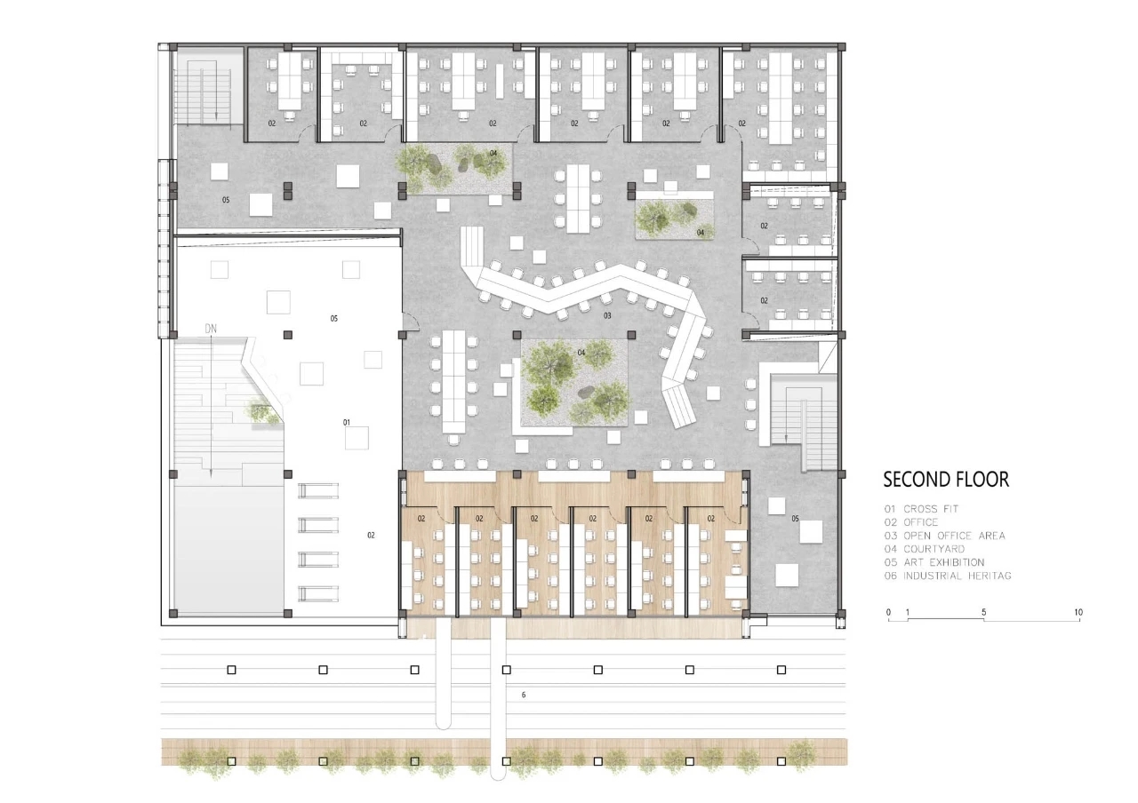 项目位于园区的中部,是一栋两层高,主体呈正方形的生产车间, 方形的四周几乎被高大的厂房包围,唯有西南角毗邻户外运输管道走廊,和外部广场连通。新植入的功能是集共享办公、健身、轻餐饮、买手店、路演讲座和艺术展示于一体的新型复合业态的综合生活馆。改造后的空间希望为人们提供新型现代社交活动空间的场所,传达新型的健康生活的理念,并通过人们的参与重新激活周边这一片区域。
