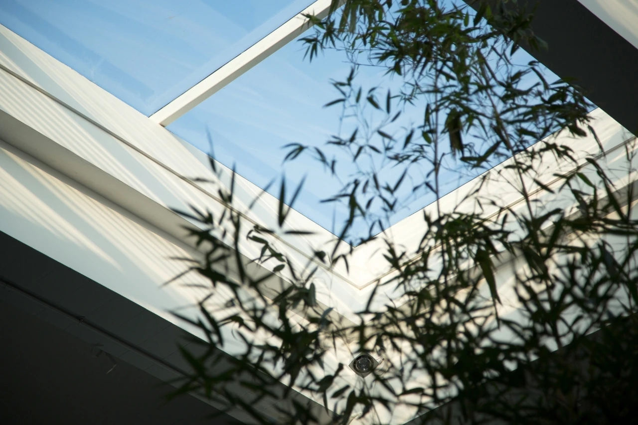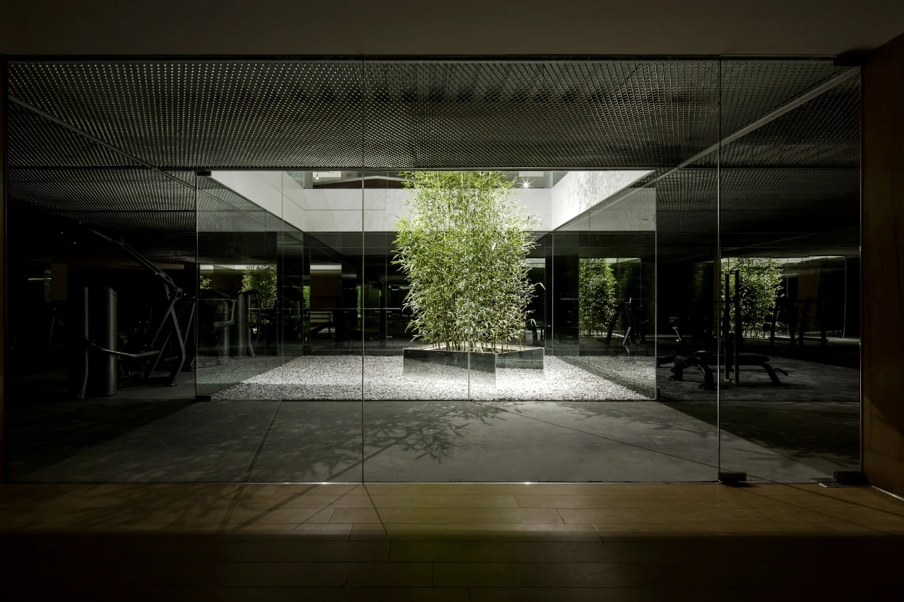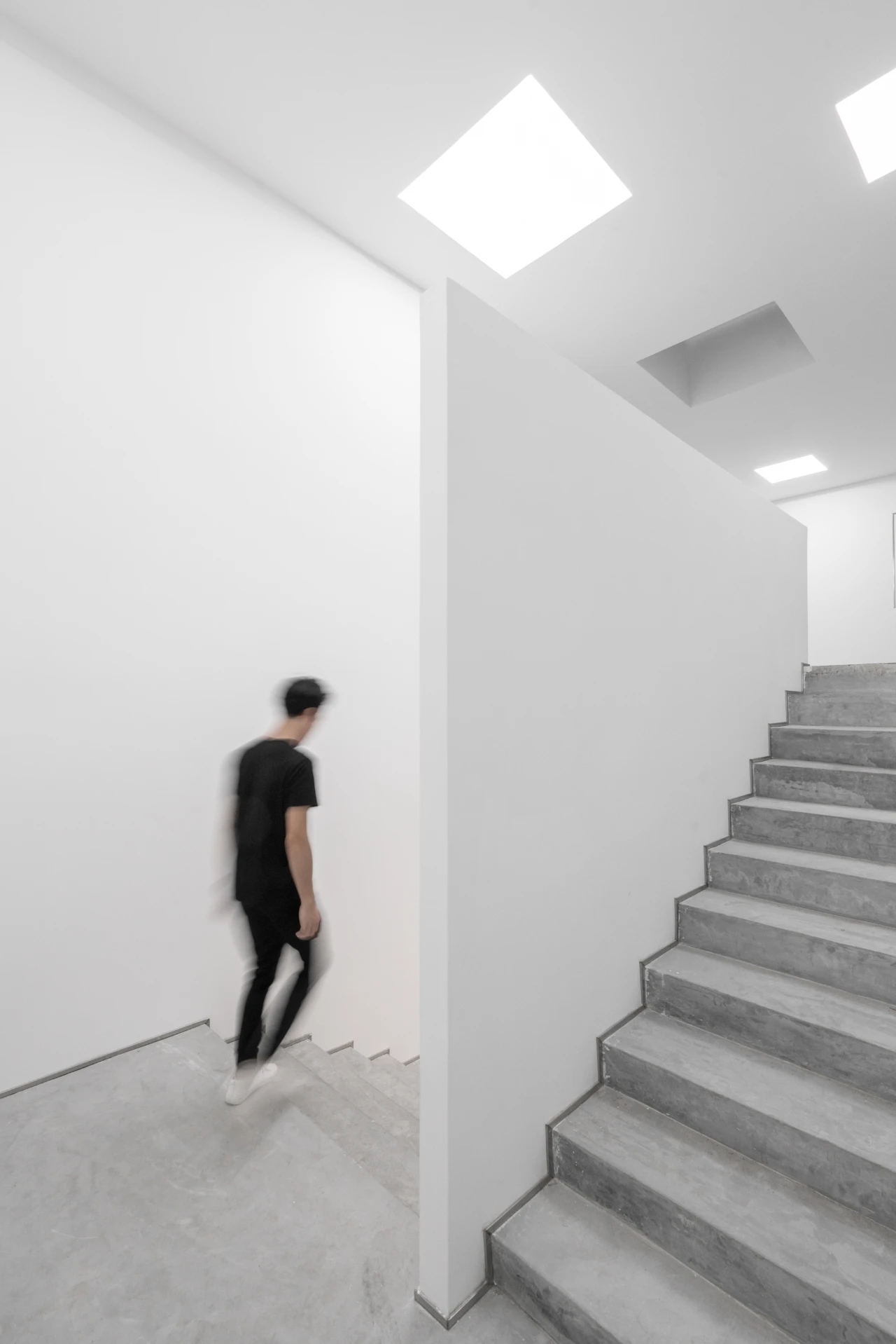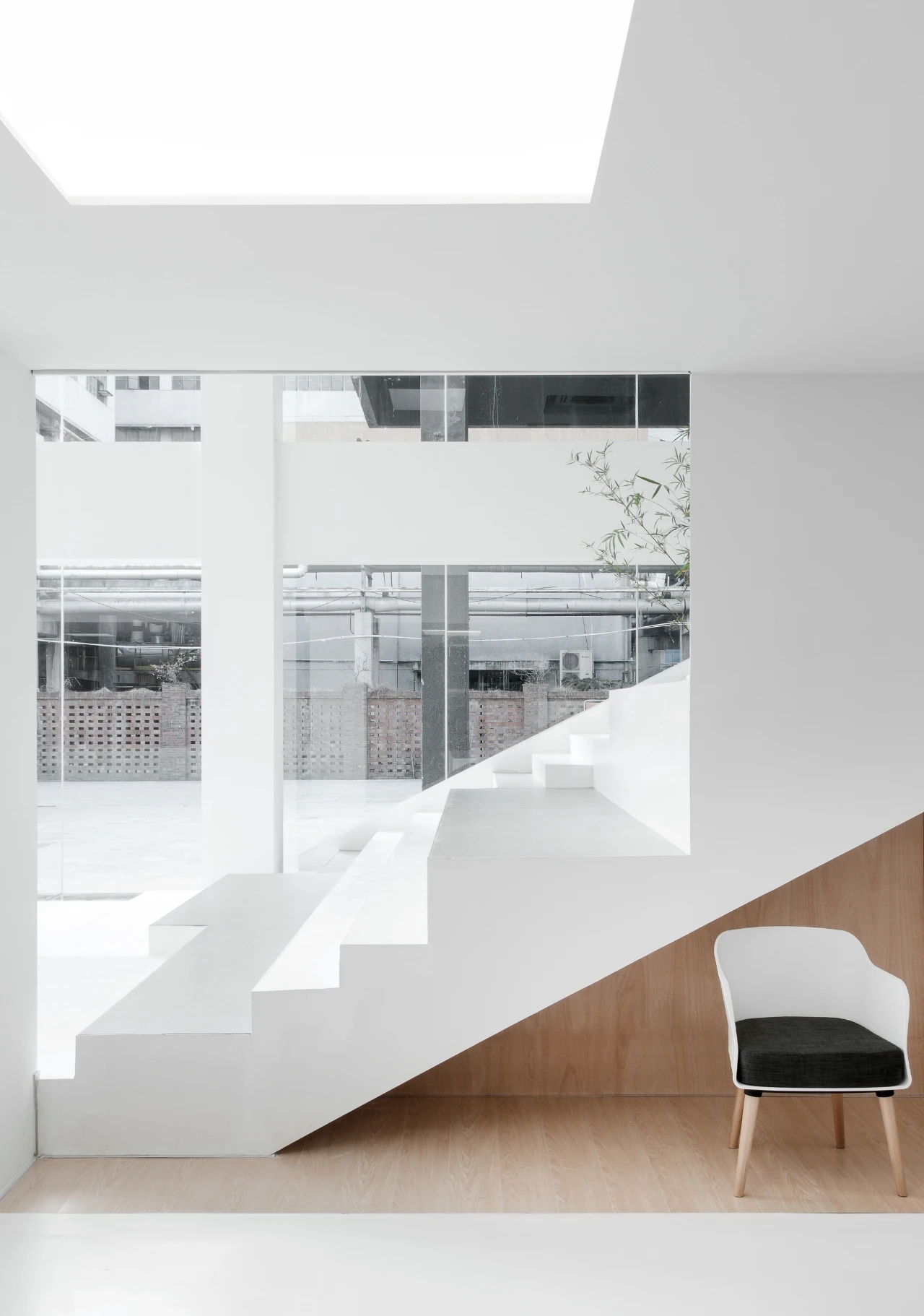 庭院中碎石和不锈钢镜面的景观装置的花池延展了外部的景观切片,亦创造了抽象的园林景观,使每一处场所的功能都和庭院景观相联动;通过镜子的使用,让内外的景观在空间内不断地反射渗透与延展,使原来深入的更为内向的空间呈现出开放性的状态。同时通过方形的自然天窗和人工漫反射光线的交叠使用,使整个建筑空间成为一个通过光的变化呈现出戏剧性的叙事空间。