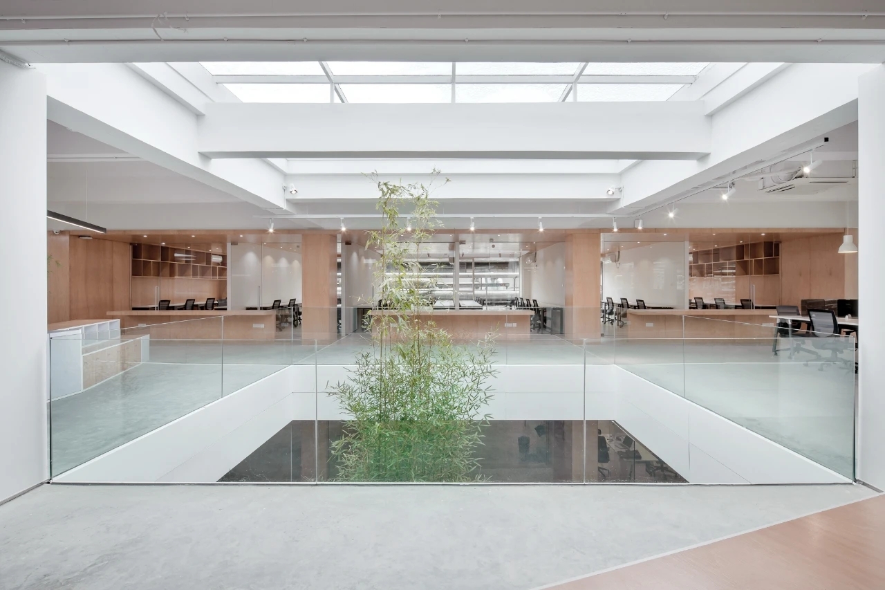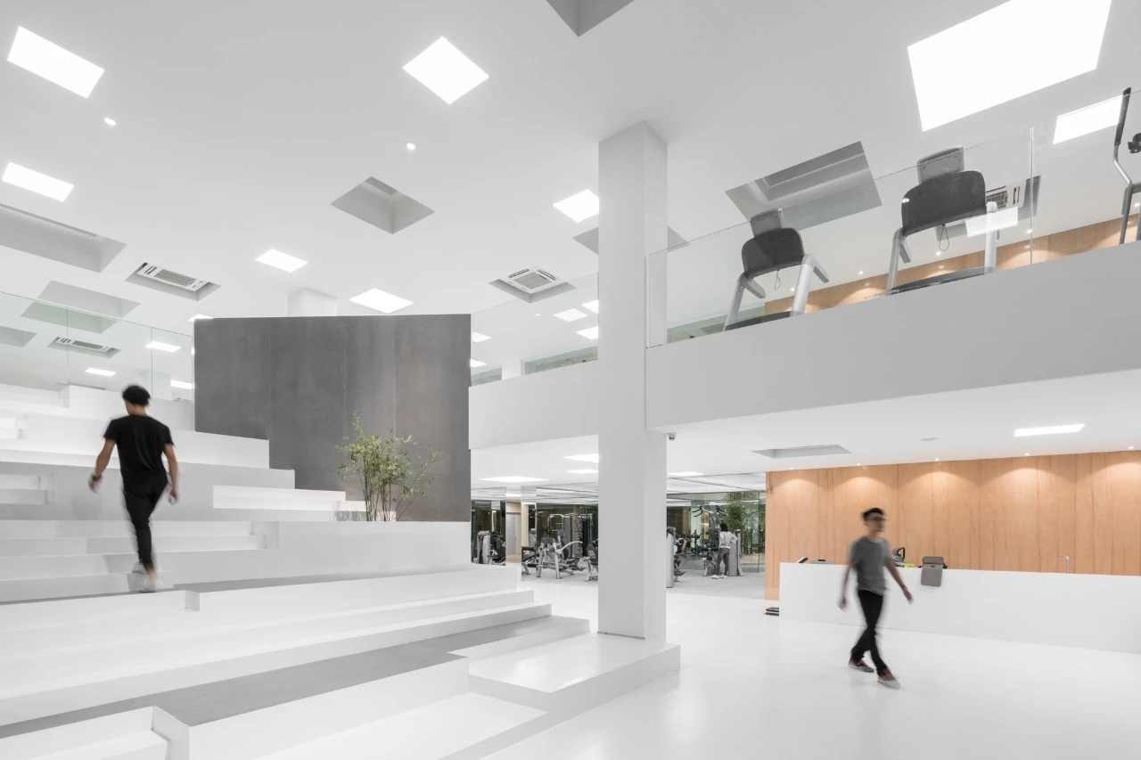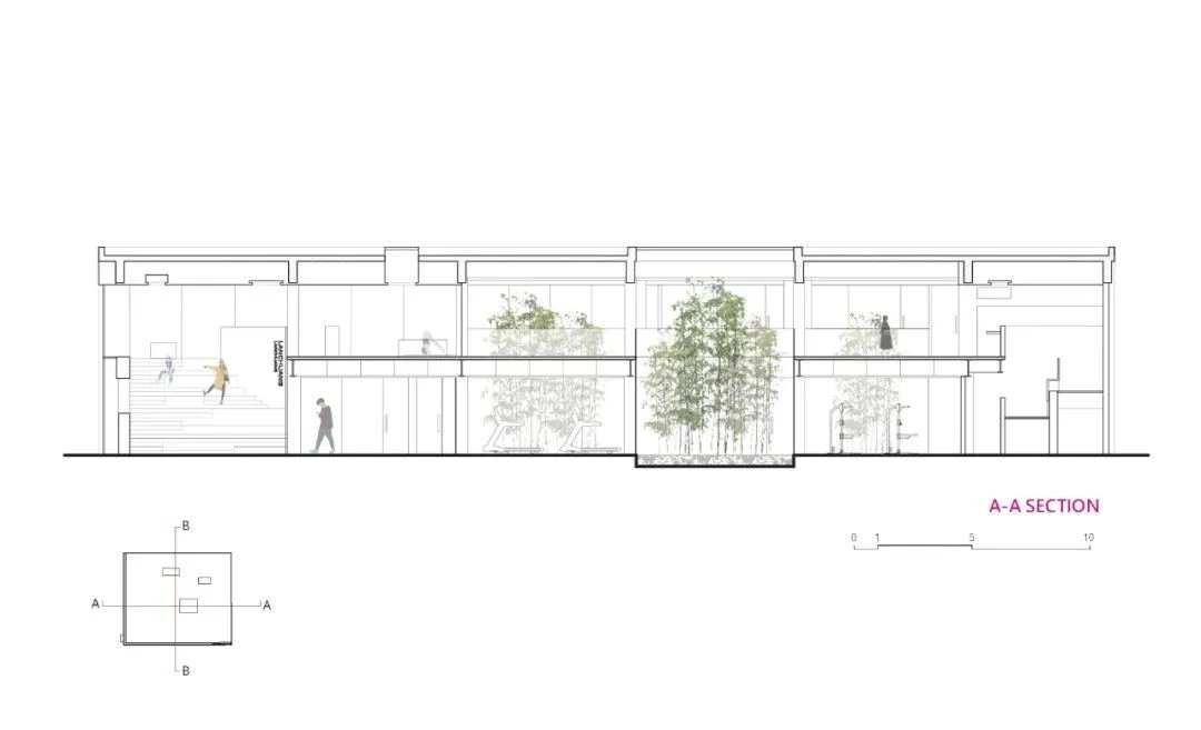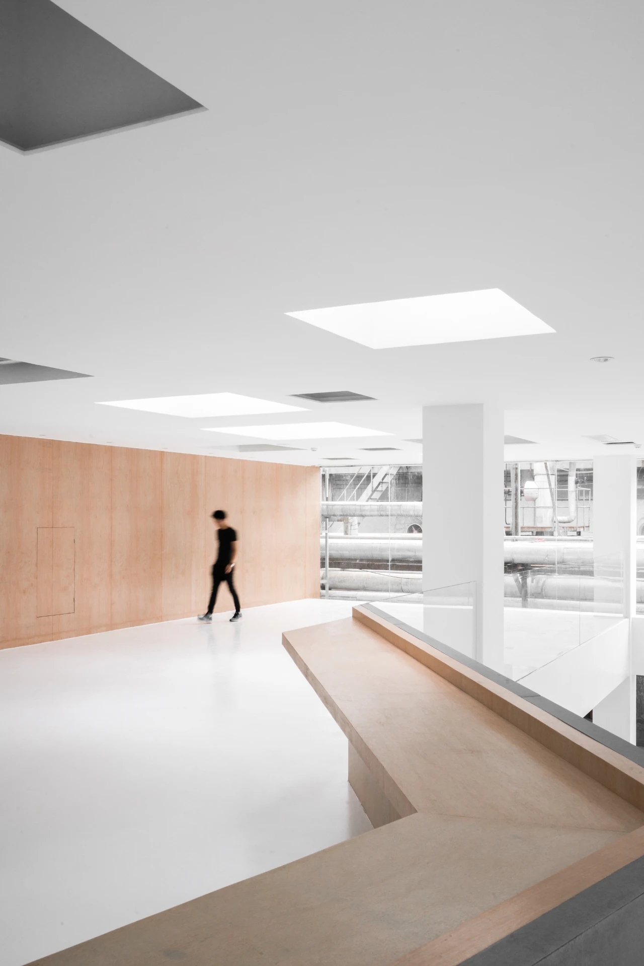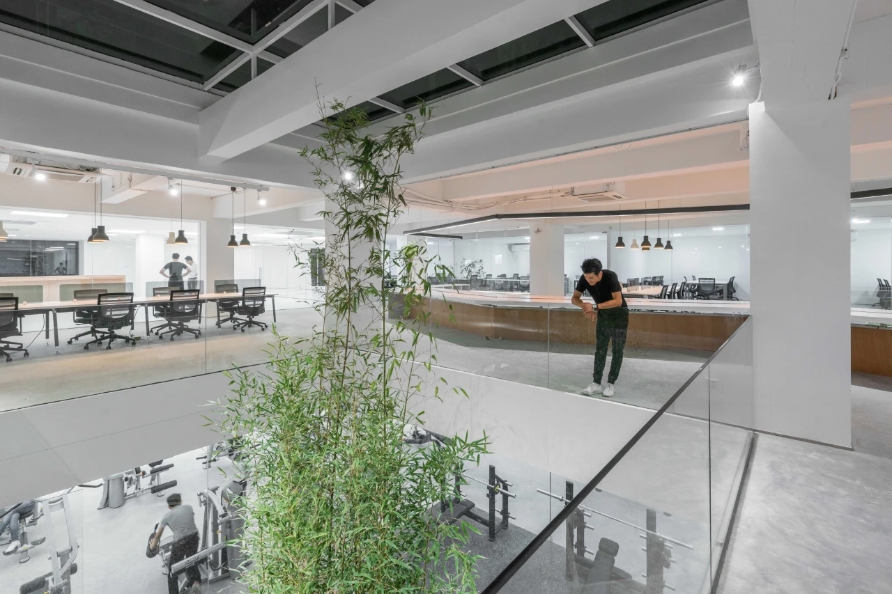 视线随着人在空间中的运动,从外部工业遗址进而转向内部竹林庭院,光线也由侧面的大落地窗转向庭院的顶部采光天窗。三个庭院将内部的活动场景串联起来,首层的健身,沙拉吧,咖啡吧和展厅,二层的共享办公和运动区,围绕其自由展开,南侧被植入的木盒子是独立的办公和买手店,通过大面积的玻璃,和两侧木制墙面将外部遗址风景框入室内。
