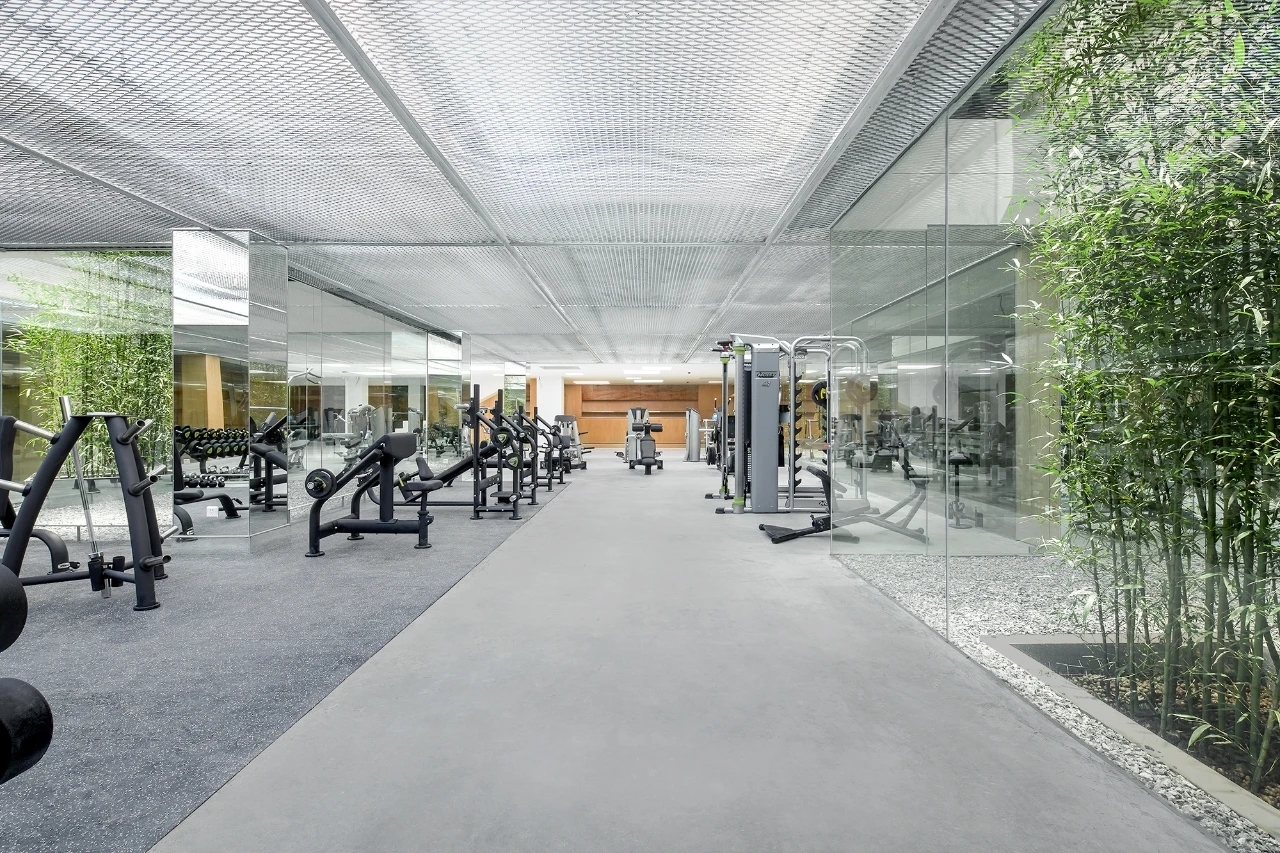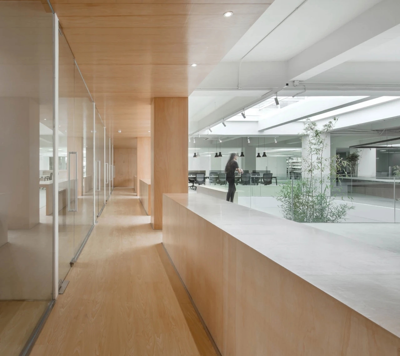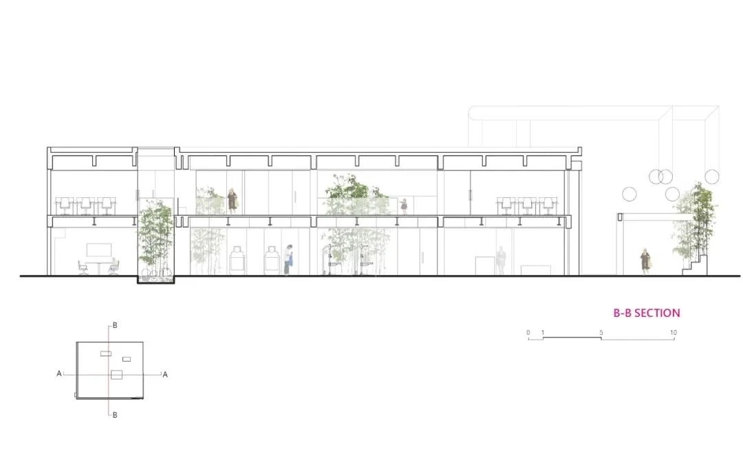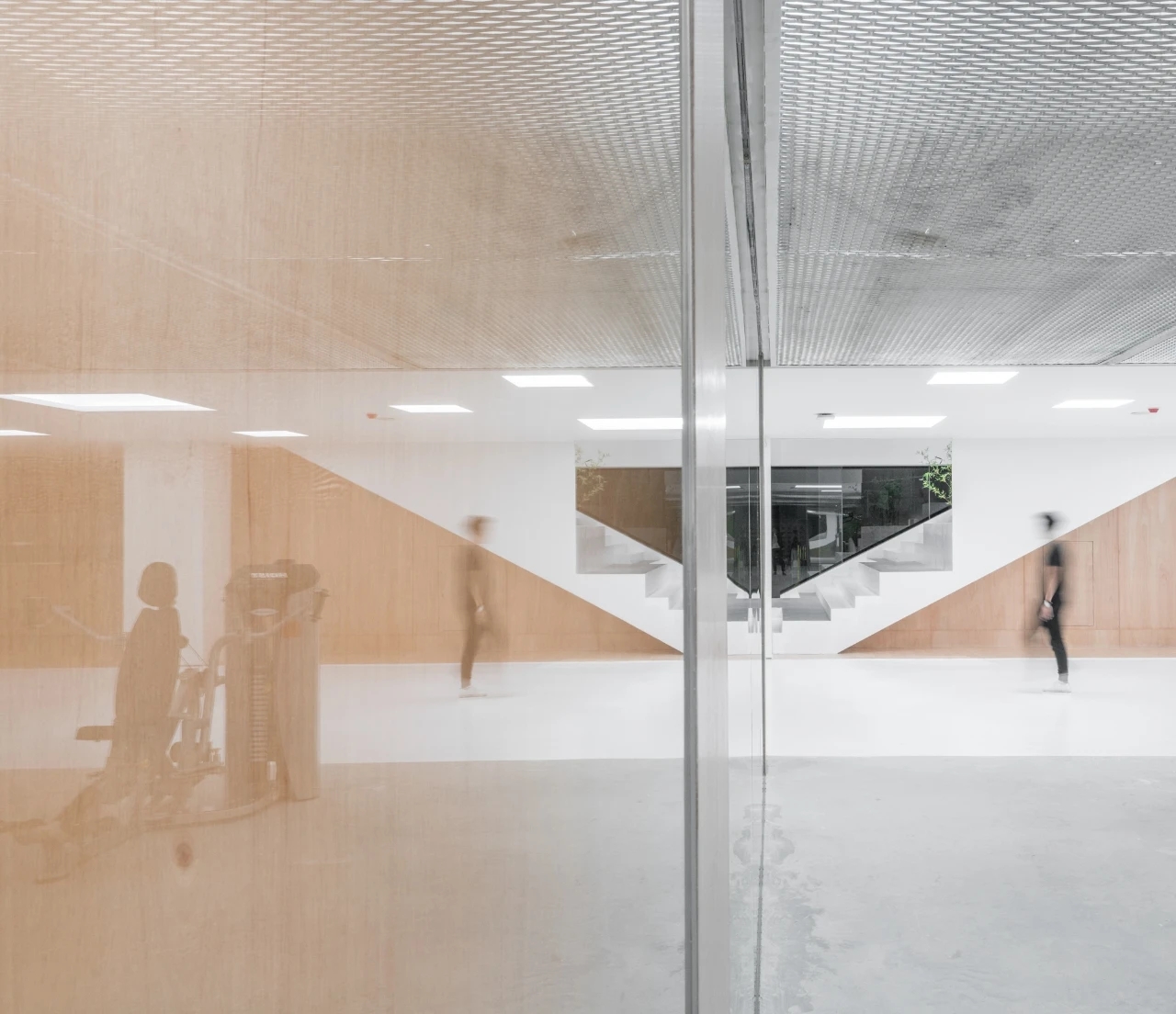 视线随着人在空间中的运动,从外部工业遗址进而转向内部竹林庭院,光线也由侧面的大落地窗转向庭院的顶部采光天窗。三个庭院将内部的活动场景串联起来,首层的健身,沙拉吧,咖啡吧和展厅,二层的共享办公和运动区,围绕其自由展开,南侧被植入的木盒子是独立的办公和买手店,通过大面积的玻璃,和两侧木制墙面将外部遗址风景框入室内。