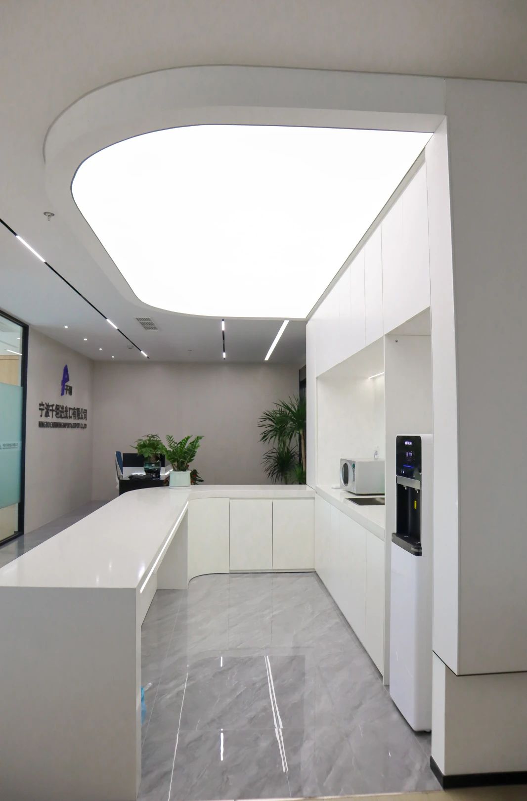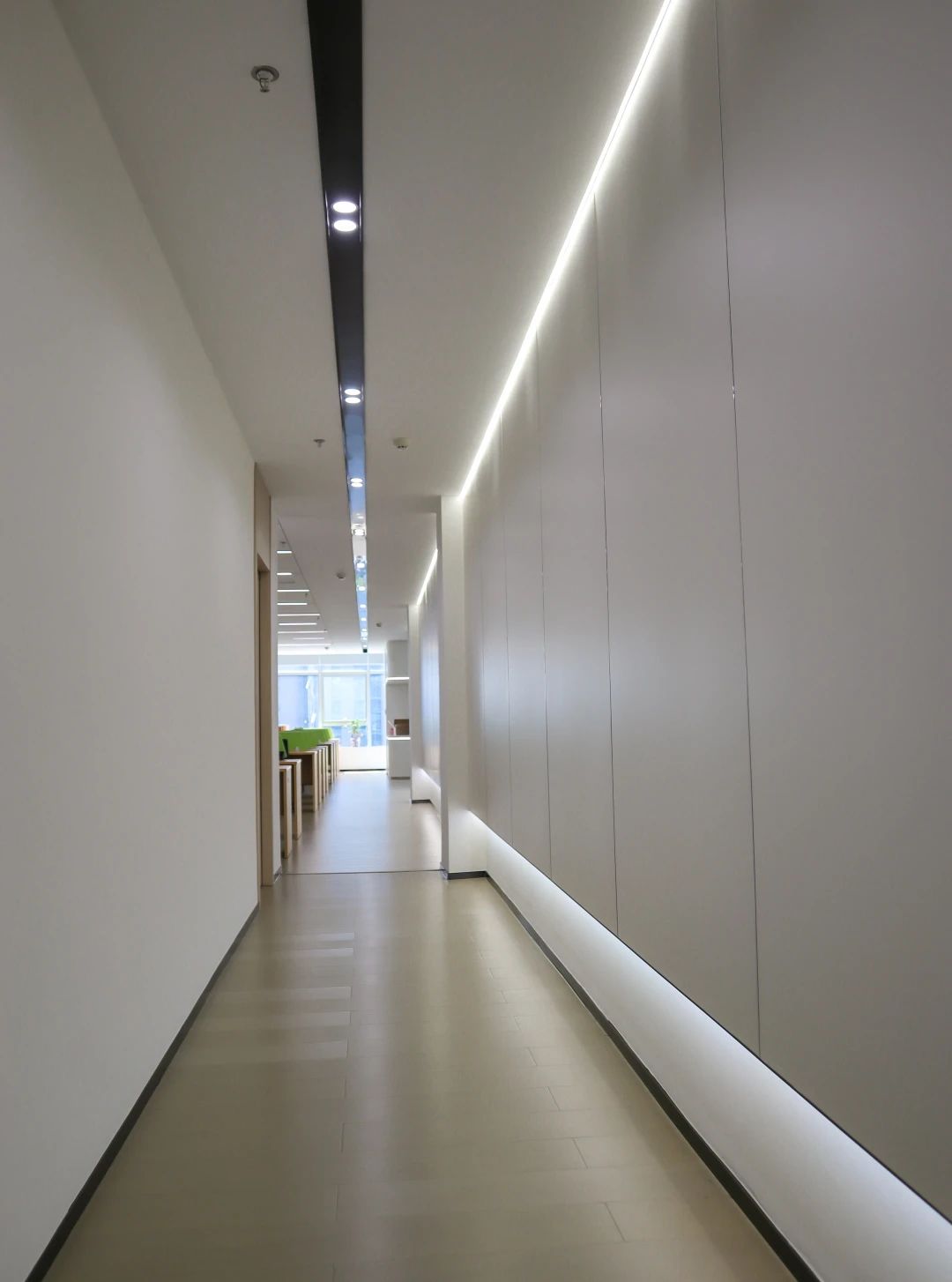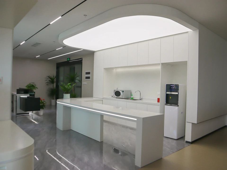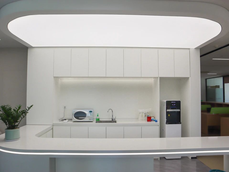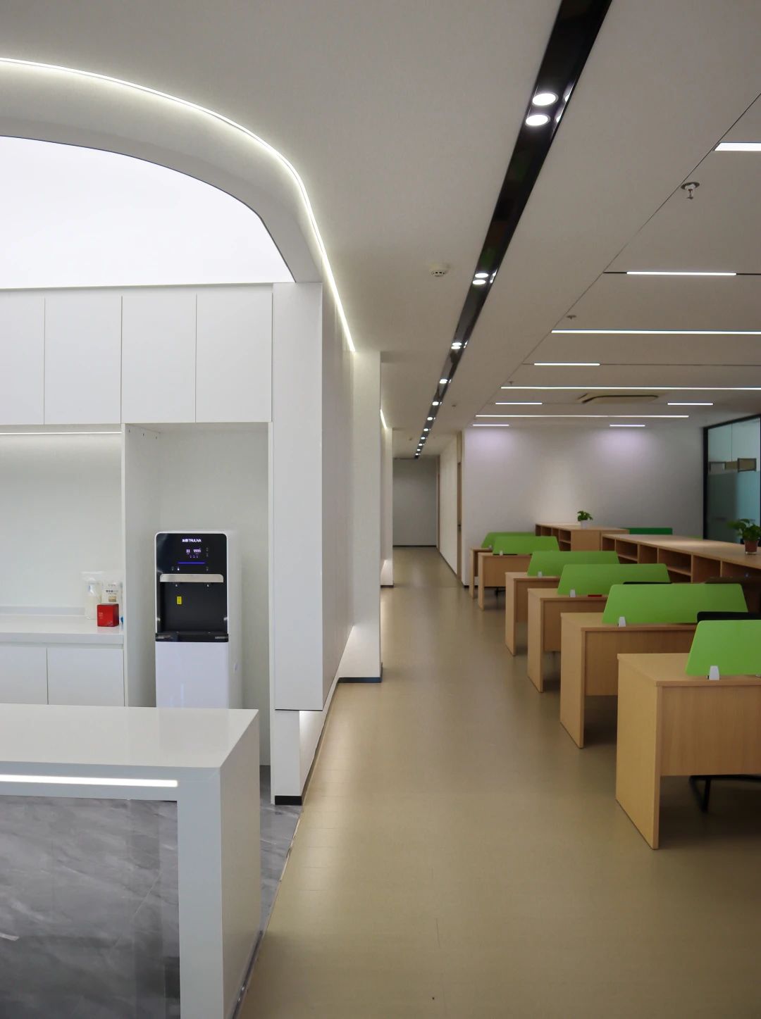 吧台是前厅与办公区的过渡,由弧形灯膜形成顶地呼应,增强空间吸引力,形成空间亮点,转折以上下点缀了灯带的形式延申,点亮原本枯燥的长过道!Tags:现代简约、清新时尚、柔和轻巧、灵活高效、开放通透