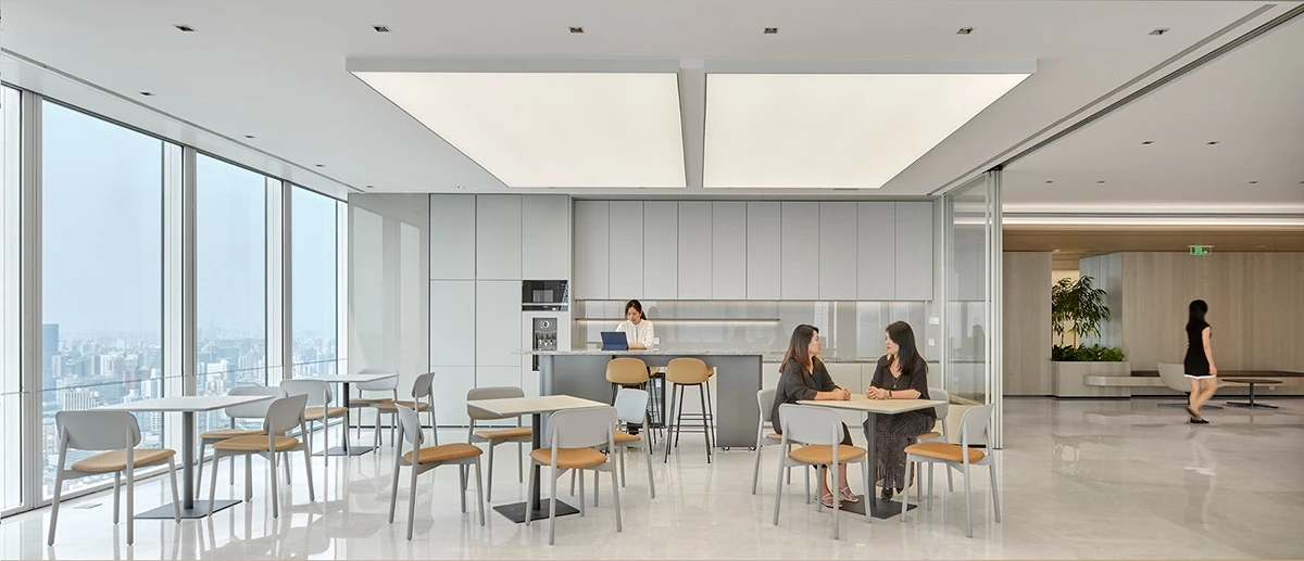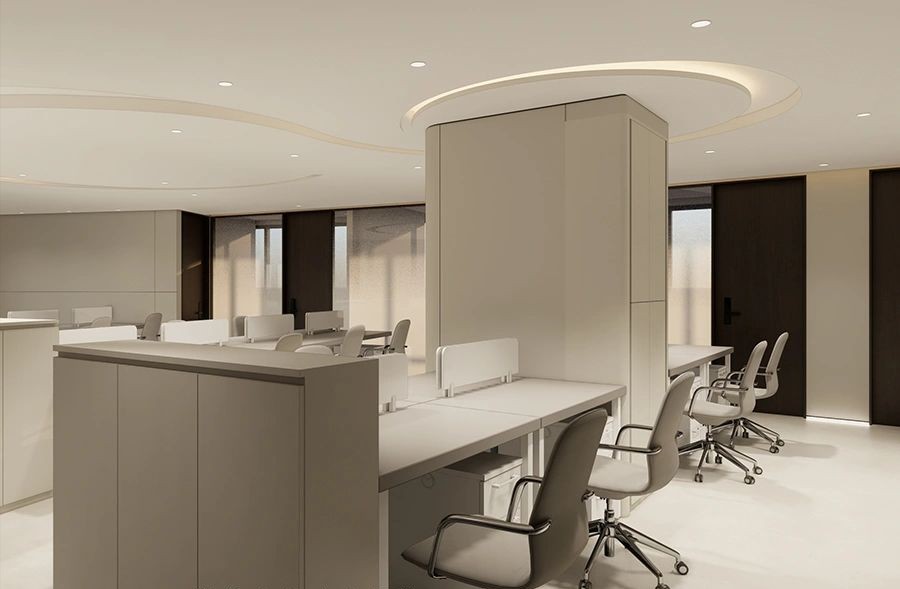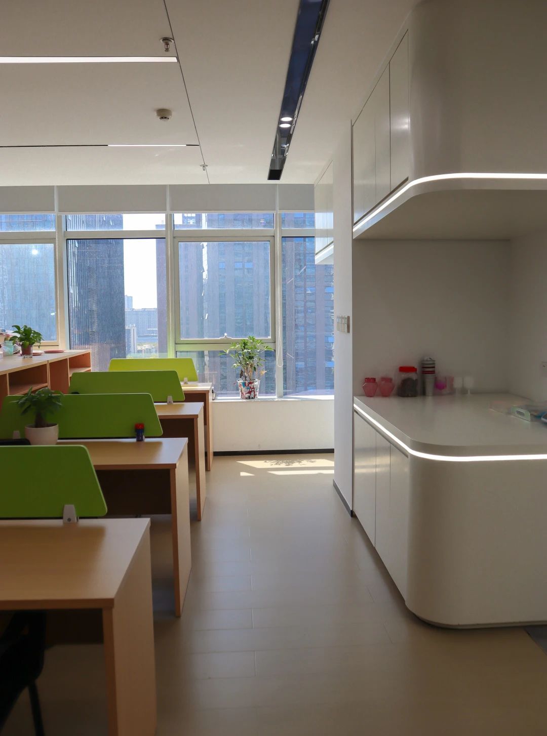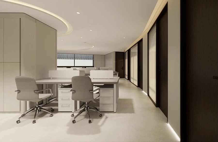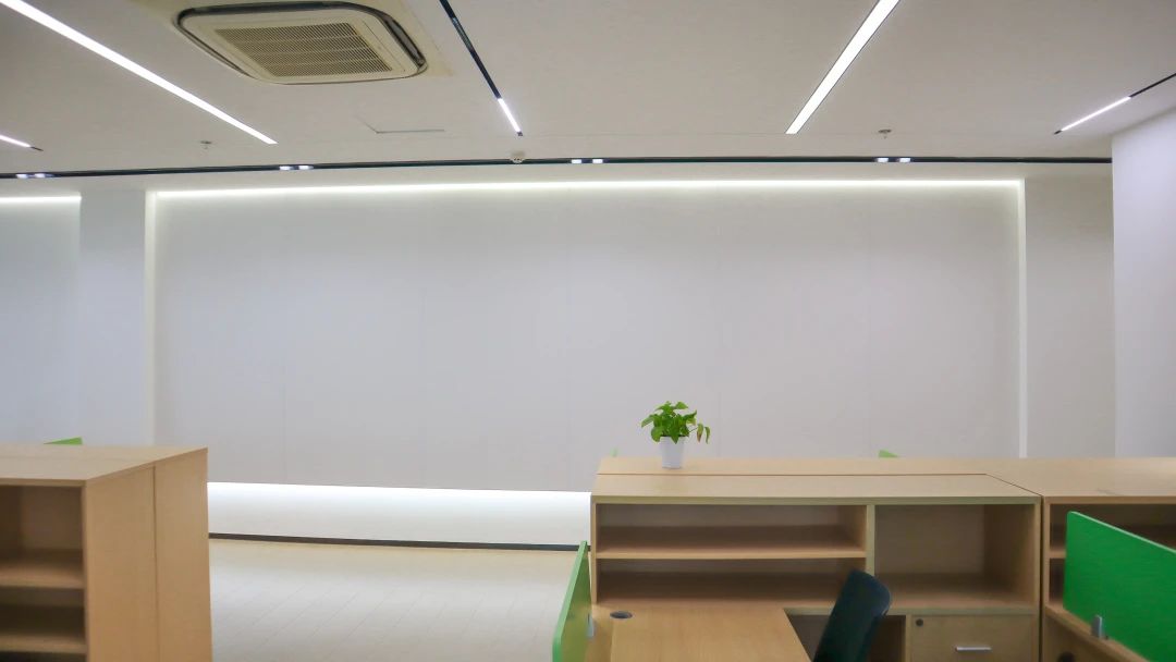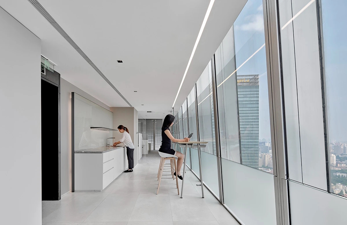 吧台是前厅与办公区的过渡,由弧形灯膜形成顶地呼应,增强空间吸引力,形成空间亮点,转折以上下点缀了灯带的形式延申,点亮原本枯燥的长过道!Tags:现代简约、清新时尚、柔和轻巧、灵活高效、开放通透