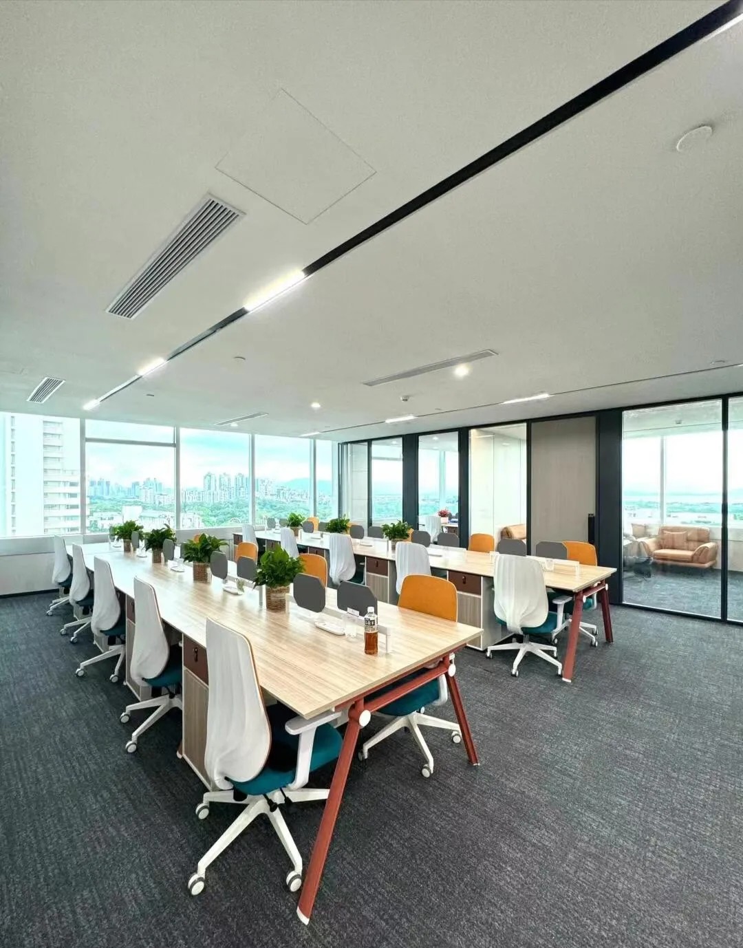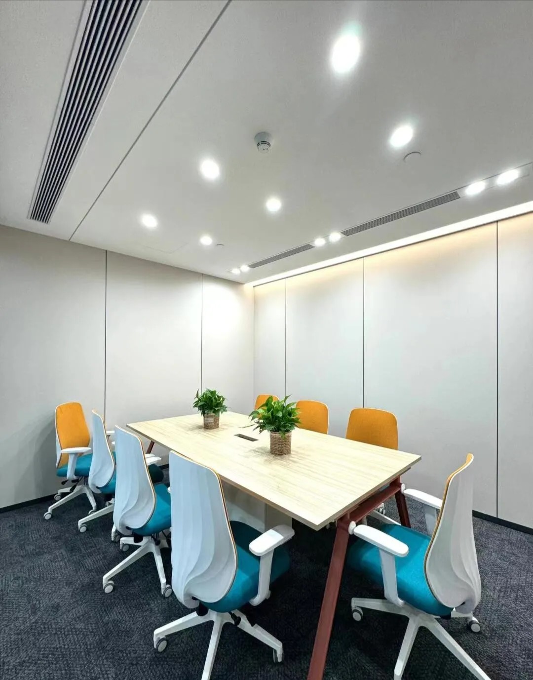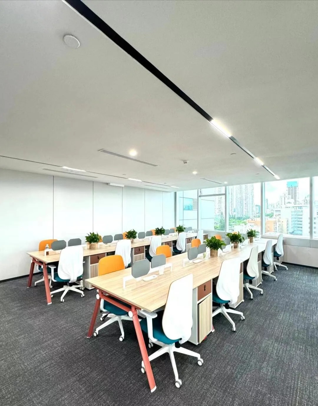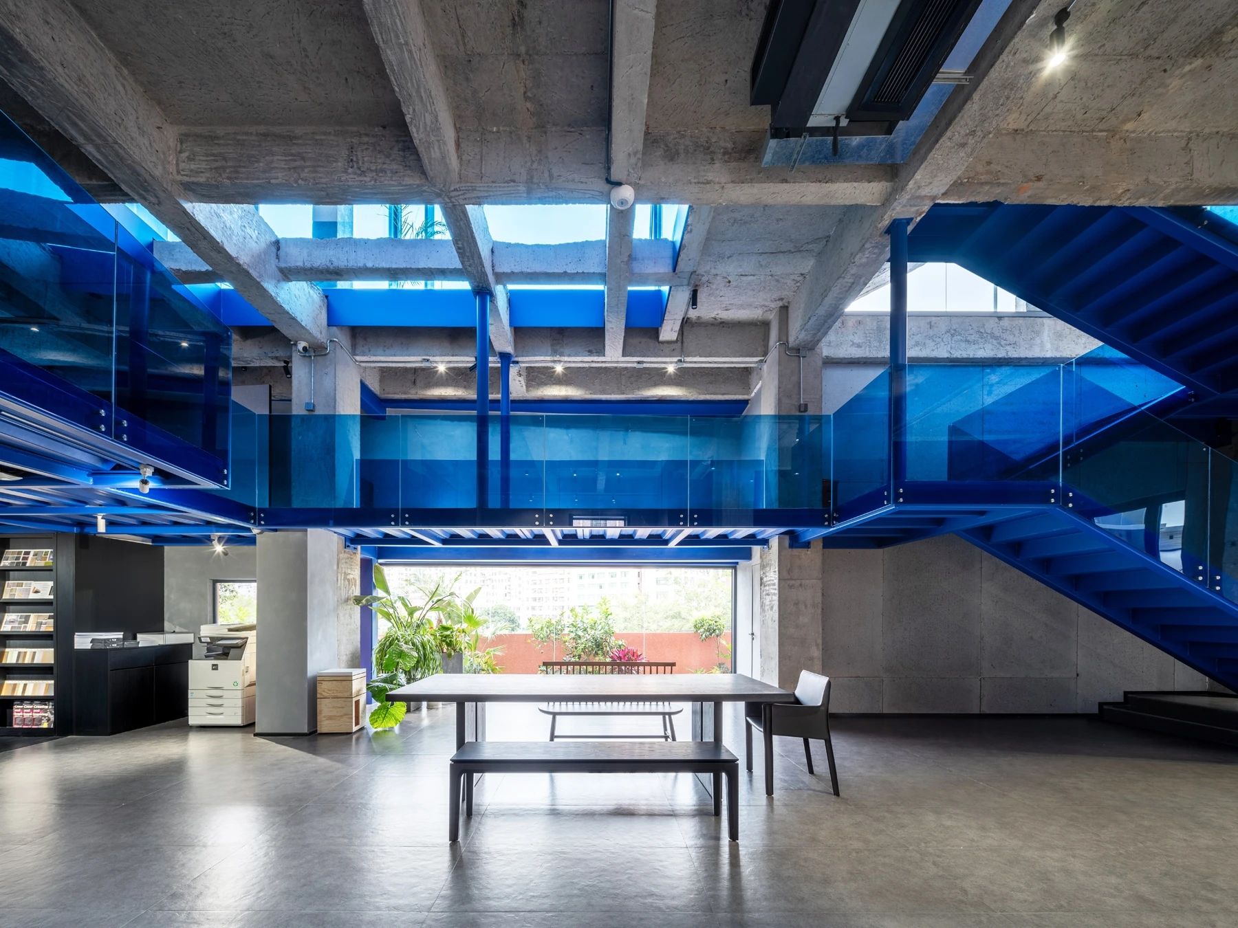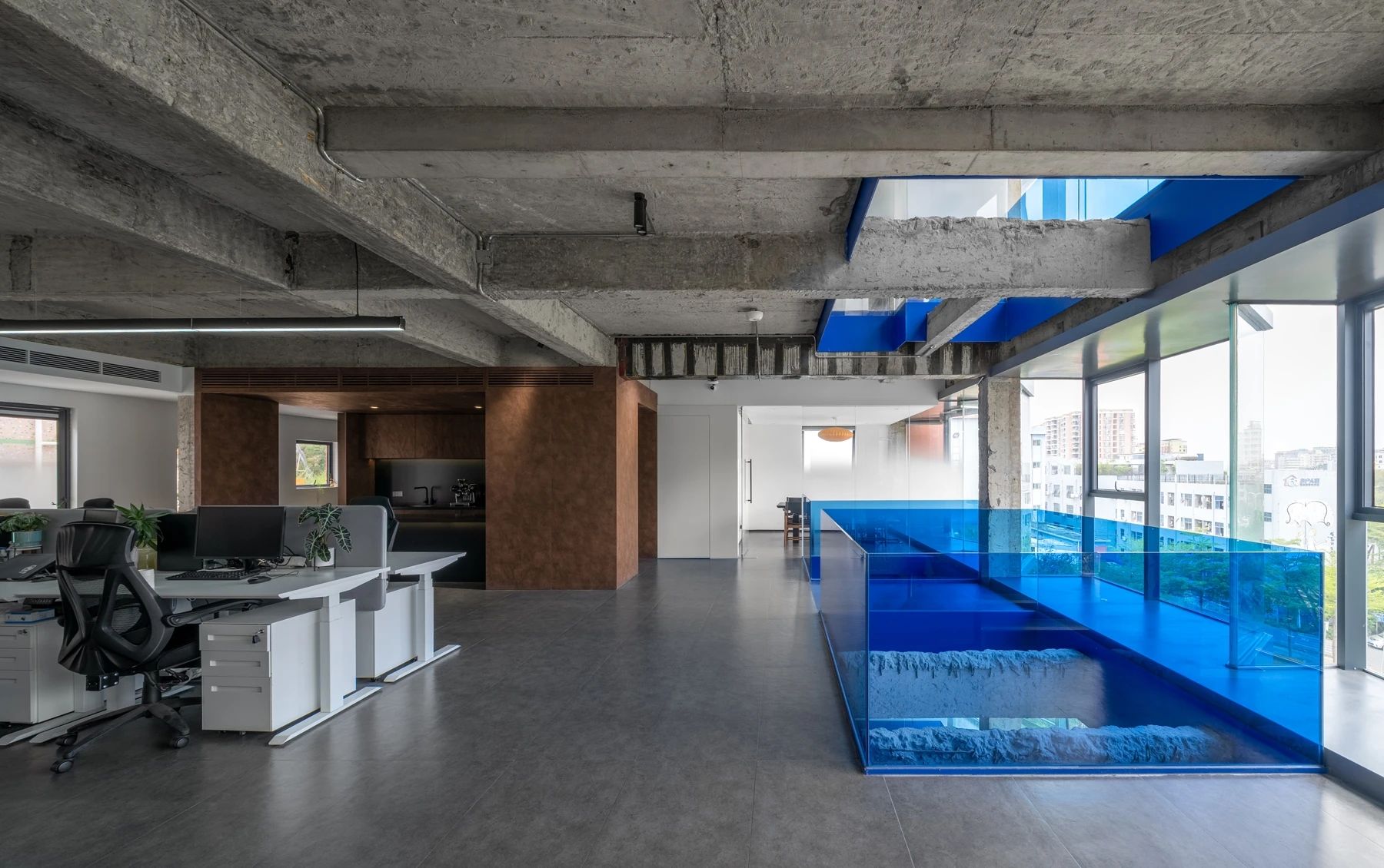 办公区域为增加层高做局部不吊顶处理,整体喷白弱化管道杂乱,蓝色的隔断可以提升空间活力,长期在密闭的空间办公,一抹蓝色可以缓解视觉疲劳,同时增加环境的装饰性。