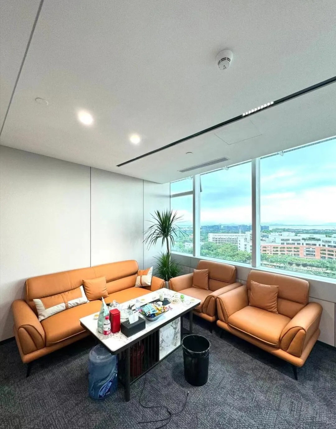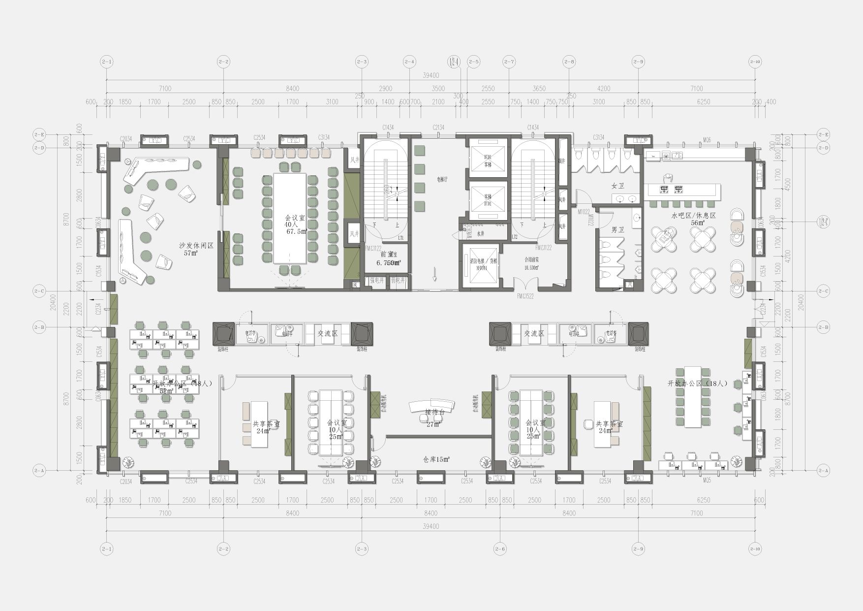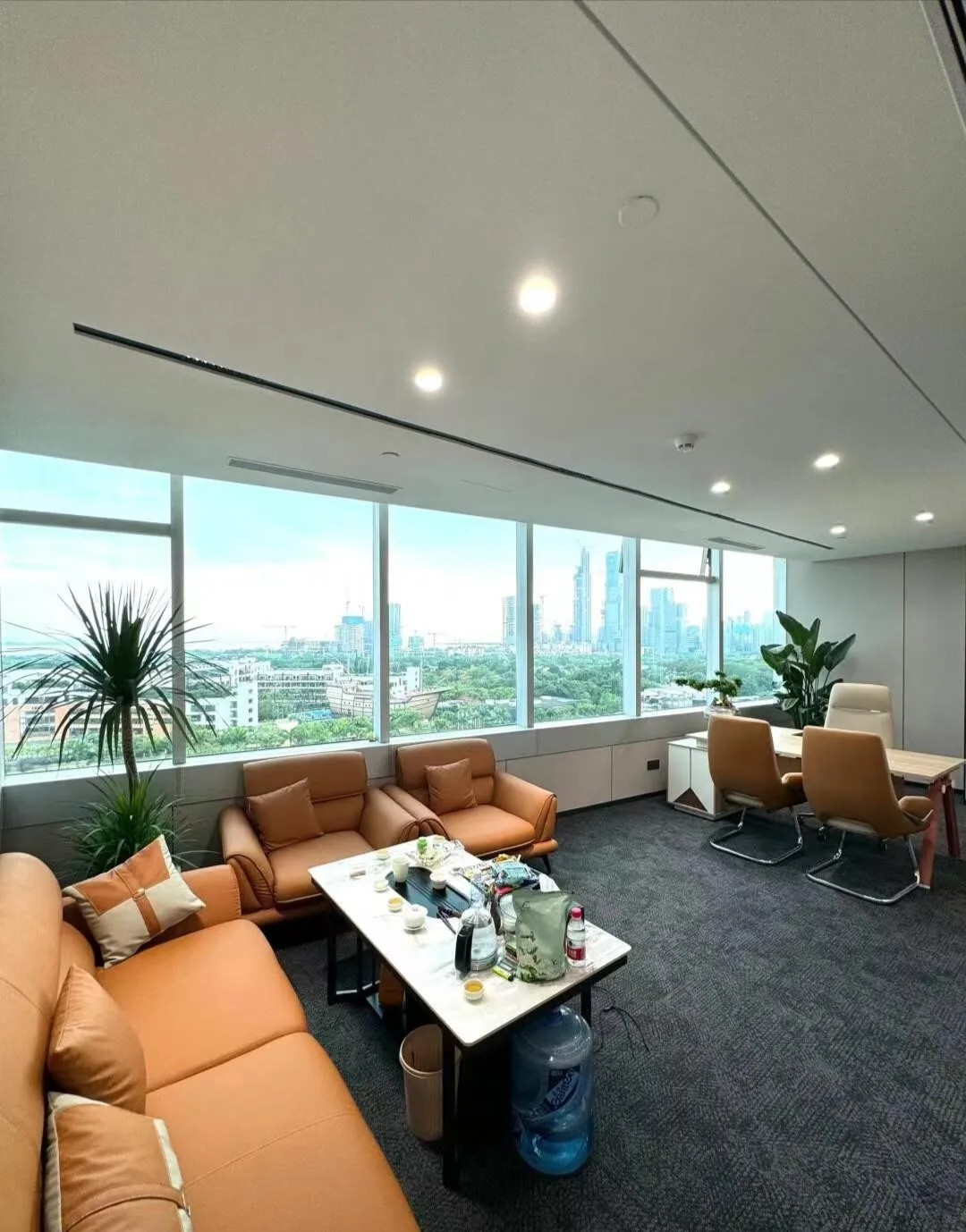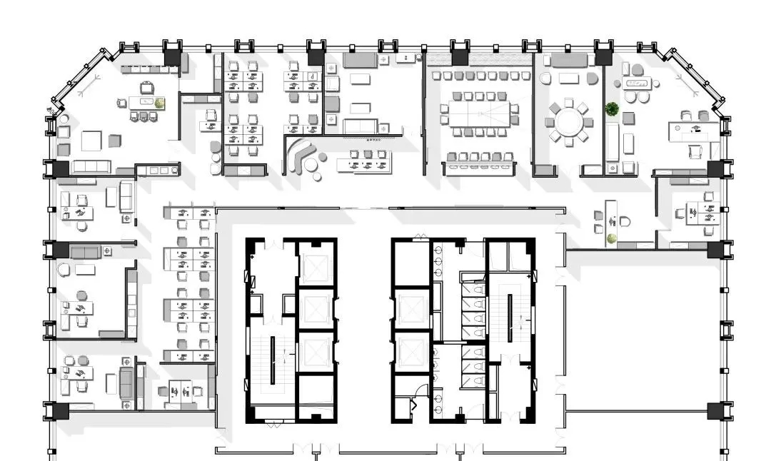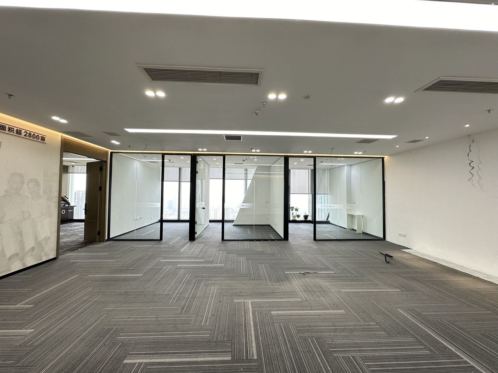 办公区域为增加层高做局部不吊顶处理,整体喷白弱化管道杂乱,蓝色的隔断可以提升空间活力,长期在密闭的空间办公,一抹蓝色可以缓解视觉疲劳,同时增加环境的装饰性。