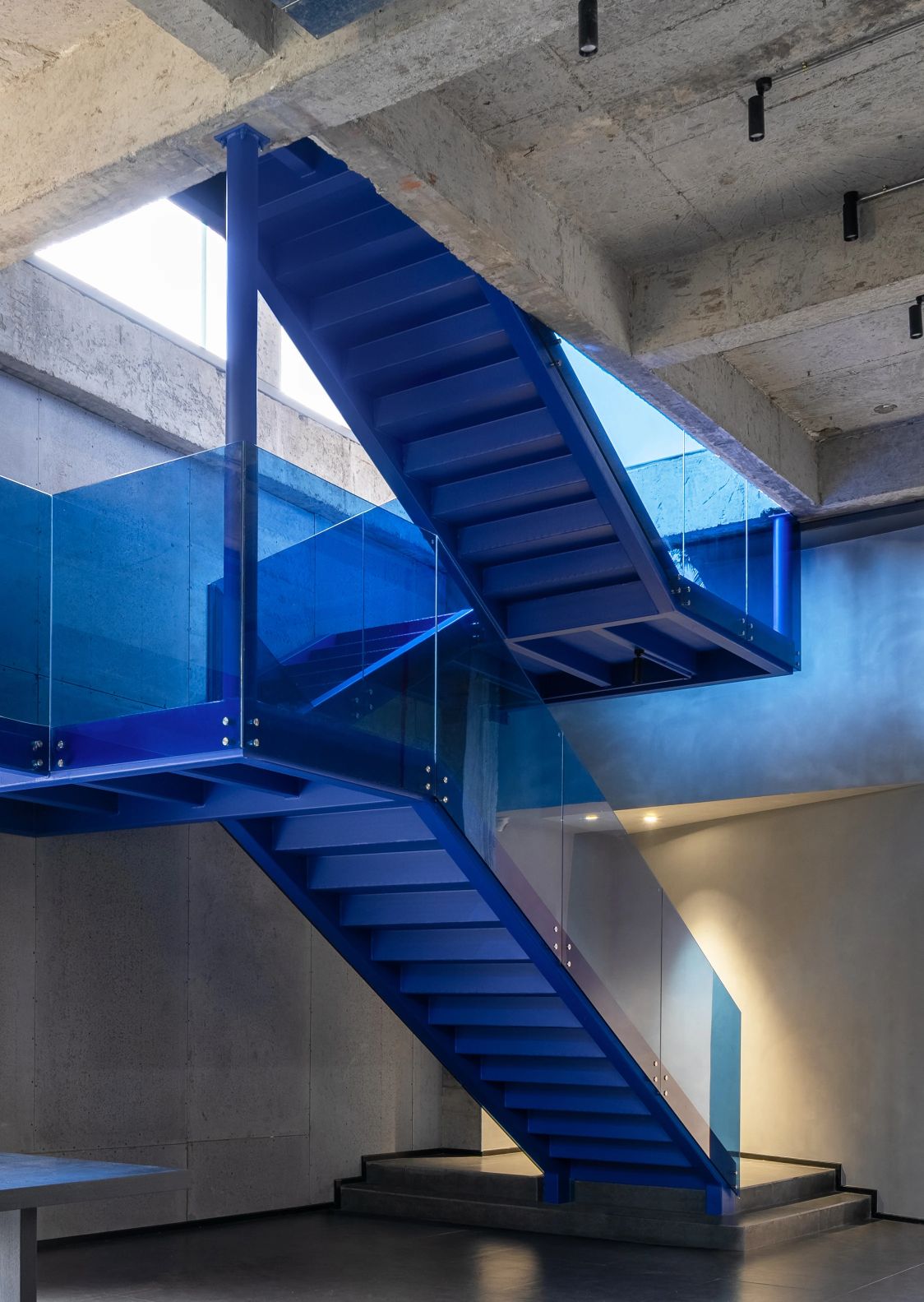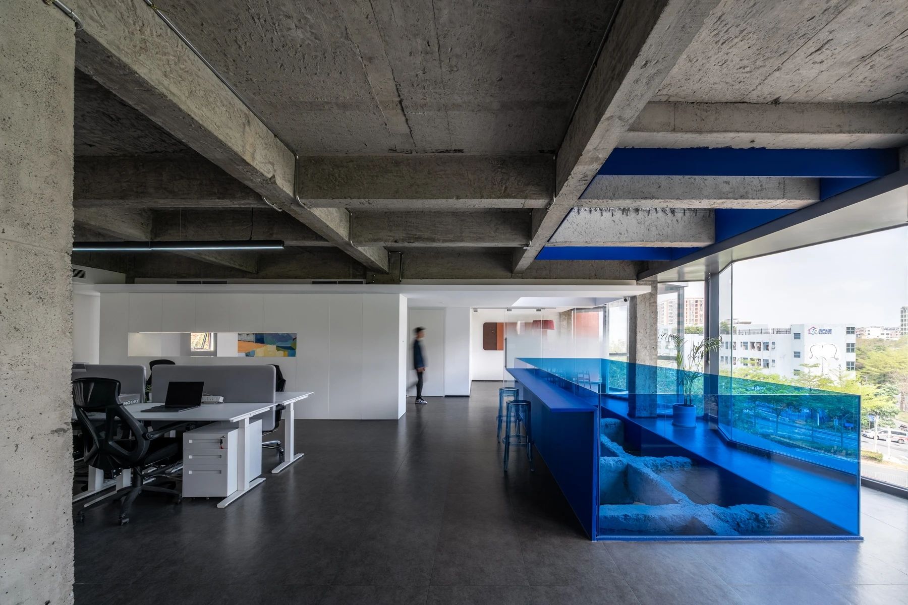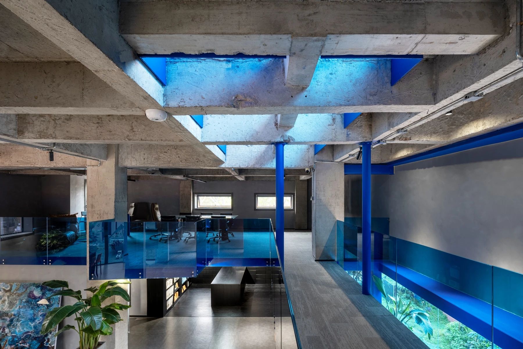 在进入会议室的走廊上,鲜明的蓝色点缀着人们日常忙碌的空间。大面积的电视屏幕在使用上增强了感官效果。覆蓝膜玻璃,呼应设计主题,视觉上提升整个空间,同时与办公区蓝色呼应,利用窗洞做休息座位,成为不错的观影区。
