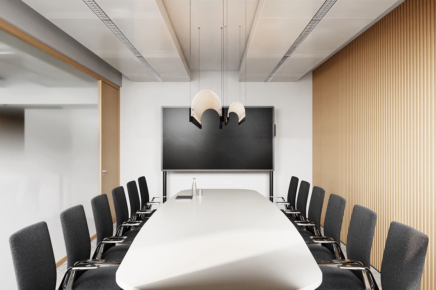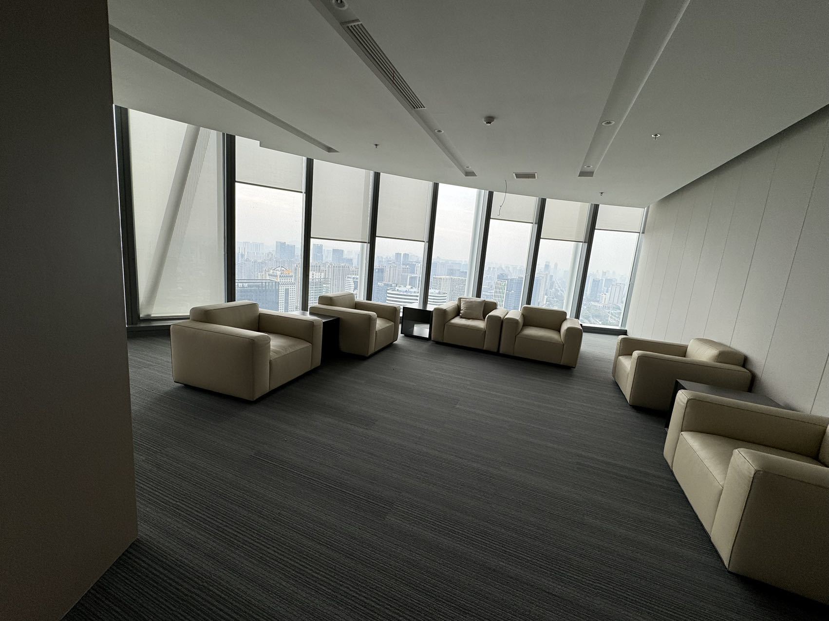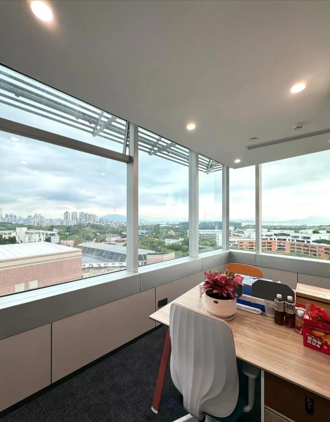 在进入会议室的走廊上,鲜明的蓝色点缀着人们日常忙碌的空间。大面积的电视屏幕在使用上增强了感官效果。覆蓝膜玻璃,呼应设计主题,视觉上提升整个空间,同时与办公区蓝色呼应,利用窗洞做休息座位,成为不错的观影区。