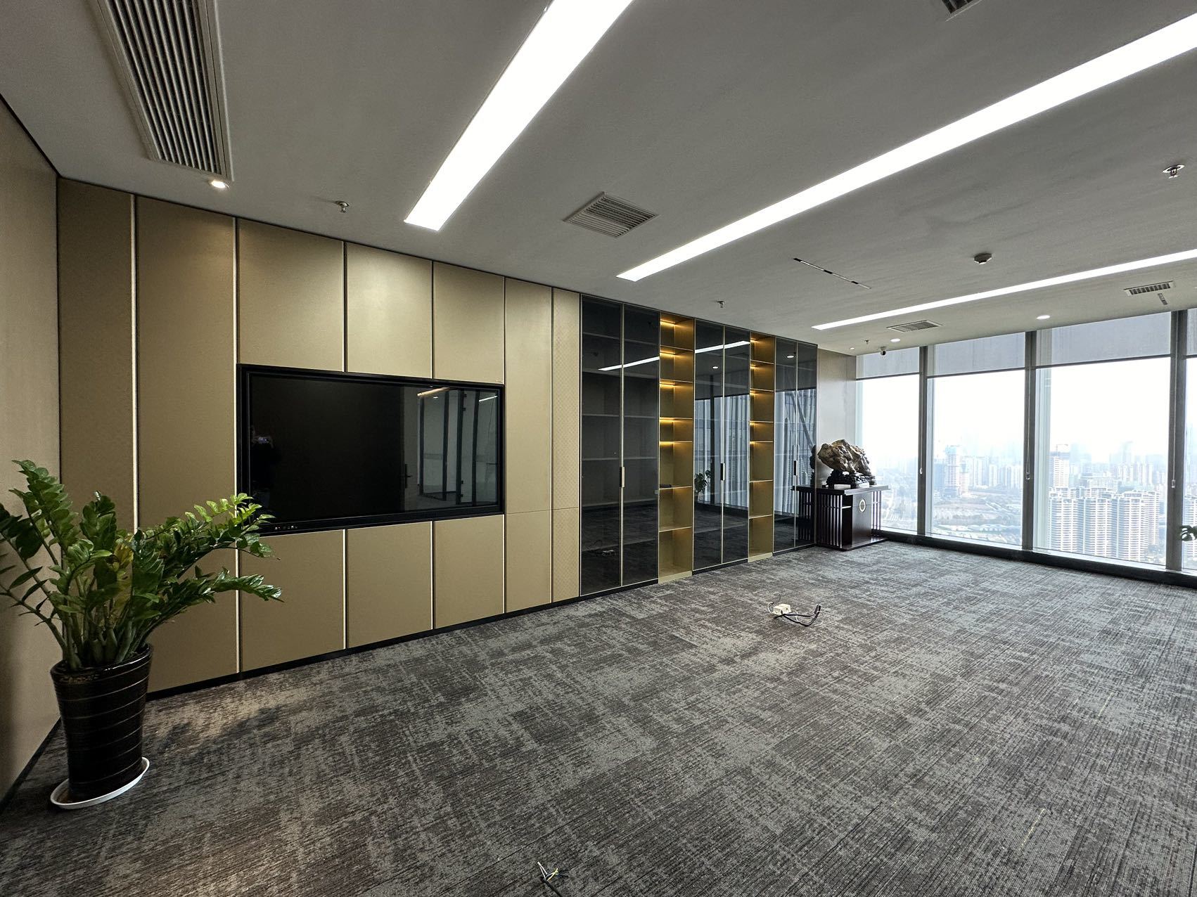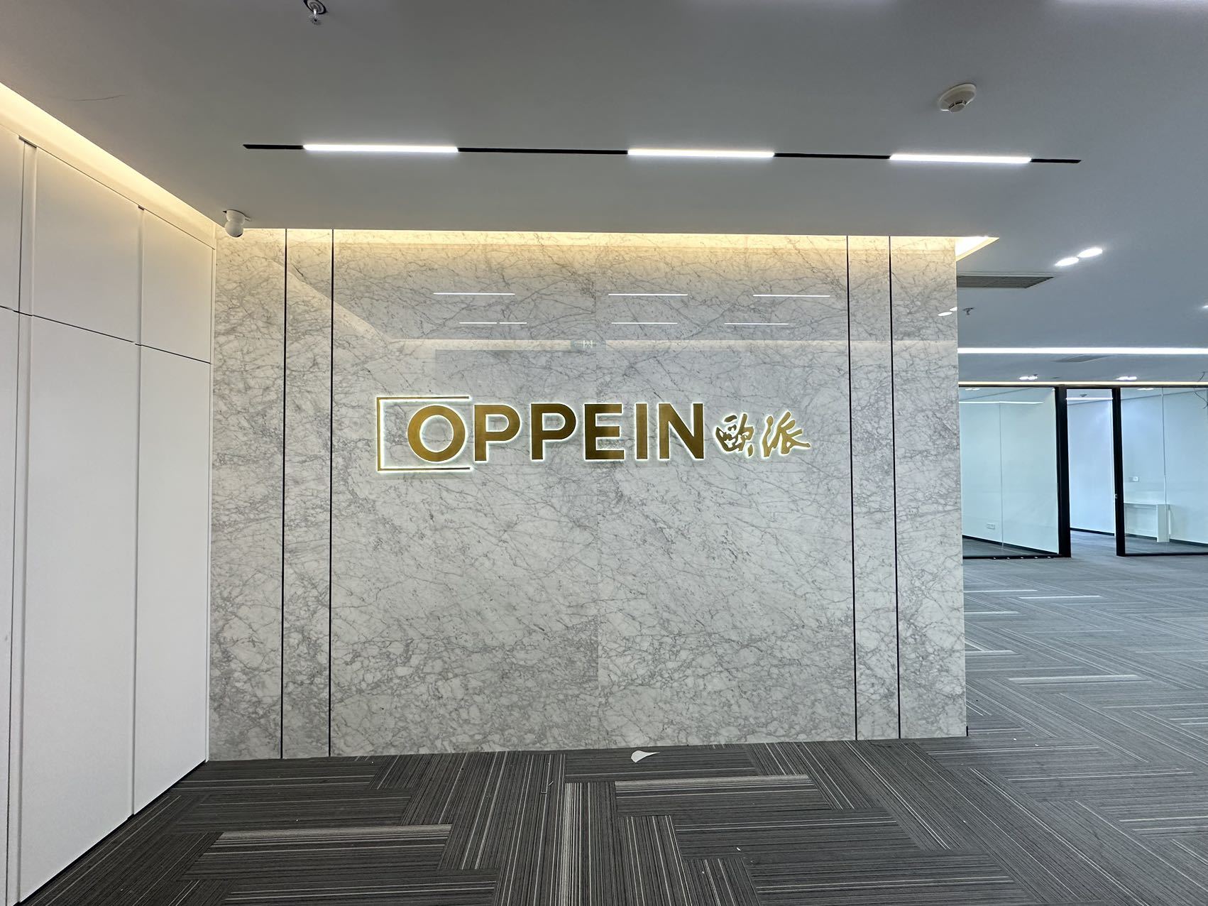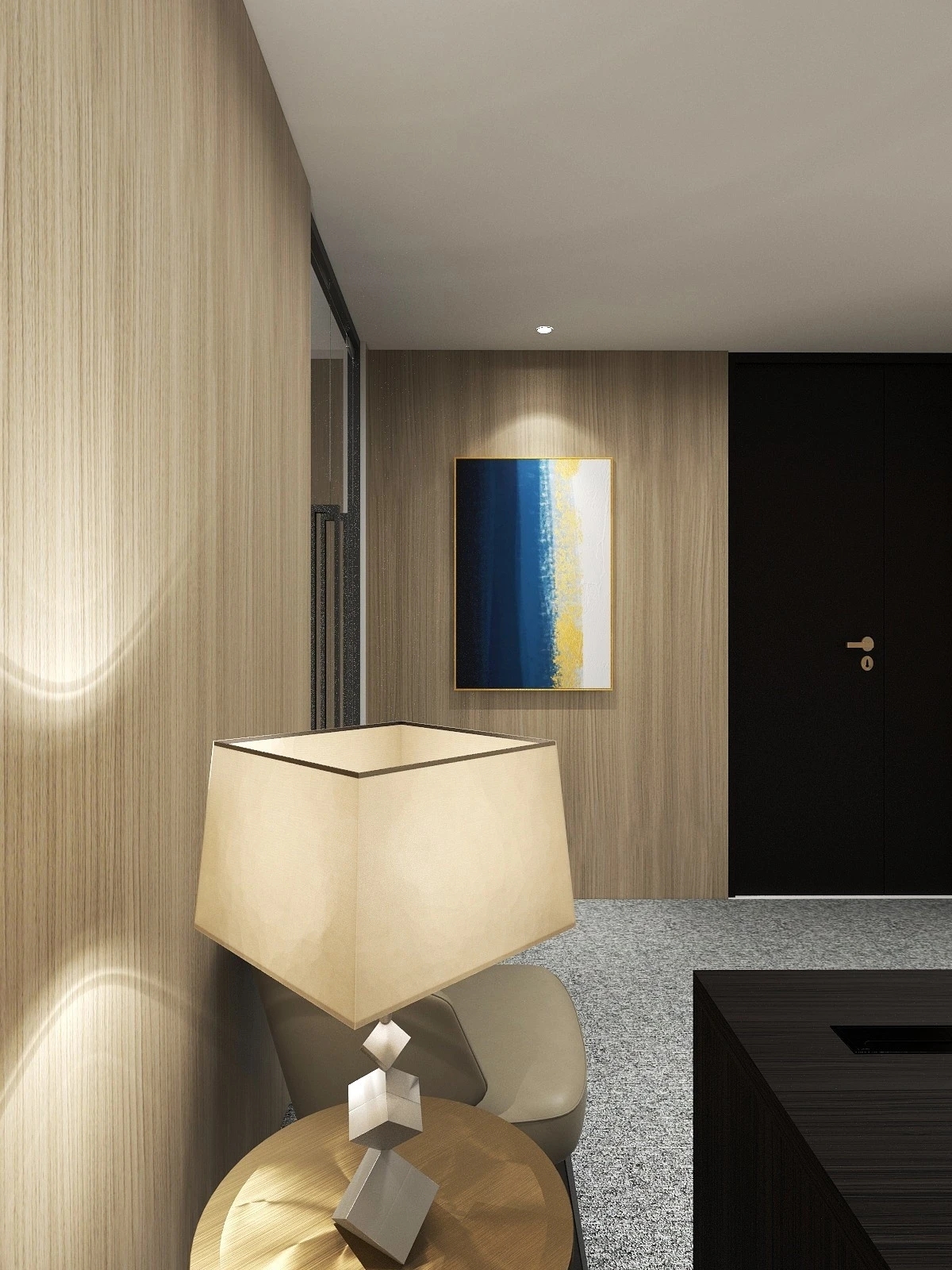 接待室装饰以木饰面板为主,由于空间限制没有窗户,通过设计玻璃砖造型,达到半通透的效果面,增加采光的同时也阻挡了内部办公区域的杂乱。