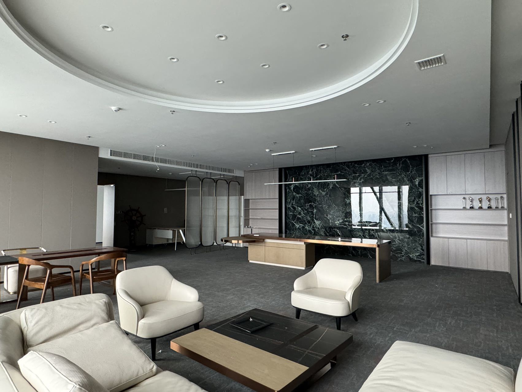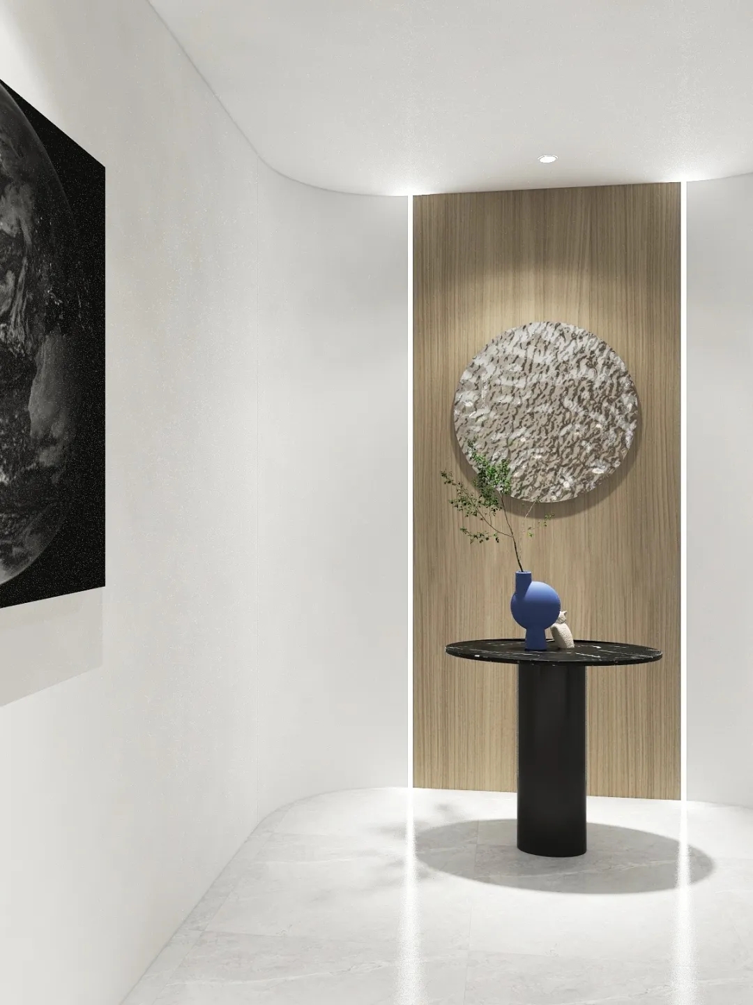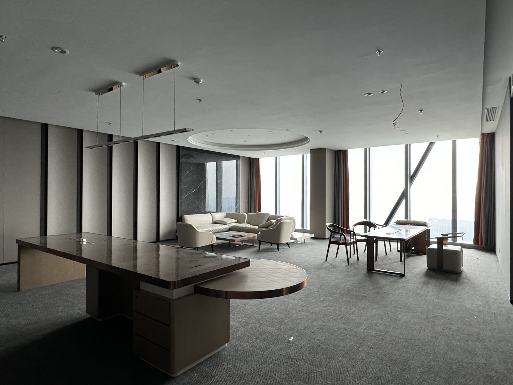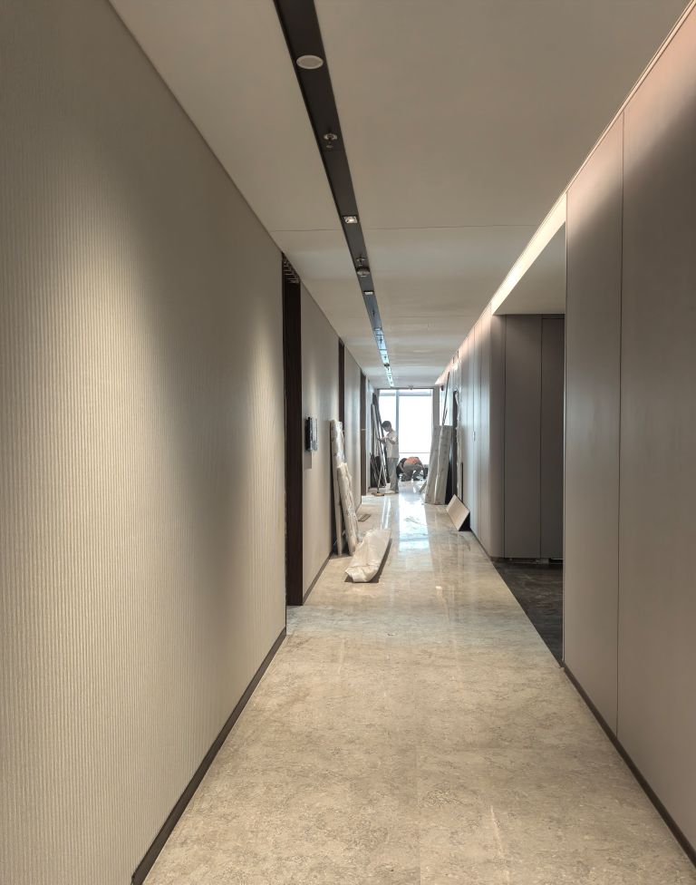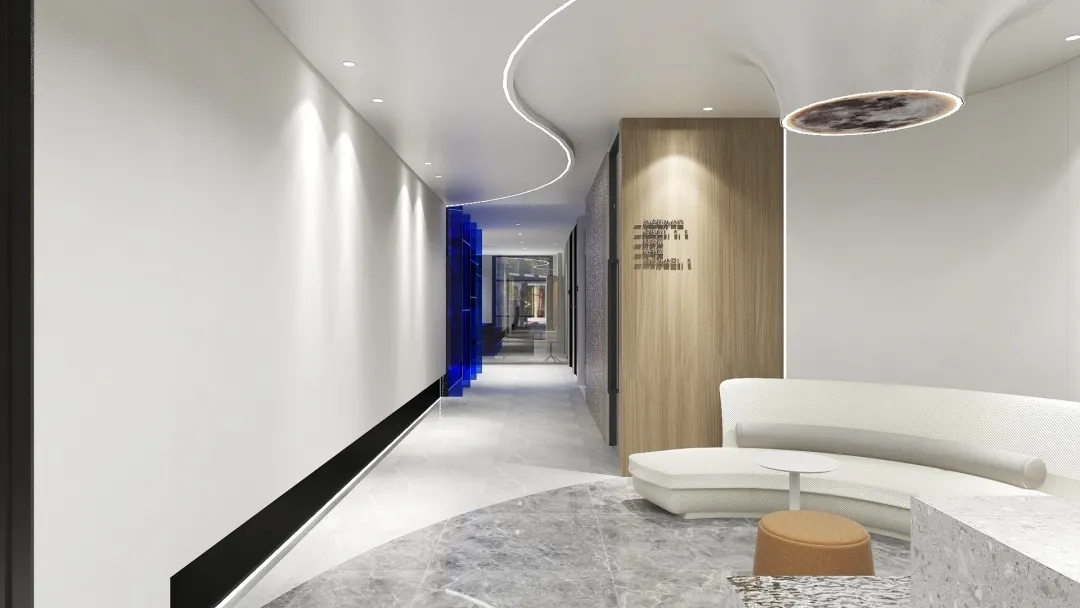 企业工作内容与环境水利相关,所以我们设计了木饰面为主的墙面处理,装饰上利用不锈钢压纹材质,引入流水概念。象征水的流线型顶面灯光,利用灯光贯穿整个大厅和走廊,增加空间联动性及现代科技感,灯光延伸至形象墙,连接水波纹不锈钢板,从墙面到地台到大理石地面,就好像瀑布飞流直下。作为局部点缀,倒火山口造型,底部设计地球灯装饰,抬头,就好像看到了世界。