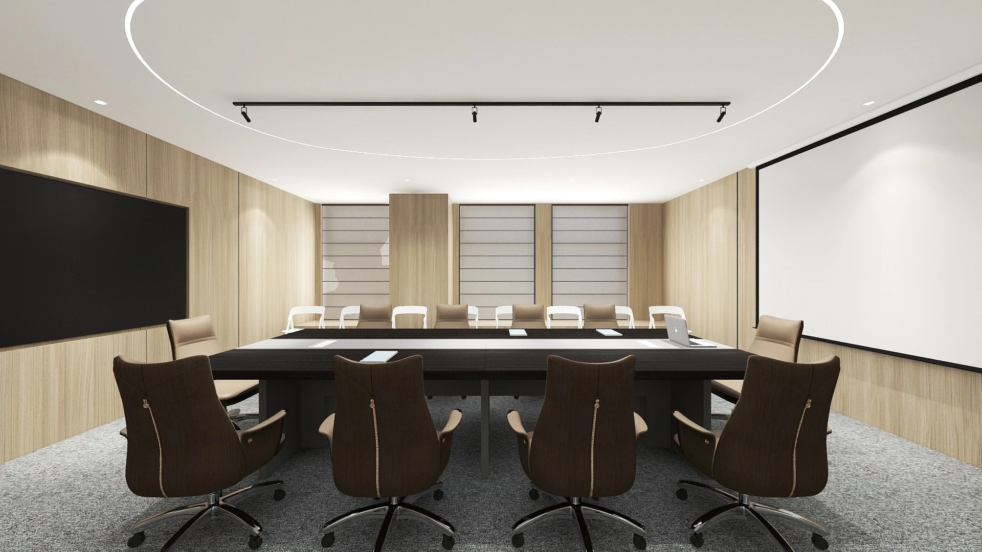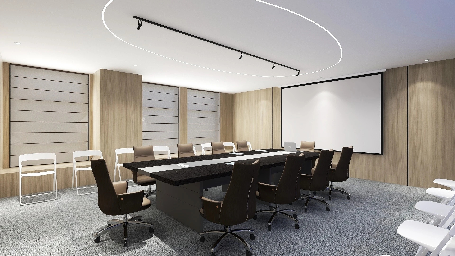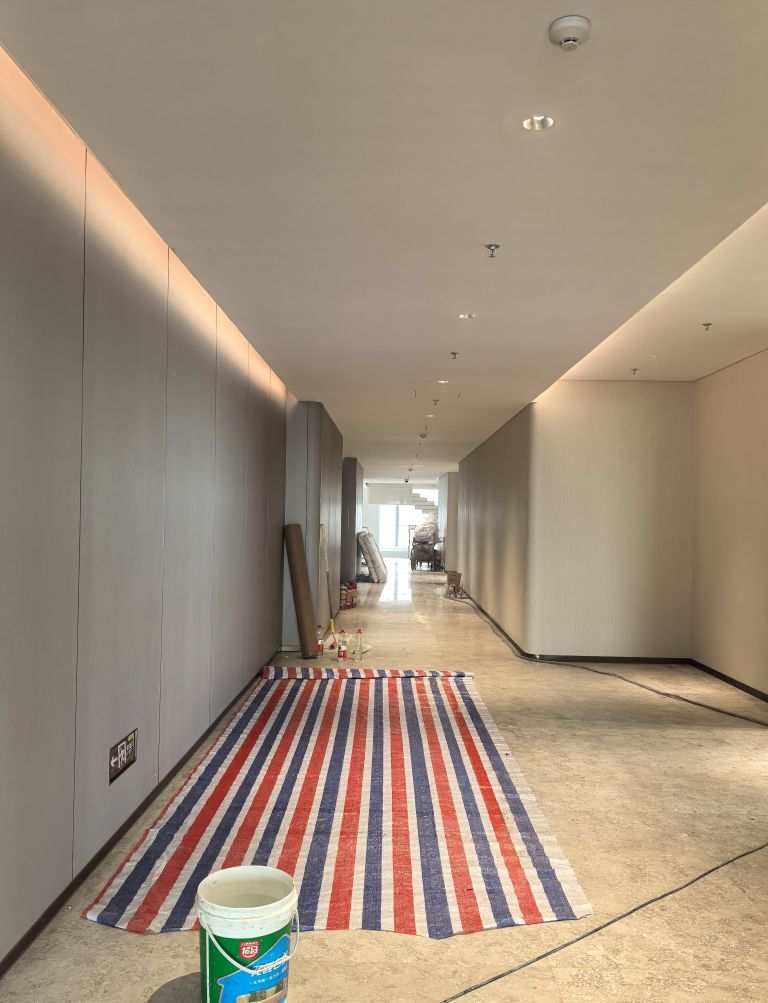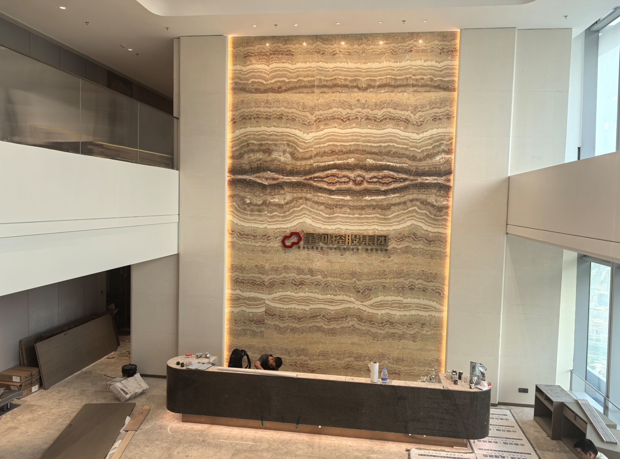 企业工作内容与环境水利相关,所以我们设计了木饰面为主的墙面处理,装饰上利用不锈钢压纹材质,引入流水概念。象征水的流线型顶面灯光,利用灯光贯穿整个大厅和走廊,增加空间联动性及现代科技感,灯光延伸至形象墙,连接水波纹不锈钢板,从墙面到地台到大理石地面,就好像瀑布飞流直下。作为局部点缀,倒火山口造型,底部设计地球灯装饰,抬头,就好像看到了世界。