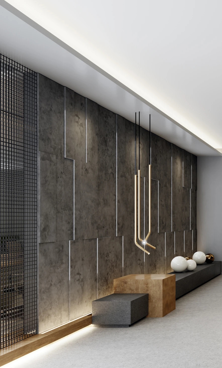 木之表皮,皆是自然的痕迹。大块面木饰结构,是自然的精致和野性力量相互融合的探索,在带来视觉舒适的同时,也赋予空间不一样的生命力。物皆有性,与空间产生情感勾连,各自散发一种独有的气质,或细腻、精致,或粗旷、朴实,丰富视觉感官的层次和维度,蕴藏设计师对品质的态度。
