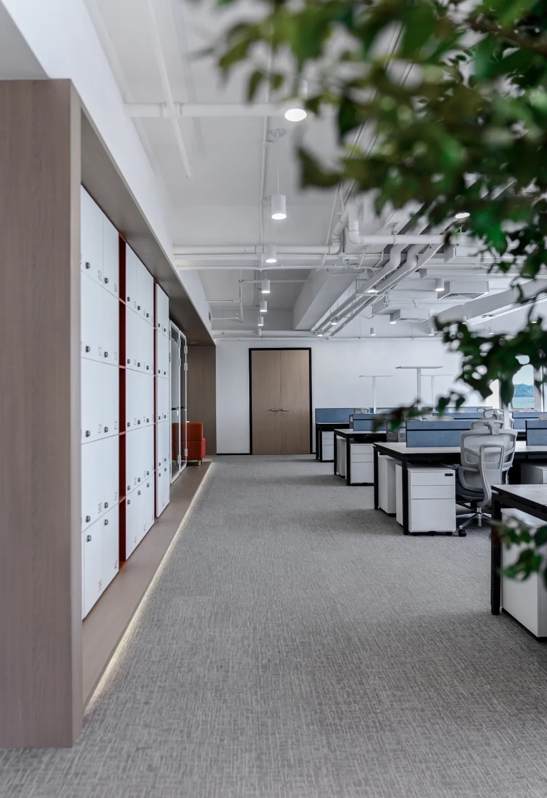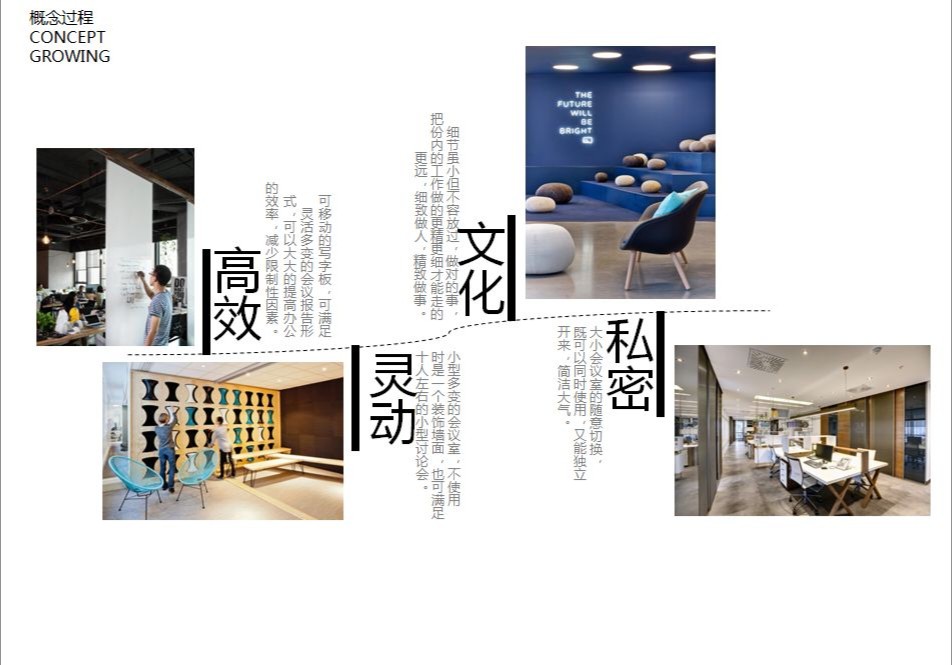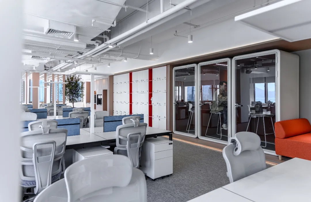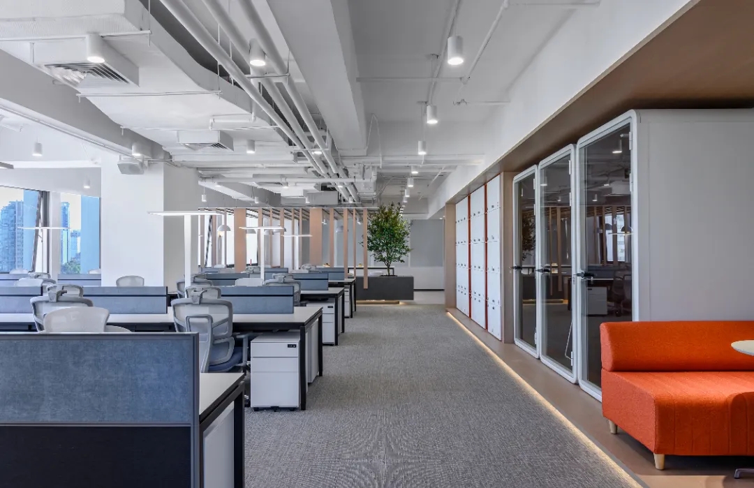 纵观整个设计,都在尝试对传统的办公方式带来改变,创造一个崭新愉悦的工作体验。依据场地的条件,以及体现企业文化和对员工的关怀,优先保证各个部门拥有最佳的采光、通风和视野,员工办公区域设置在靠窗的位置,不同部门与部门之间原则上根据楼层和柱位进行划分。其余的功能区块,如洽谈区、小会议室、打印室以及电话亭等,也没有按照普通的做法排列在靠墙的位置,而是看似随意的点缀在大空间的中间,这是有意的将原本规整的空间利用这些辅助功能加以划分,尽可能的消除开放式办公环境带来的私密性的缺失,使得办公环境动静结合。