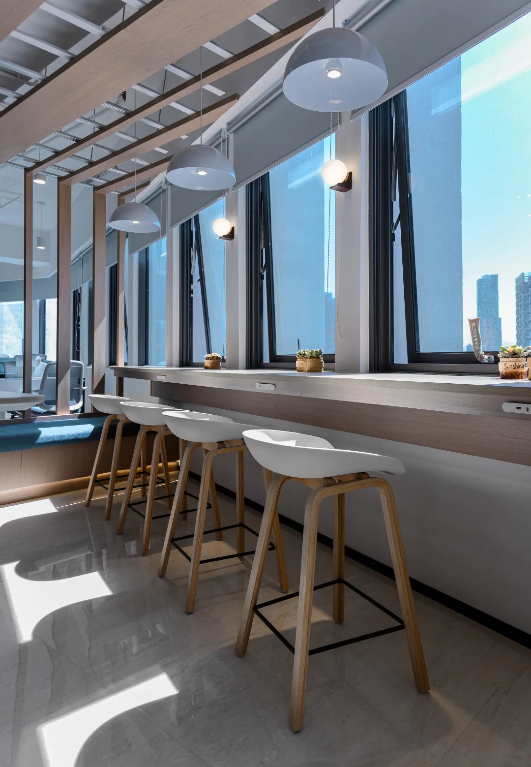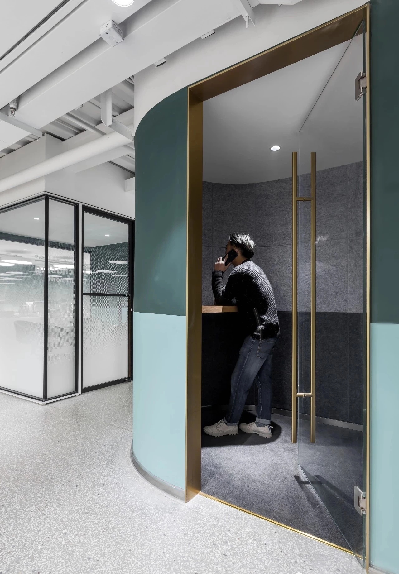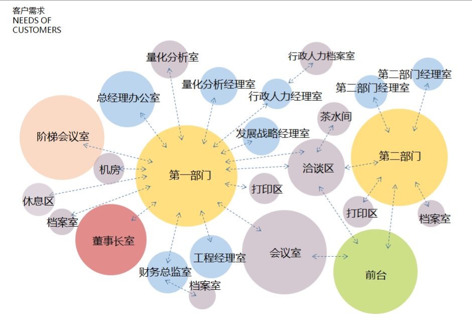 纵观整个设计,都在尝试对传统的办公方式带来改变,创造一个崭新愉悦的工作体验。依据场地的条件,以及体现企业文化和对员工的关怀,优先保证各个部门拥有最佳的采光、通风和视野,员工办公区域设置在靠窗的位置,不同部门与部门之间原则上根据楼层和柱位进行划分。其余的功能区块,如洽谈区、小会议室、打印室以及电话亭等,也没有按照普通的做法排列在靠墙的位置,而是看似随意的点缀在大空间的中间,这是有意的将原本规整的空间利用这些辅助功能加以划分,尽可能的消除开放式办公环境带来的私密性的缺失,使得办公环境动静结合。