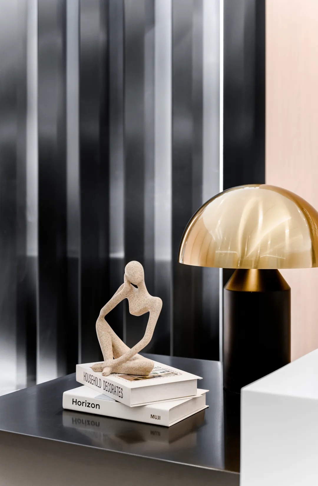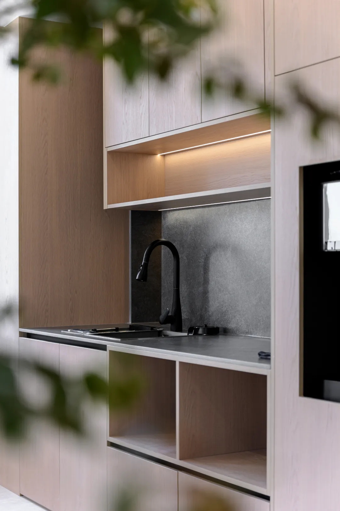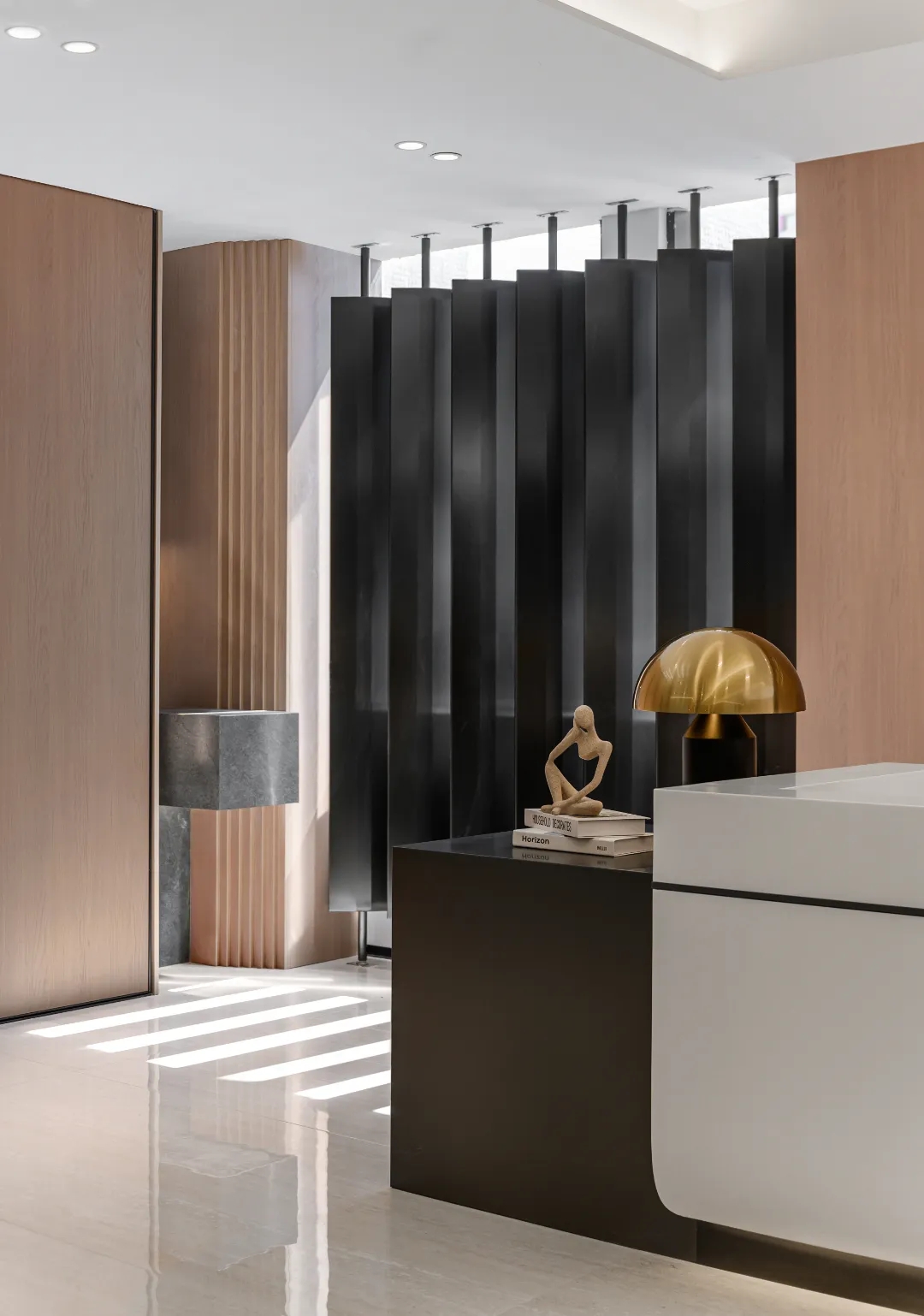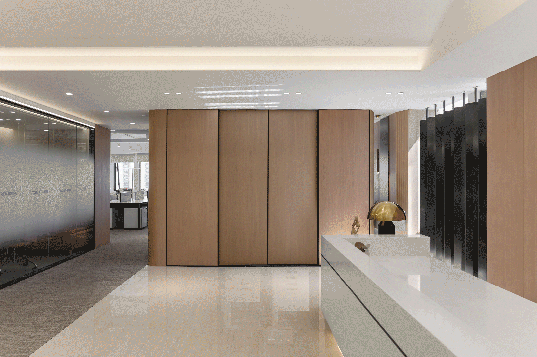 前台区的侧面整体柜,需要时轻轻打开,为你提供打印便捷服务;不需要时则悄然关闭,隐藏在时光的帷幕之后,而由环保新材料打造的不锈钢黑条背景,在每日的日照中宛如一幅灵动的画卷,光线仿佛随着时间的转动而翩翩起舞,为这片空间增添了一抹独特的艺术氛围,它不仅是功能与美感的完美融合,更是对品质与环保的极致追求。