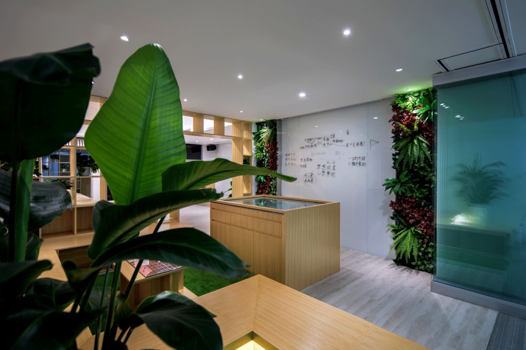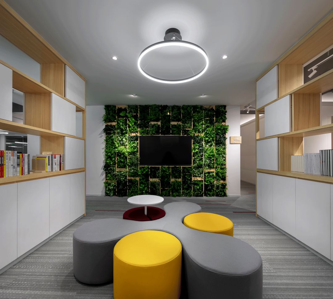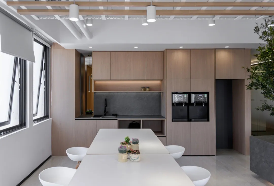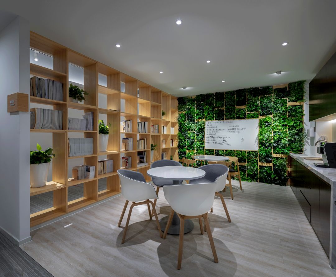 茶水間 PANTRY,茶水間選擇設定在兩個部門中間的位置,可以方便兩個部門共同使用,而不會互相影響。運用綠植墻作為隔斷墻,結合深木色的櫃體和白色的石材臺面設計,讓置身於此的人有壹種戶外如臨大自然的感覺。簡約的圓形桌臺配合綠植牆中間的寫字白板,讓茶水間成為一個員工們可以輕鬆休息及討論、交流心得。