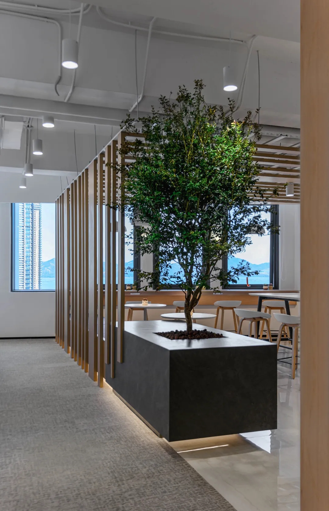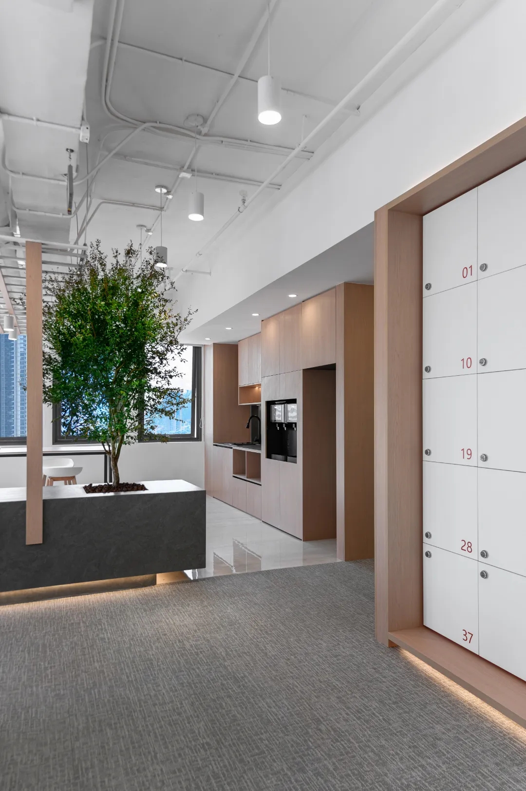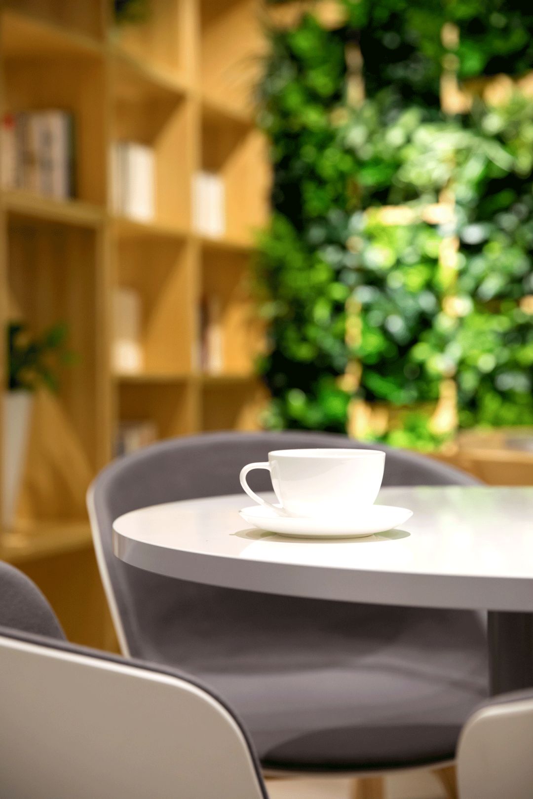 茶水間 PANTRY,茶水間選擇設定在兩個部門中間的位置,可以方便兩個部門共同使用,而不會互相影響。運用綠植墻作為隔斷墻,結合深木色的櫃體和白色的石材臺面設計,讓置身於此的人有壹種戶外如臨大自然的感覺。簡約的圓形桌臺配合綠植牆中間的寫字白板,讓茶水間成為一個員工們可以輕鬆休息及討論、交流心得。