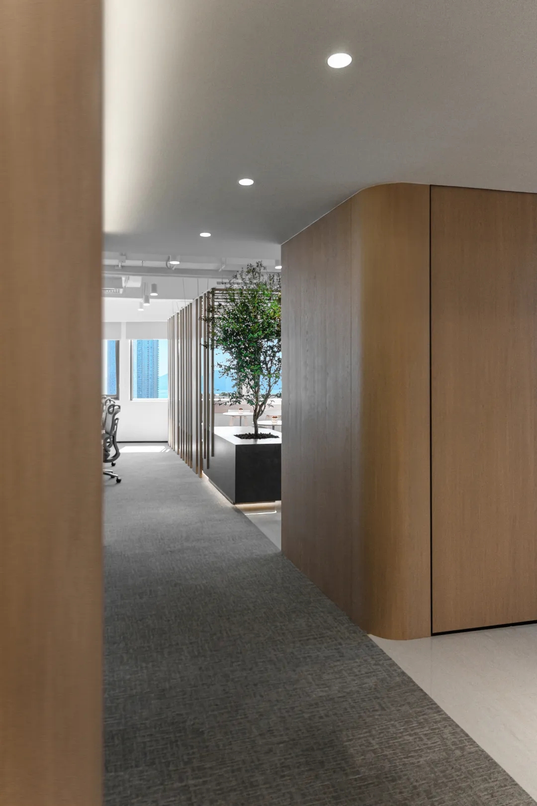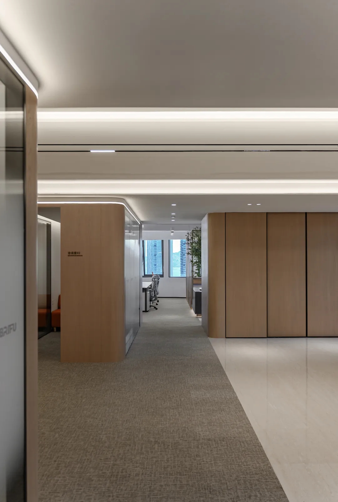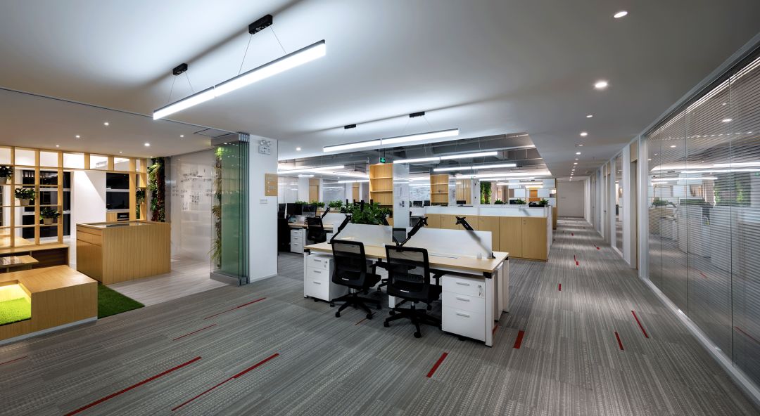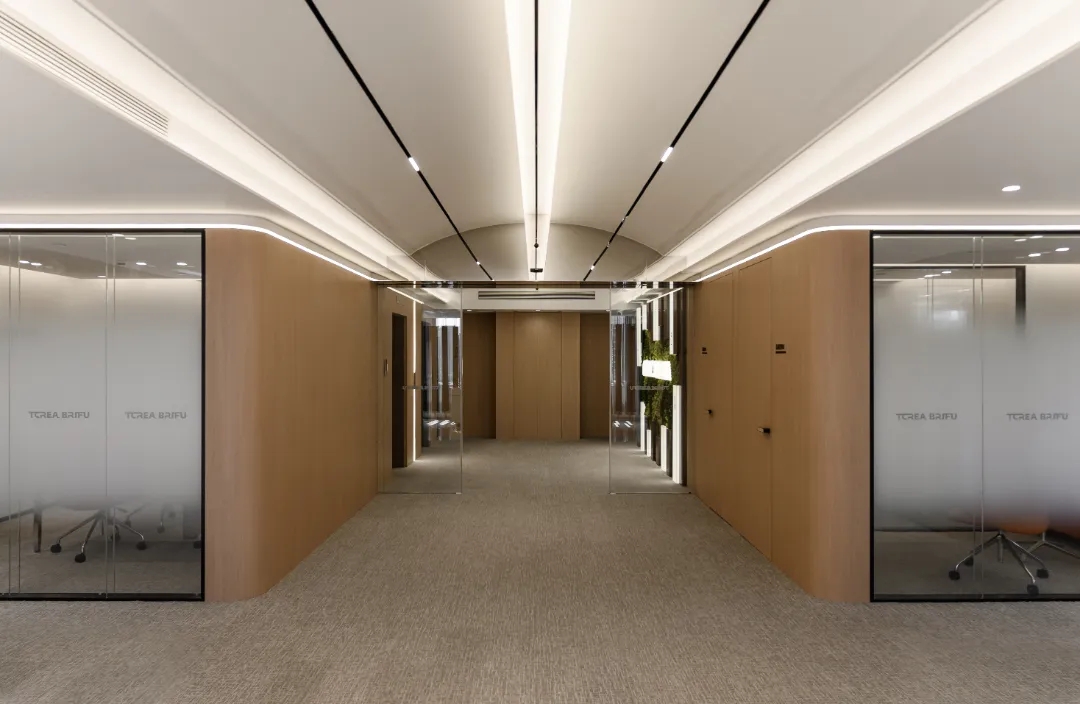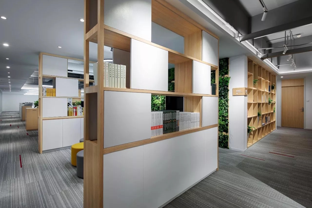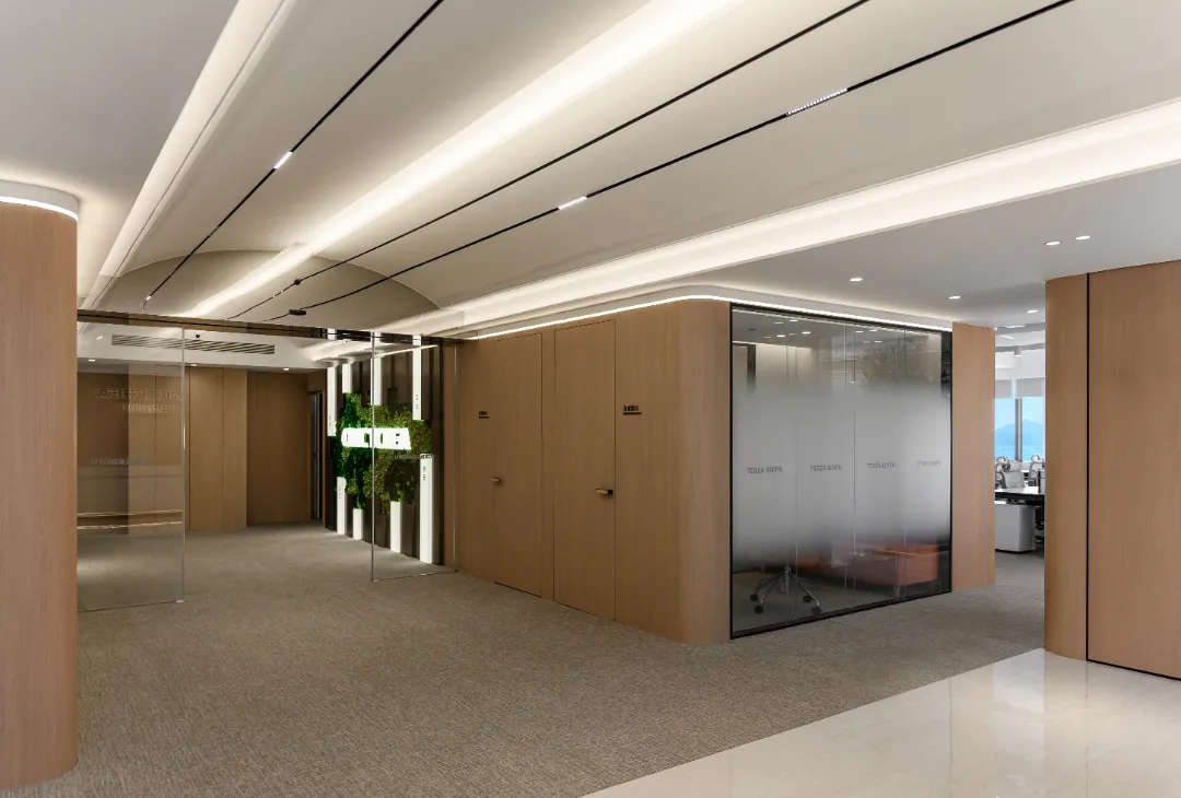 辦公區域 OPEN AREA,辦公區域運用超白烤漆玻璃作為墻體和柱體的裝飾,燈光照射下隱約的反光,增強空間的明亮度及整體寬敞度,並可以用來作為討論、公告的寫字白板,最大力度的提高了日常工作的效率。為增加公司整體收納能力,方便員工儲存物品,利用轉角的空餘地方做了小的收納角櫃。木色櫃體上方做了層櫃,可以擺放公司獎盃、裝飾物品及書籍等,使整個空間在辦公之餘有輕鬆的感覺,也使辦公空間雖然簡約大氣,但不單調。