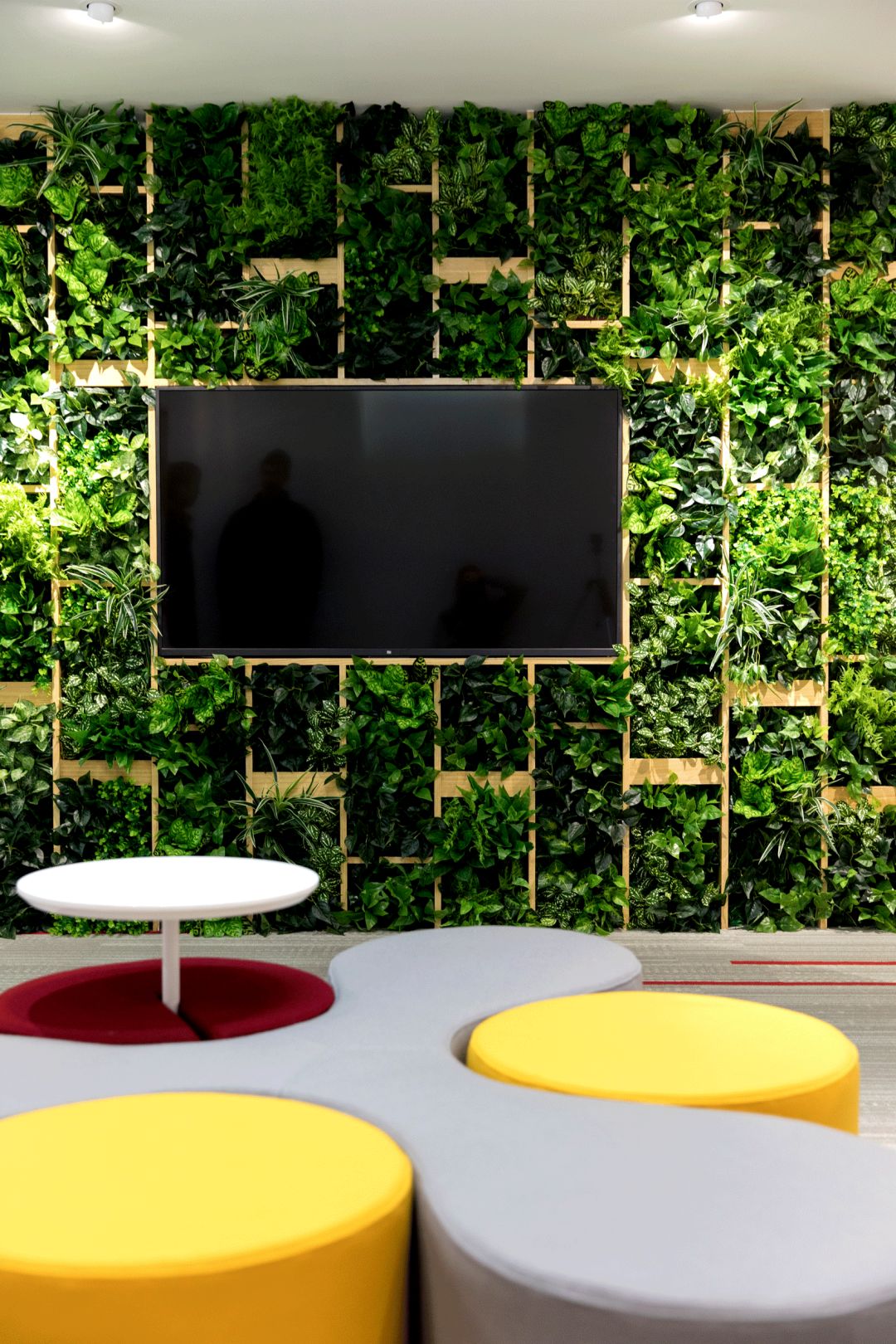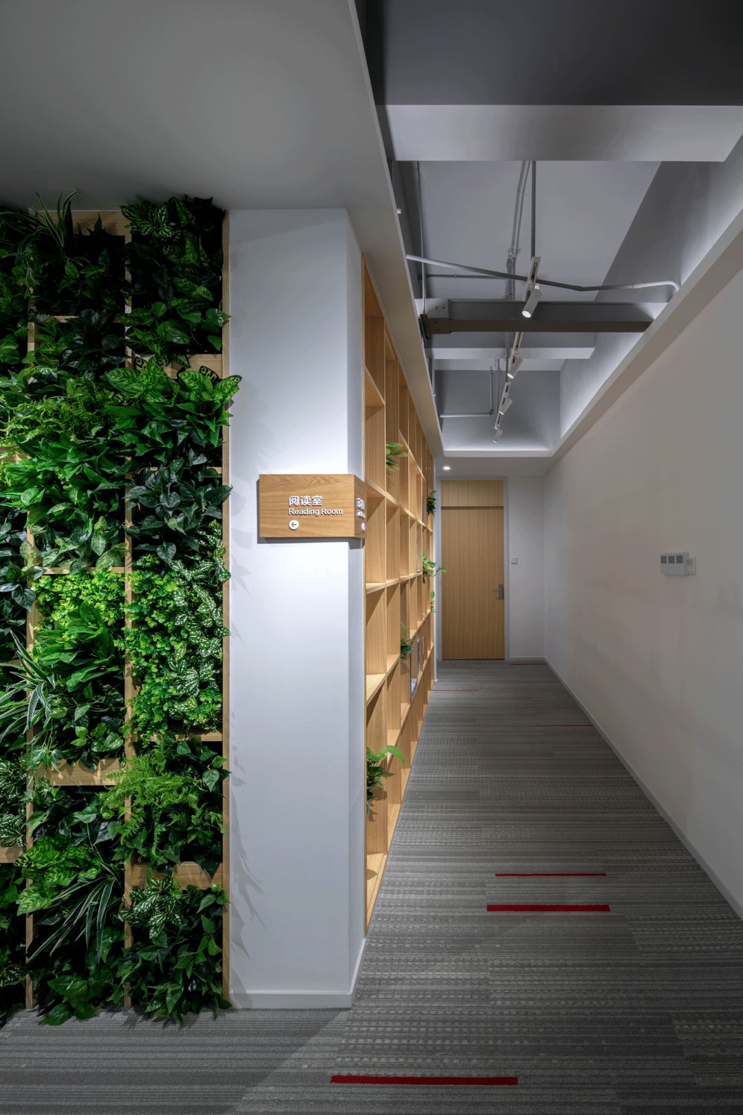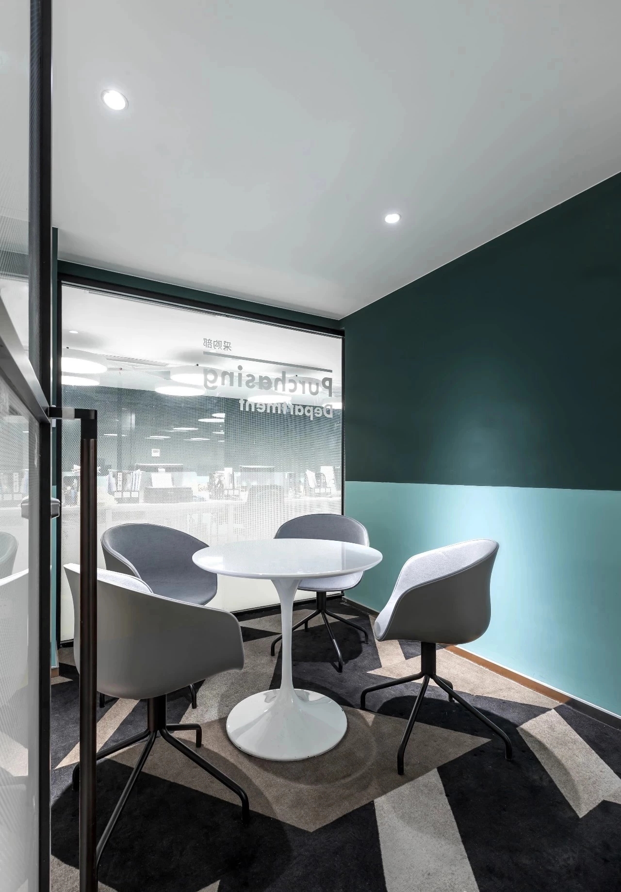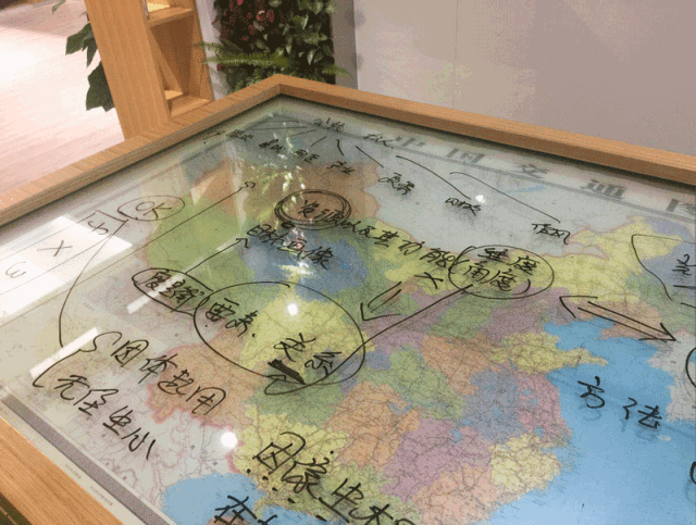 設計中心 DESIGN CENTRE,設計中心與路演中心聯通,中間用格柜做隔斷,讓空間顯得通透。沙盤採用了通電玻璃的技術,可以非常方便的直接在地圖上做討論。兩面綠植墻和綠色地毯,讓整個空間都充滿活力,也十分切合公司的環保理念。