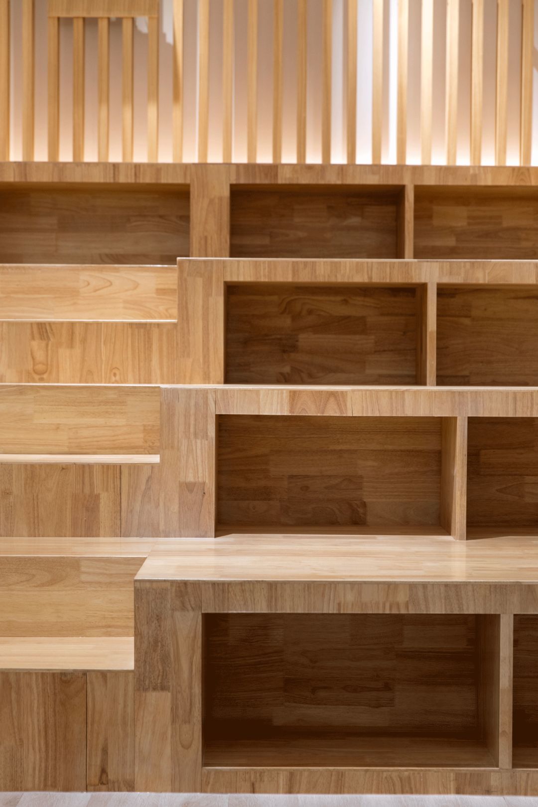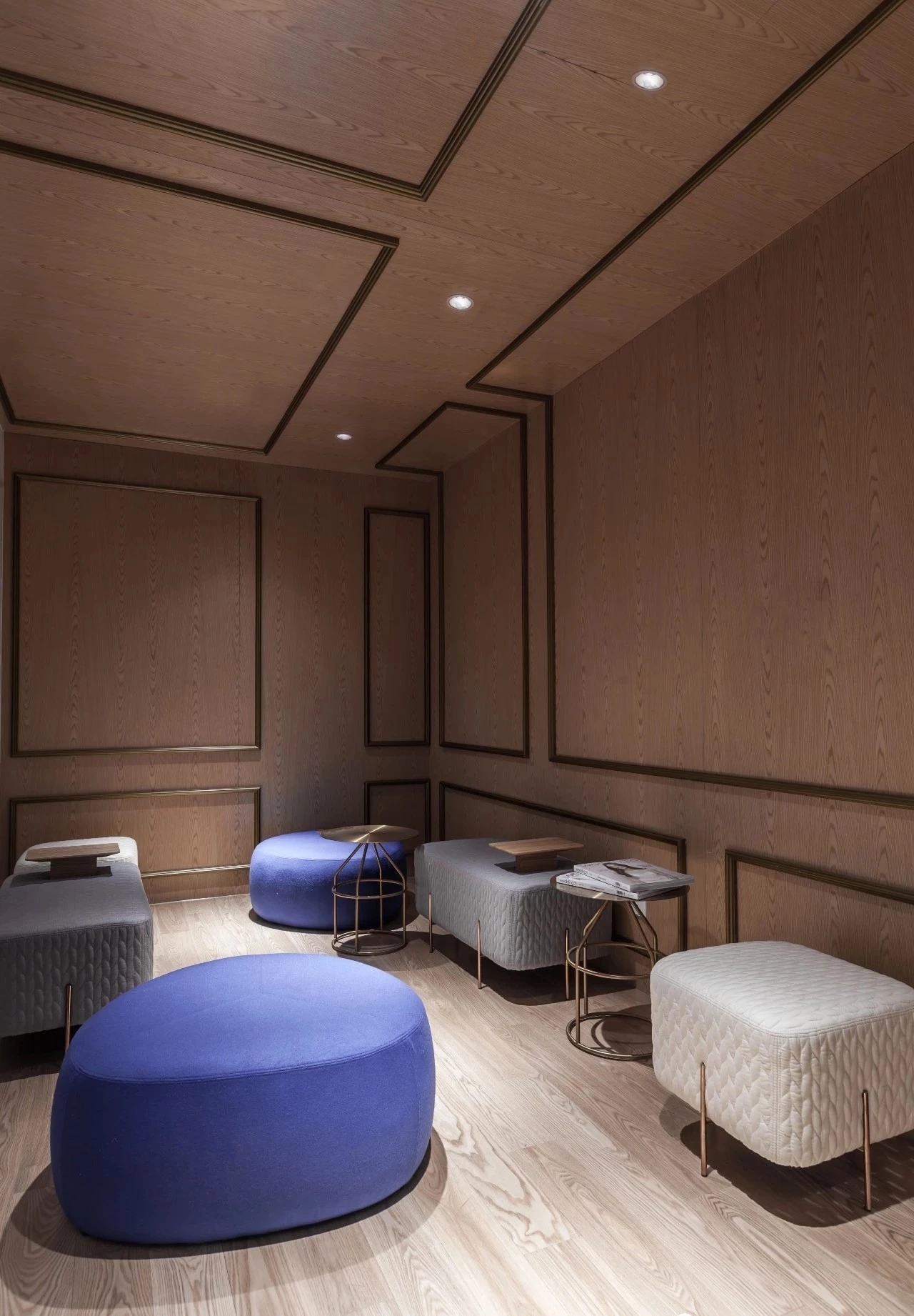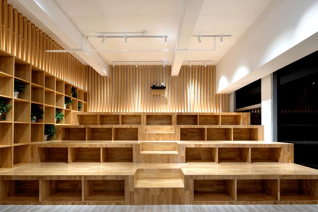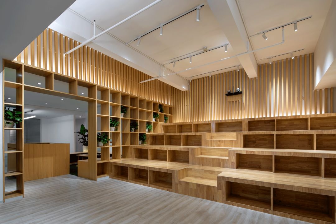 路演中心 ROADSHOW CENTER,路演中心是本案的設計重點之一,整個空間裡最多可容納40人。階梯坐臺下面的小空間,可以用來收納多餘的坐墊,旁邊的格櫃既可以用來放置裝飾物件,又可以用來放置多餘的小坐凳,當階梯坐臺上沒有空餘的地方時,也可以運用這邊的坐凳來作為暫時的座椅。整個空間以淺木色為基調,四周的格柵配以燈光效果使空間看起來舒服自在,通透明亮。
