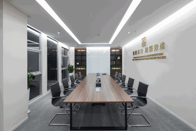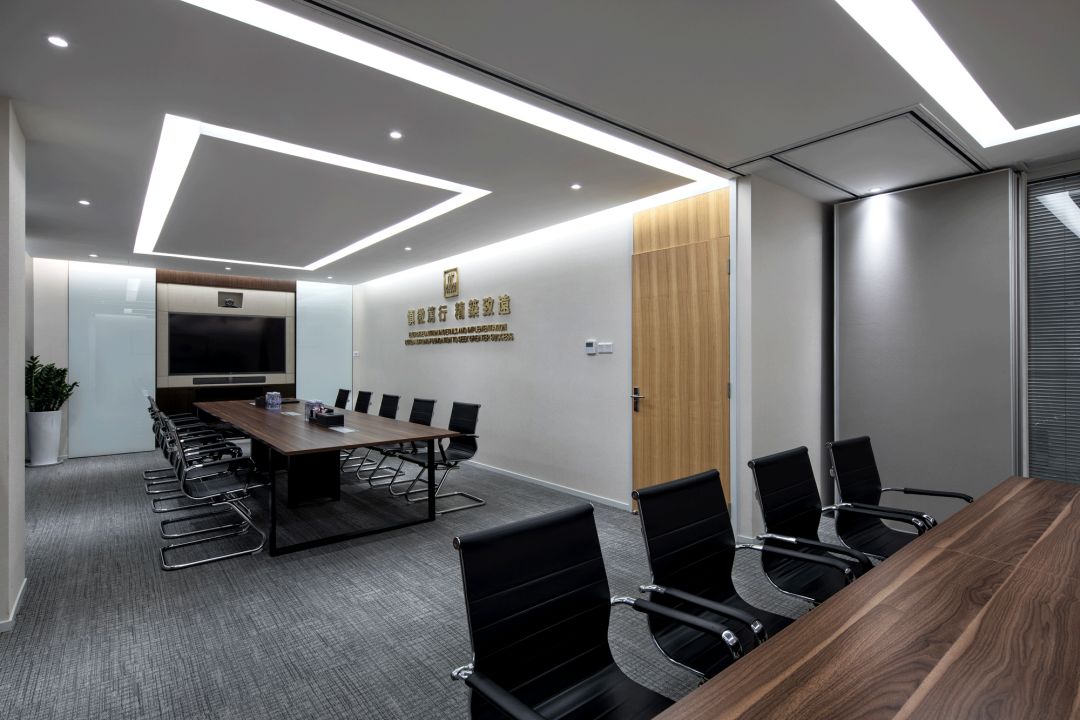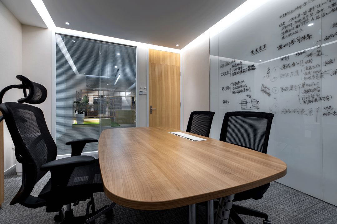 會議室區域 MEETING ROOM,考慮到甲方日漸增員的可能性,將大會議室與小會議室中間實牆設計成活動折疊門,可以在開大型會議時聯通兩間會議室一起使用,使空間的利用更加靈活多變。超白烤漆玻璃作為可移動的櫃門,既可以用來作為匯報的匯報板,又在投影幕布放下來的時候作為講解的寫字板,旁邊的裝飾隔櫃可以放置壹些單位的展示獎杯,當寫字白板向兩邊推開時,裏面還有壹個隱藏的電視櫃,壹個櫃,多種功能,在滿足功能需求的同時,又不浪費和佔用多餘的空間。