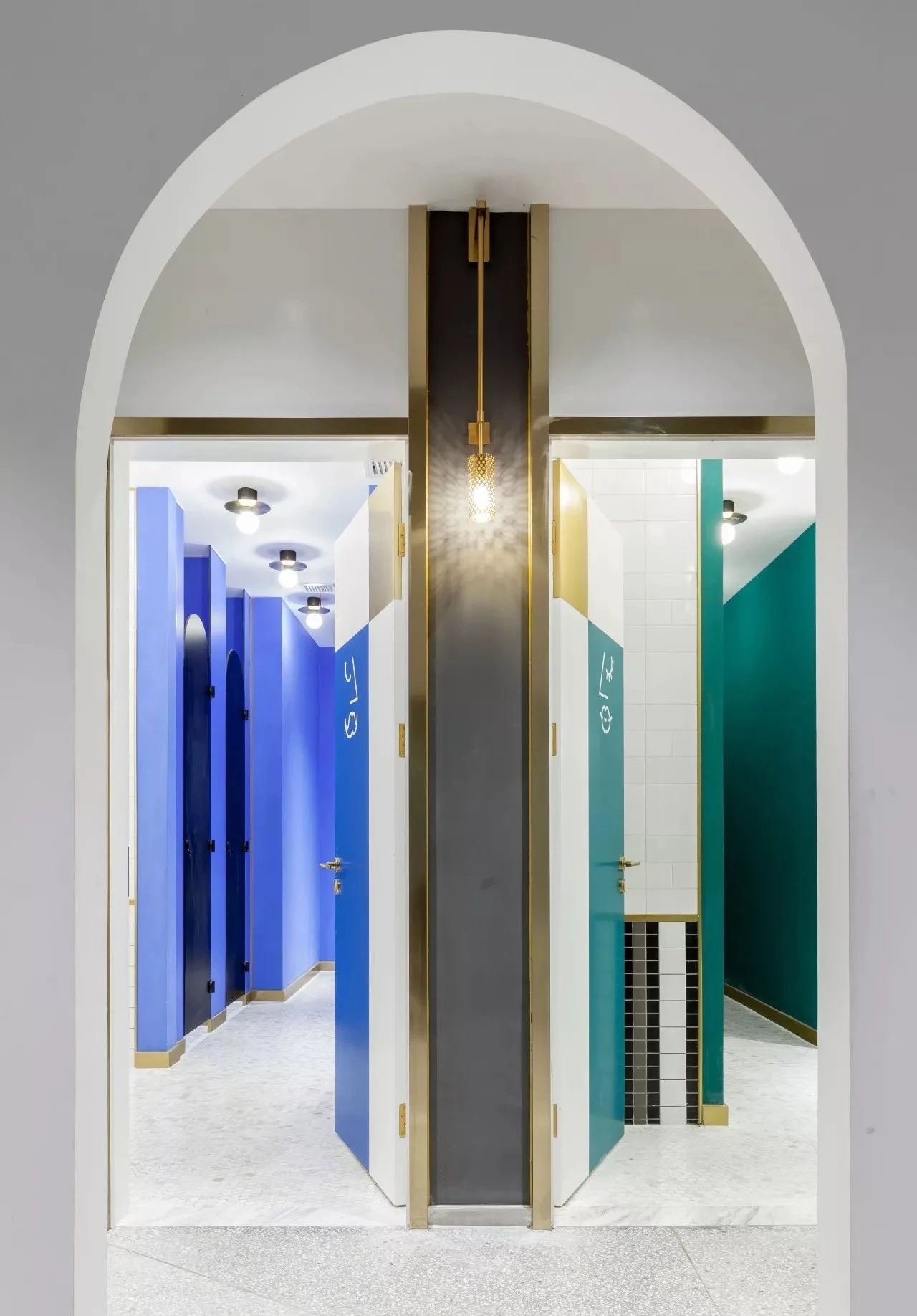 对于通常会被忽略的卫生间,设计师也没有放过,同样运用了纯度很高的色块并且结合大面积的白色瓷砖营造出非常明快的氛围。值得一体的是灰色和黑色马赛克以及黄铜的点缀为这样的空间增添了一份时髦优雅的感觉。就连黄铜洗水池是设计师为了这空间设计并且定制的。墙面和天花暖白色的球形灯泡所散发出来的灯光取代了普通射灯相对刺眼的光照,为整个空间更增添了一份幸福感。