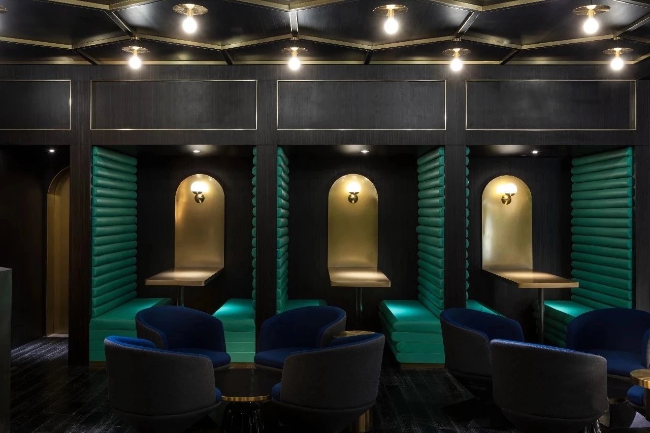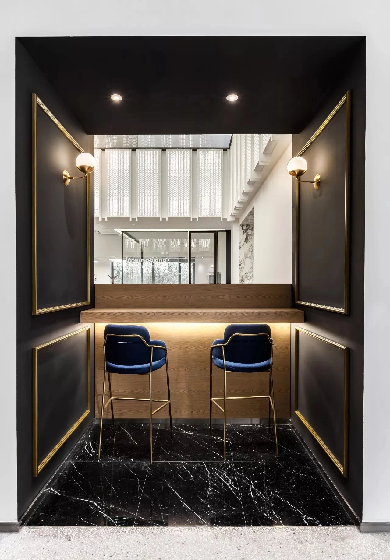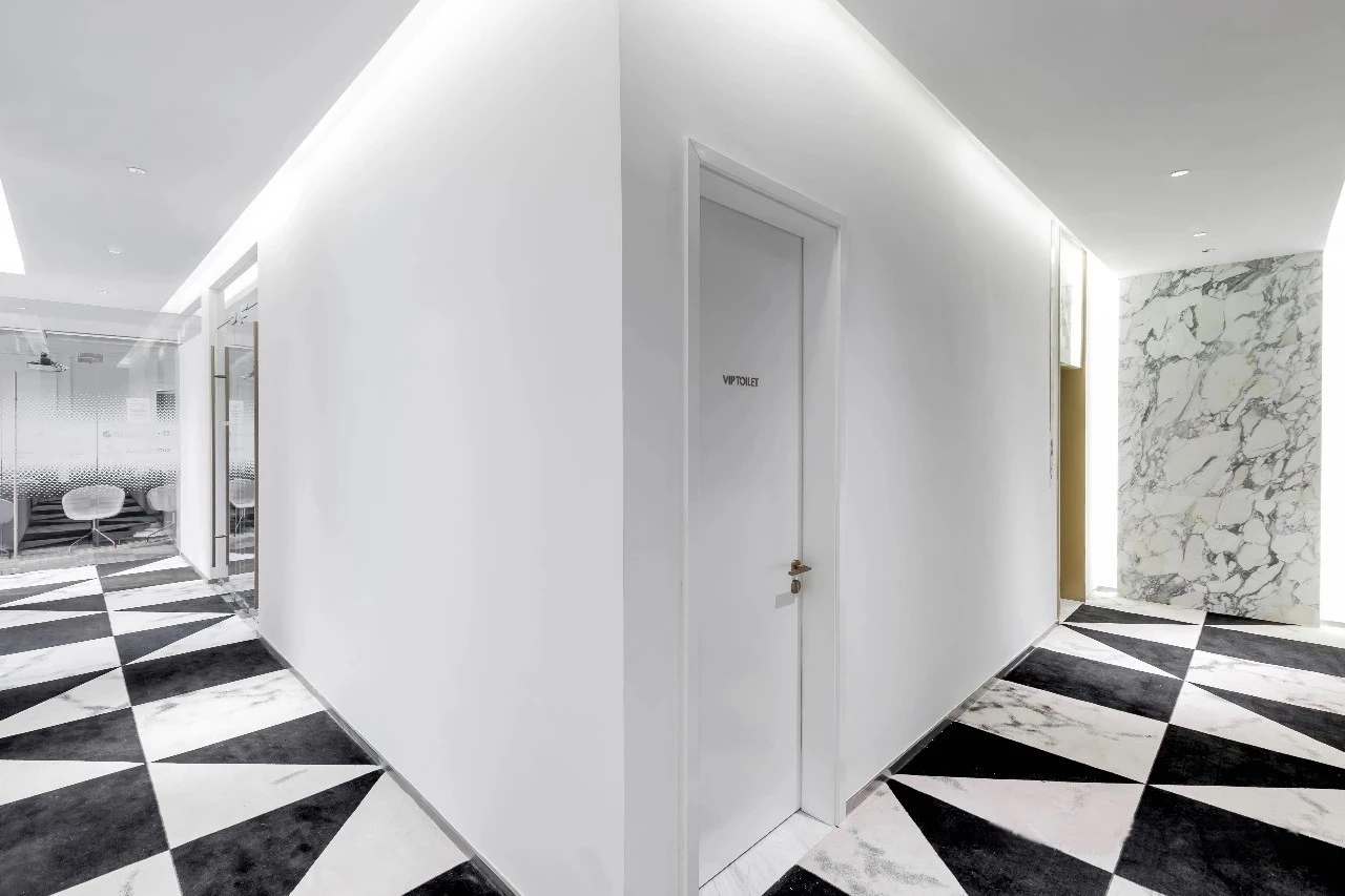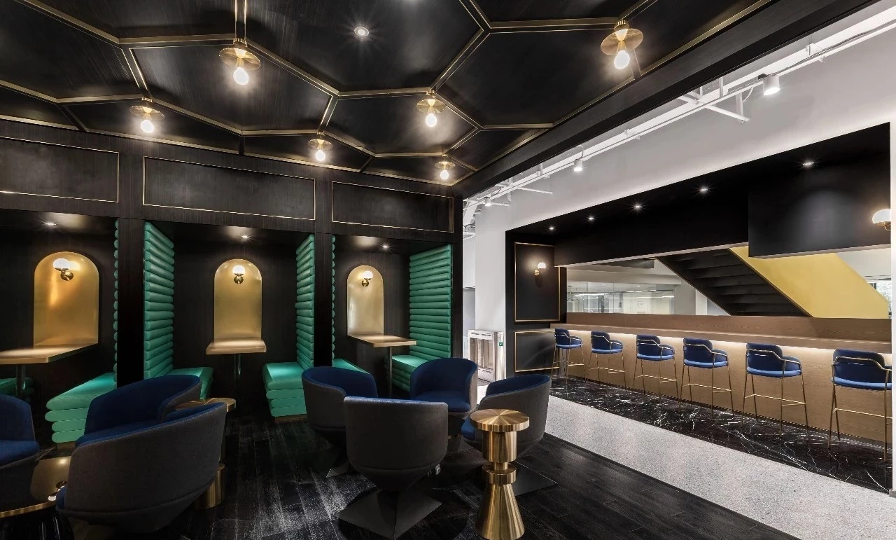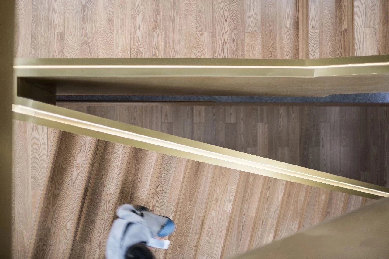 通过金色楼梯走去二、三、四层办公区。除了交通需要,中庭空间是整个空间的精神主导,为了营造微妙的神圣感,在设计上,四周采用冲孔铝板结合独特的背发光的打光方式,呈现了丰富而有趣的空间构成和层次感,光影之间呈现一种梦幻的仪式感。而不同层面窗洞,错层的视线交流,使之完全变身为整体空间的视觉焦点和活动中心。在公司举行重大活动的时候这里的大台阶可以作为主要的舞台,楼上的员工可以通过特意设计的黑色“窗洞”一同参与。你可以走上木质平台,另外一侧设计师巧妙的设计了一个半高的吧台桌面,透过矮墙的高度实现了两个功能区域之间物理和心理层面的交流。