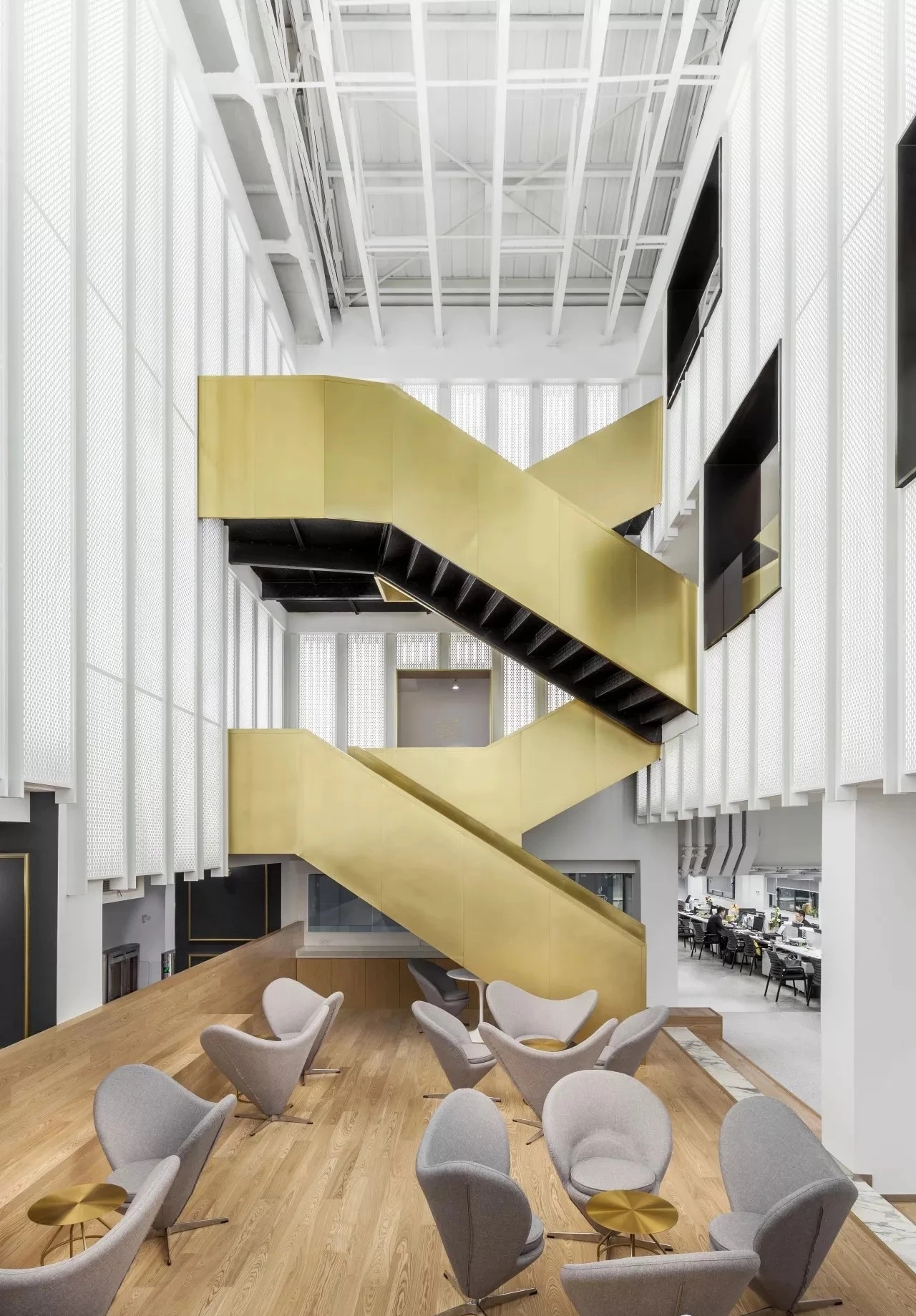设计团队重新梳理的原先的楼板关系,使之形成半层的空间组织关系,同时,为了打破原有厂房建筑横竖矩阵一般呆板的柱网布局,拆除了原有中间部位的部分楼板,将其上下贯通形成一个高三层的中庭空间,并在这里设计了金色楼梯将整个办公室的上下交通动线汇聚到中庭,担负了出入公司必经的交通枢纽的角色。