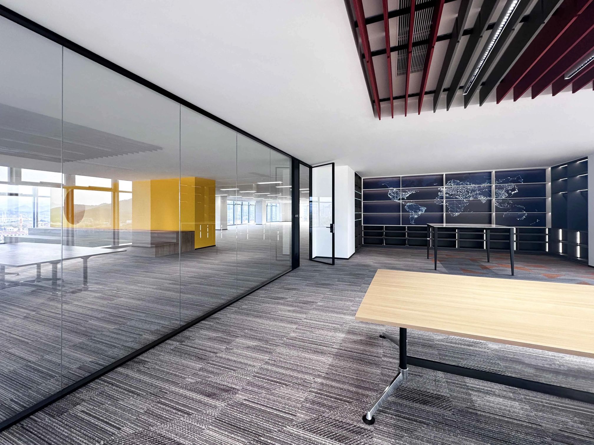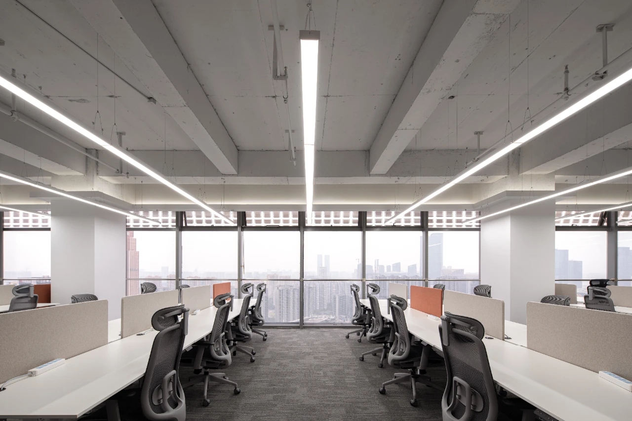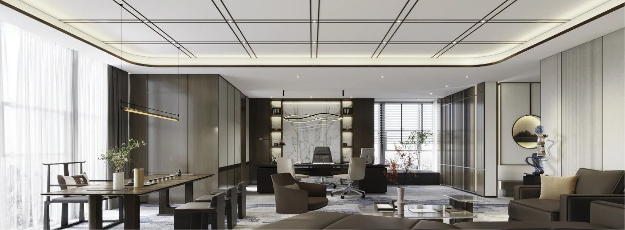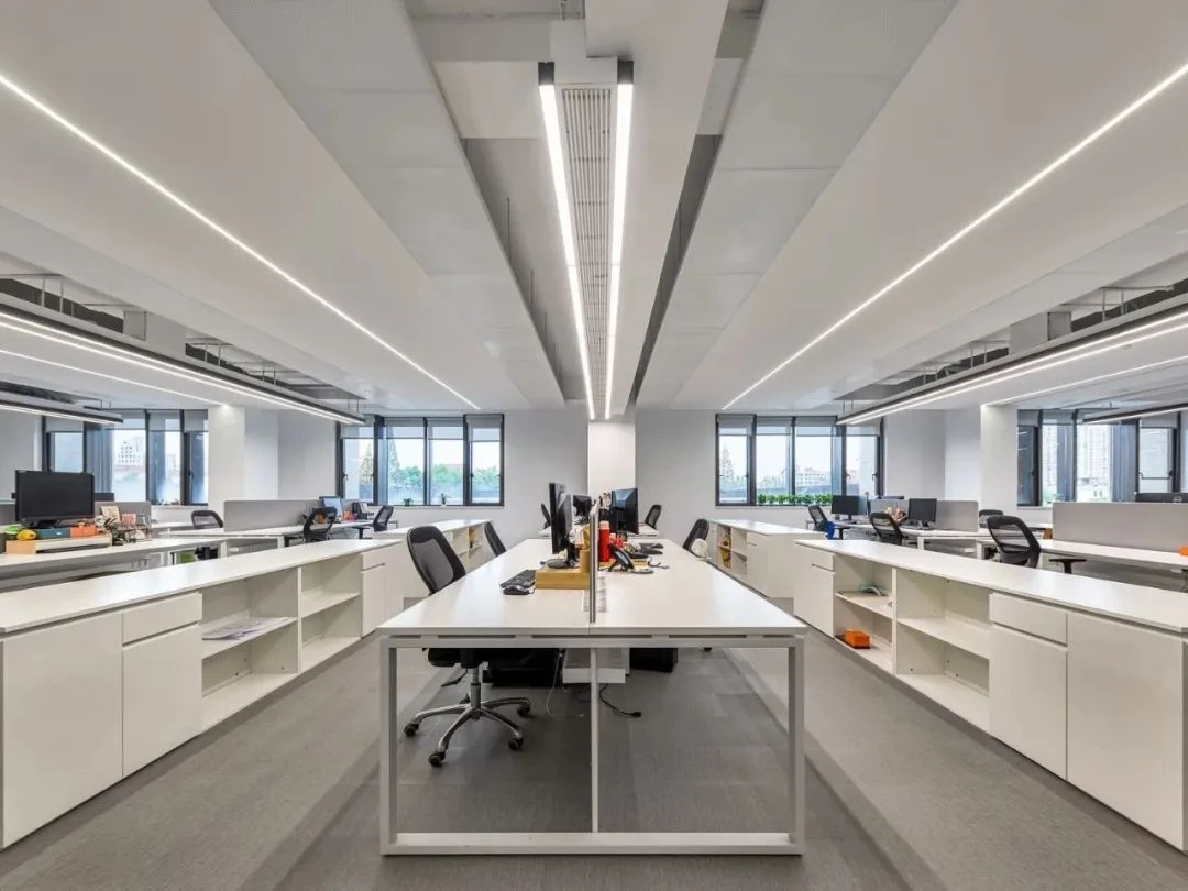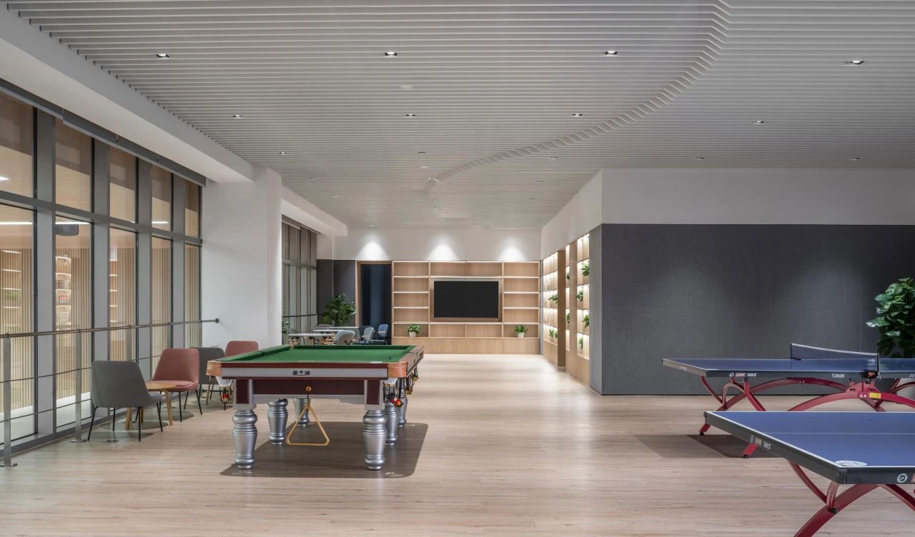 开敞办公区规划在靠通风,采光良好的靠窗区域,在靠近过道一侧设置了镂空书架,办公区有了几分活跃感。