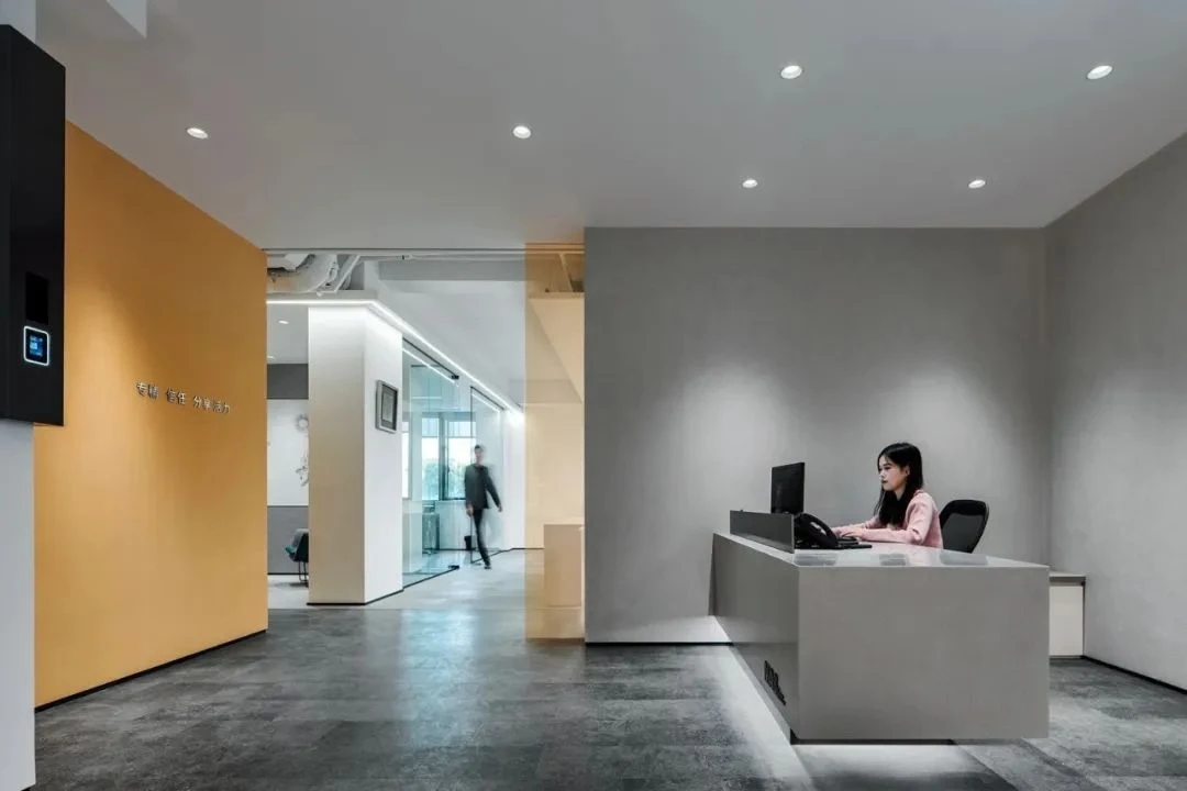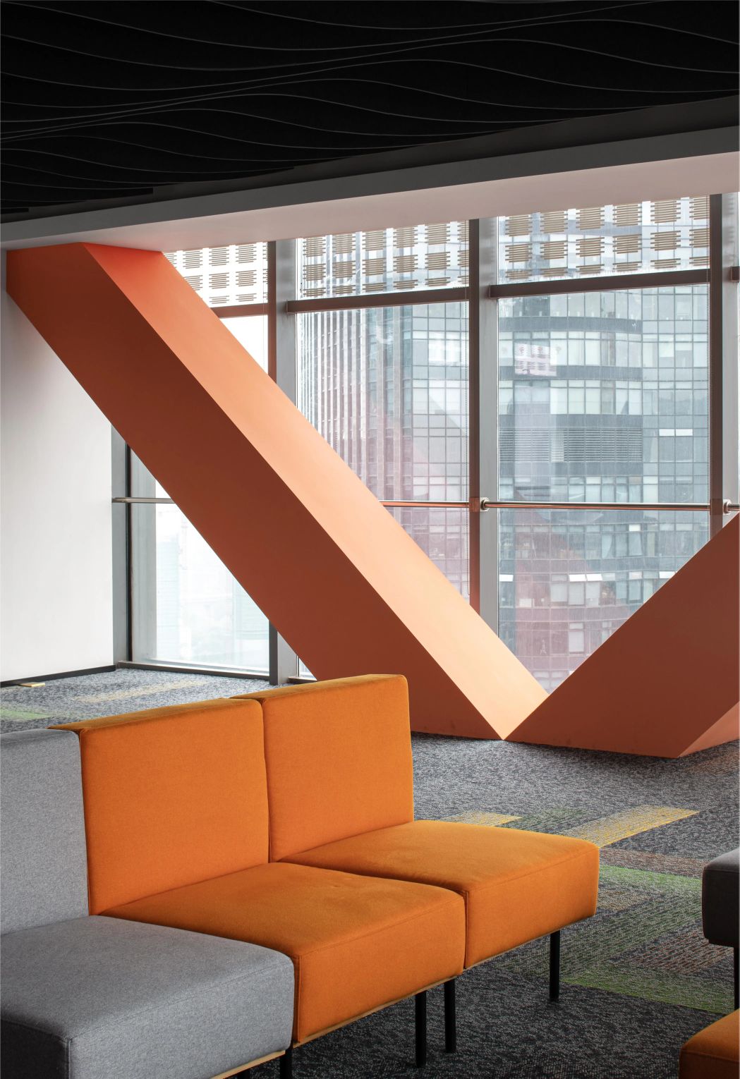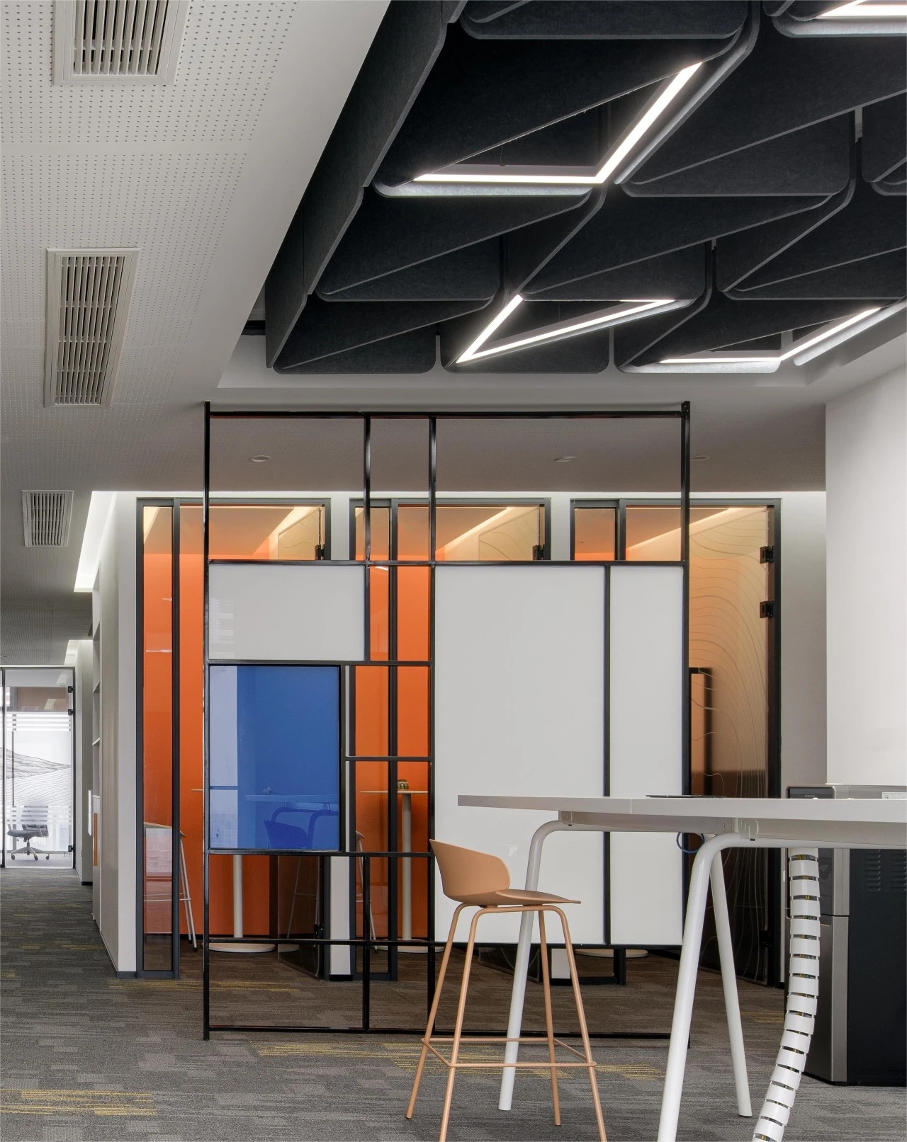 接待前区的空间设计,延续公司一贯采用的黑白灰为主调,企业“橙”色为点缀,简明的几何线条作为设计语汇,在每一个空间的尺度感力求精准把控,为激发更多创新思考与创意灵感,也在空间保留了许多流动的自由度。