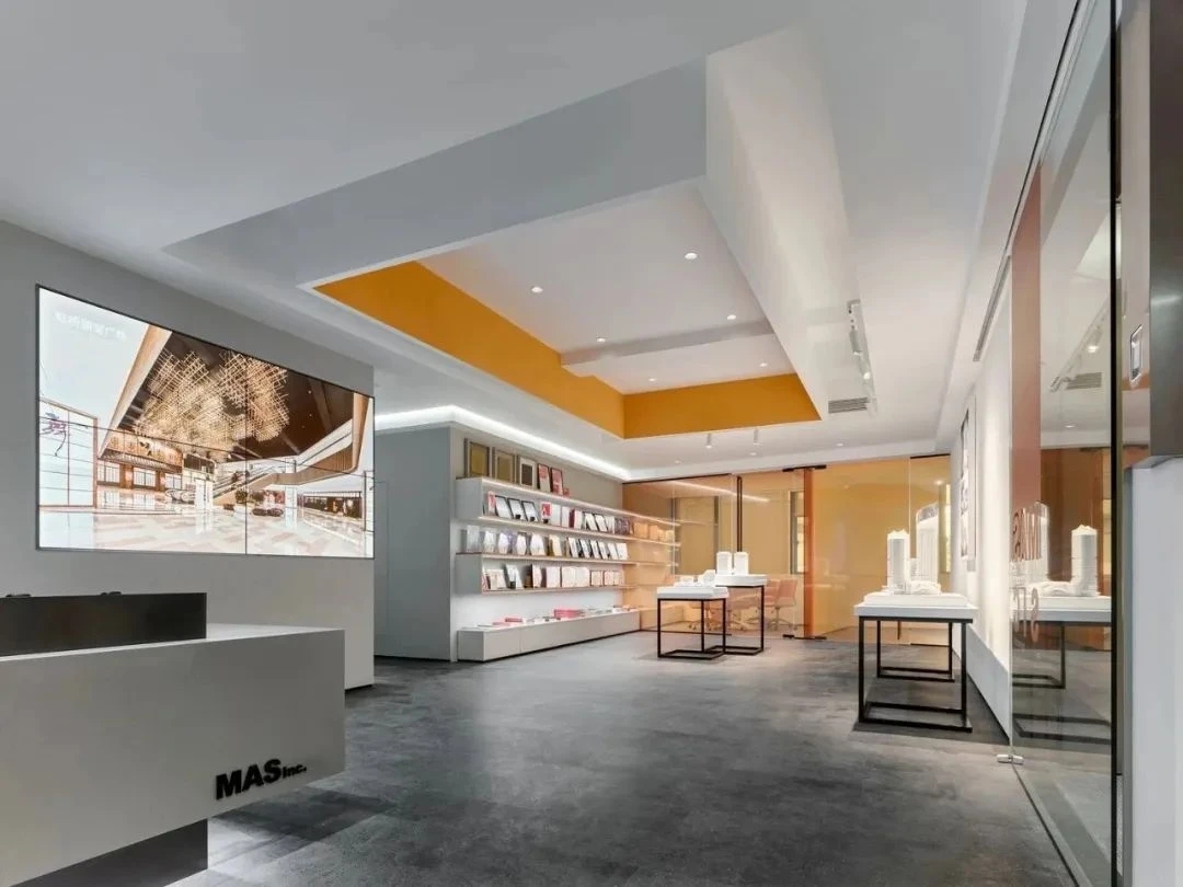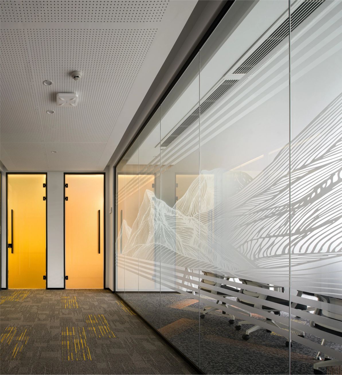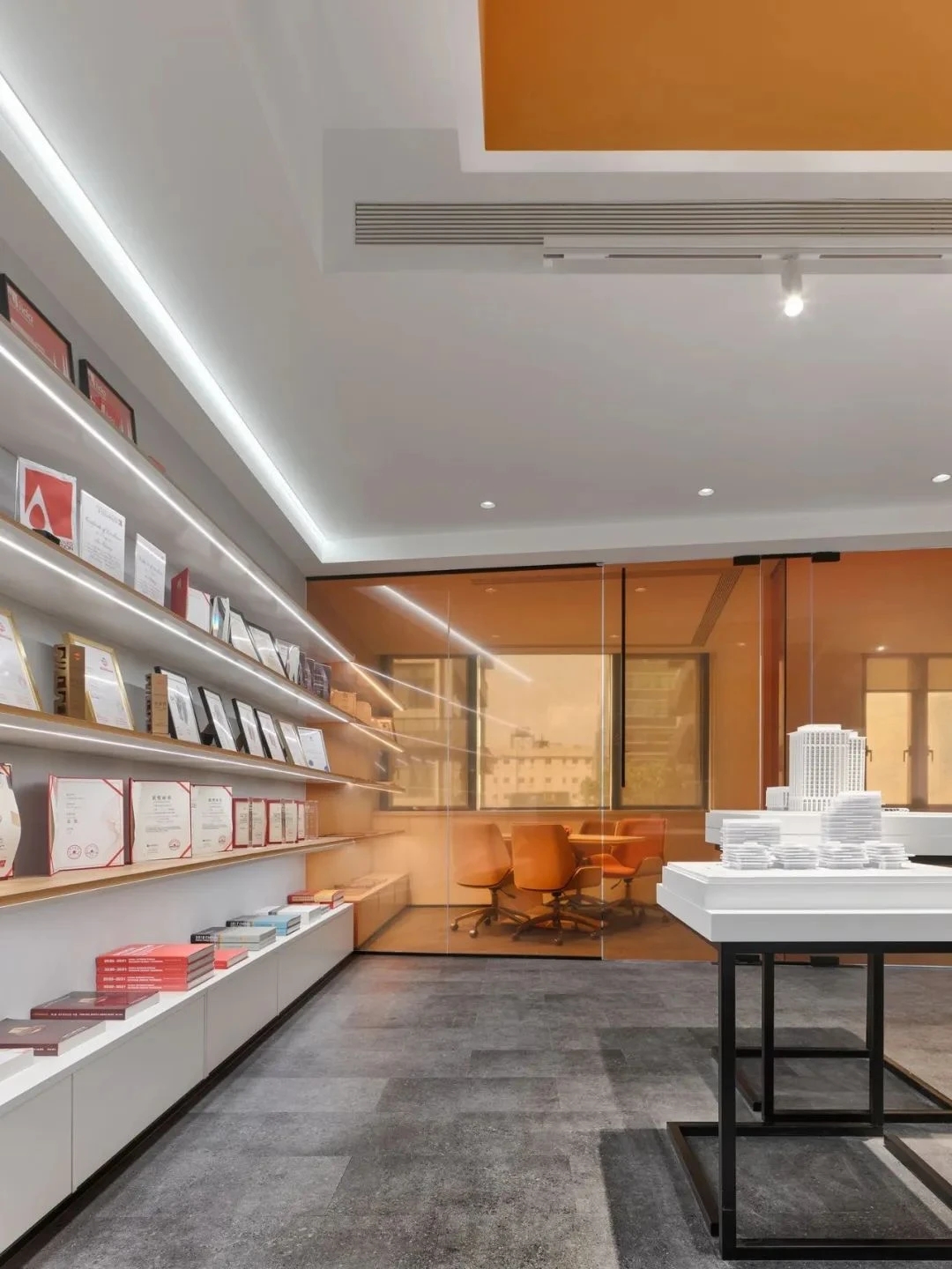荣誉展示区,光线透过接待室,橙色贴膜与自然光的融合,使展示空间中更具无限延伸,彰显活力。