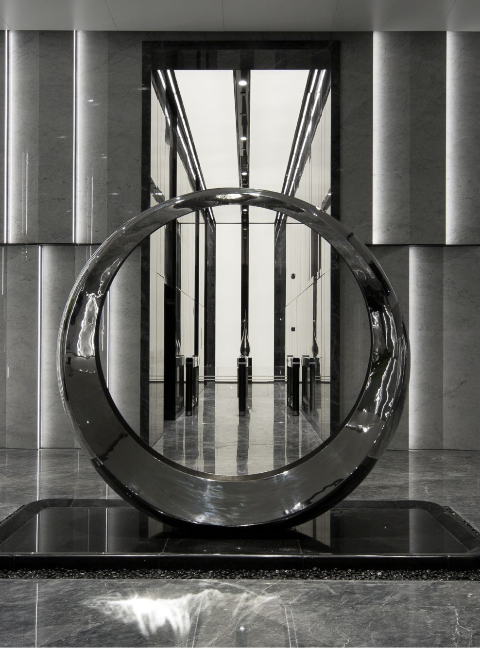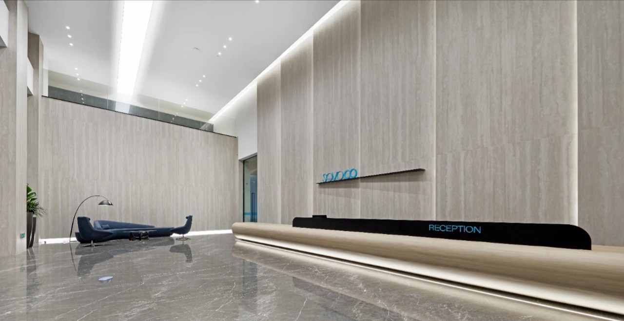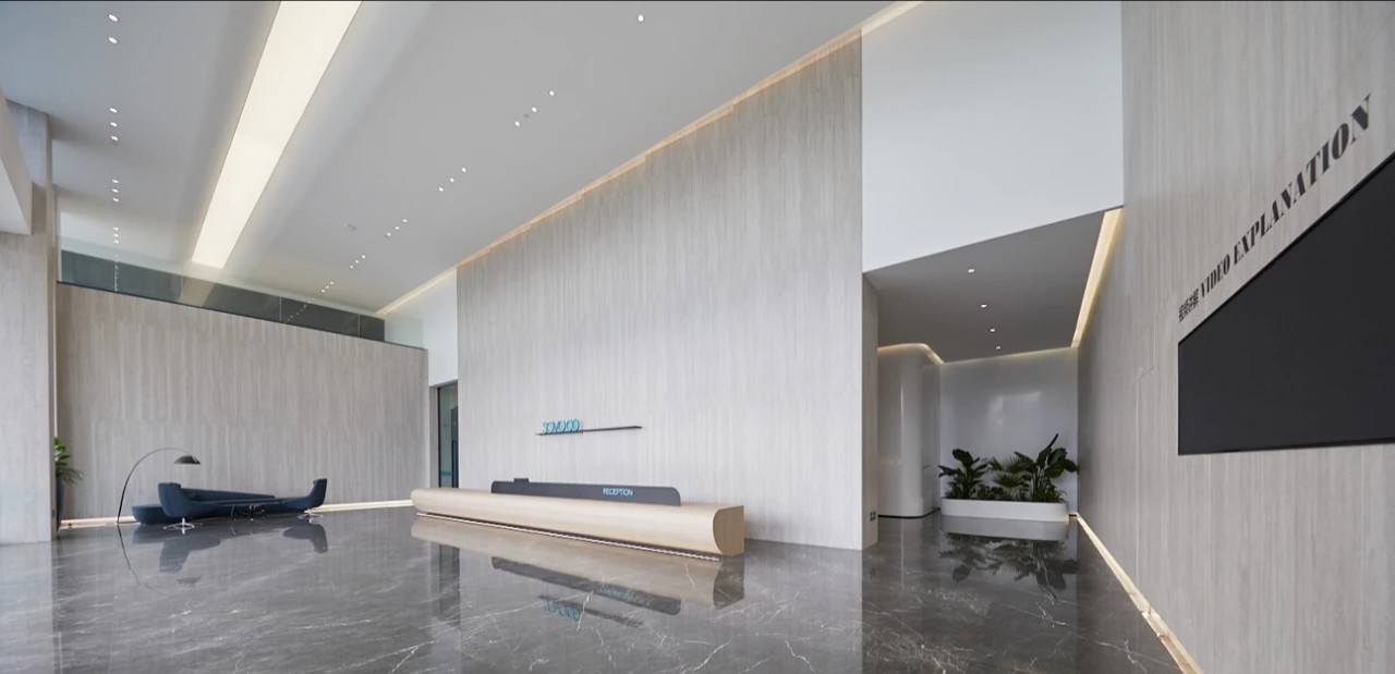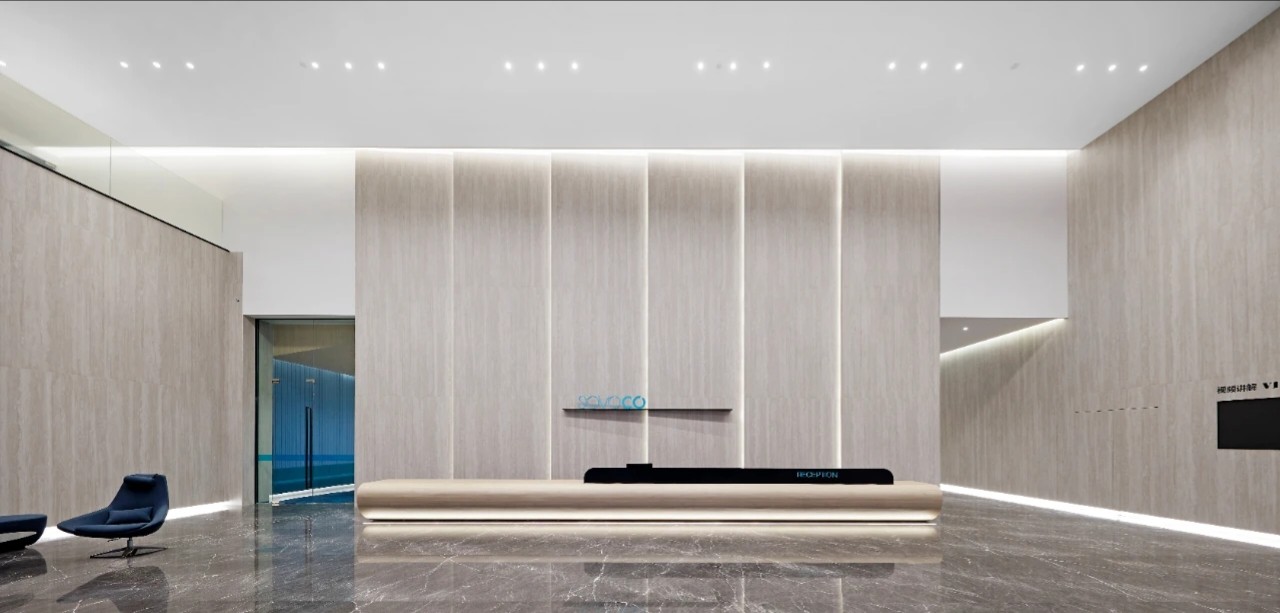 在一楼的大堂设计中初相设计使用了灰色作为空间主色调。深灰与浅灰色的岩板在空间中与理石和其他材料搭配使用缔造了一个充满未来科技感且不失高级的空间。