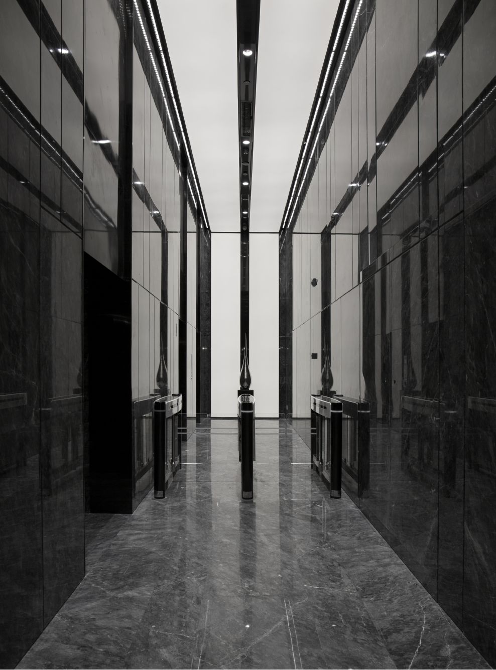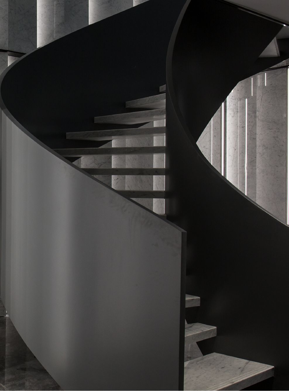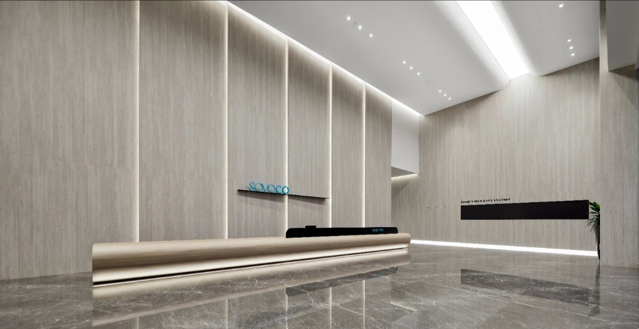 在一楼的大堂设计中初相设计使用了灰色作为空间主色调。深灰与浅灰色的岩板在空间中与理石和其他材料搭配使用缔造了一个充满未来科技感且不失高级的空间。