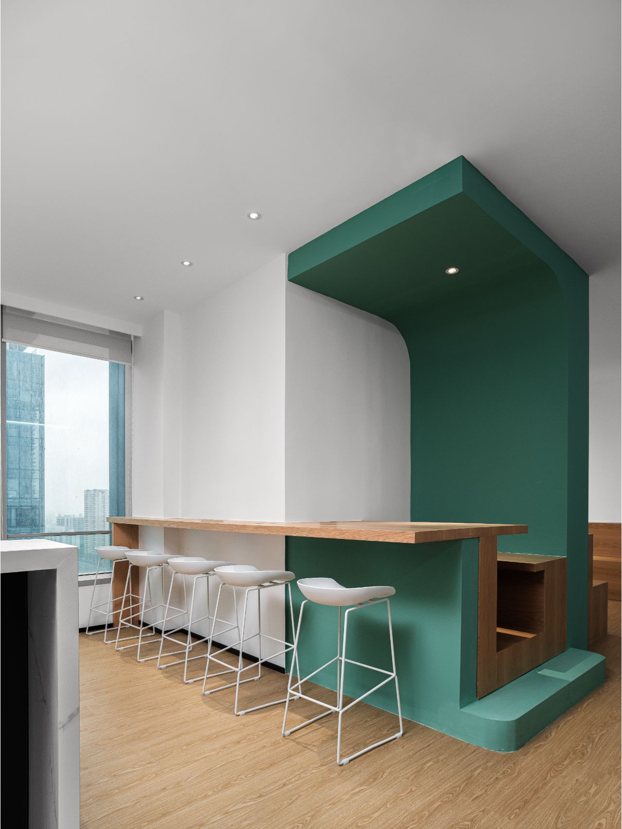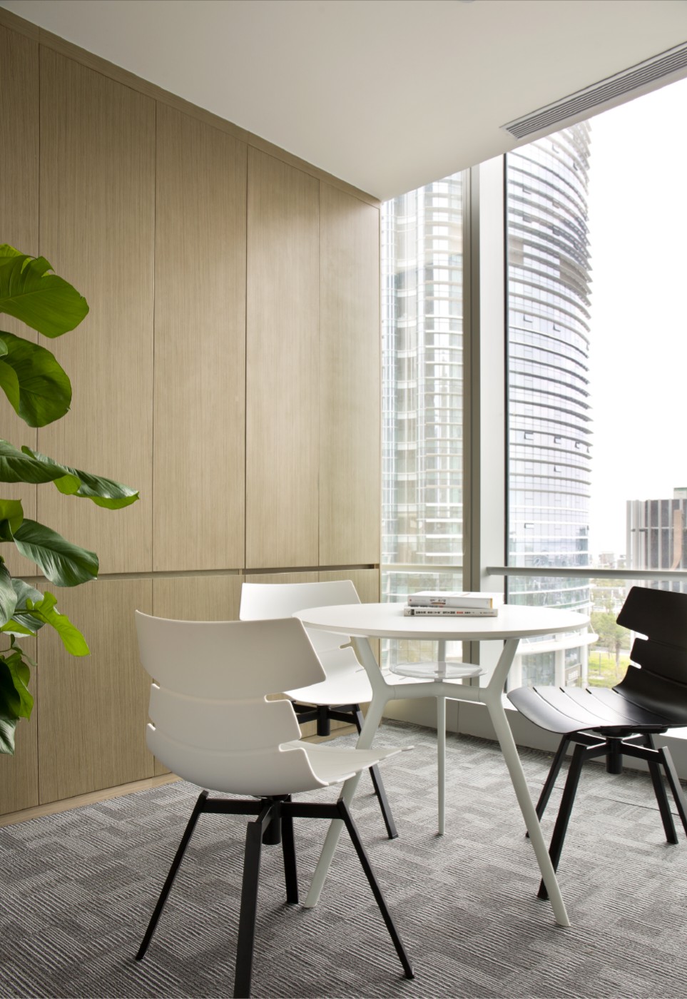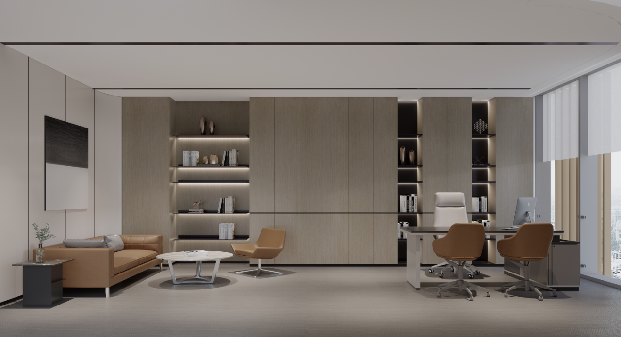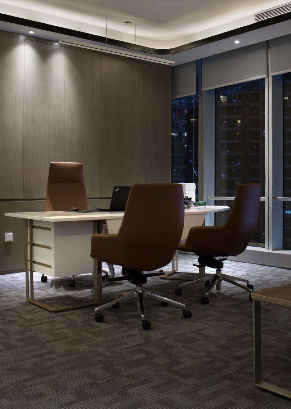 总裁办公室设于五层办公区,室内以“未来生活”为基点使用无机涂料和木材进行点缀装饰。延续总裁办公室的风格衍生出多元社交空间——洽谈室、休息室和茶室等区域。
