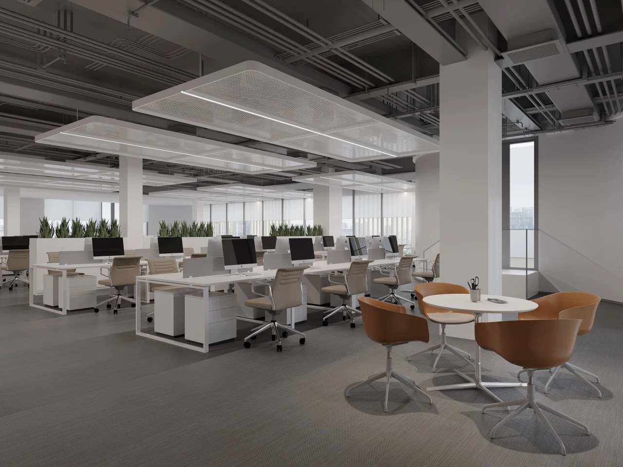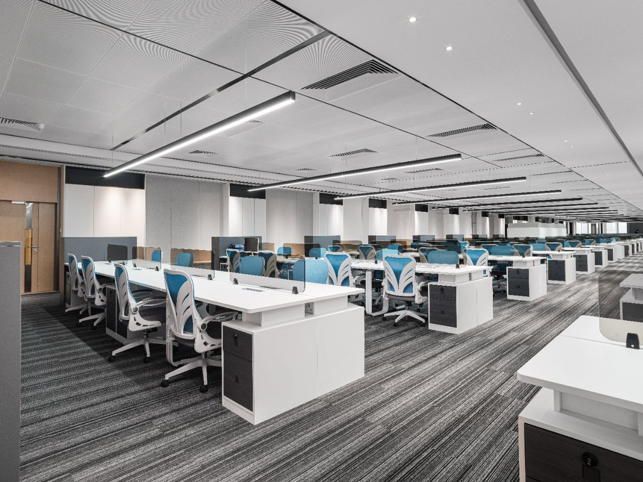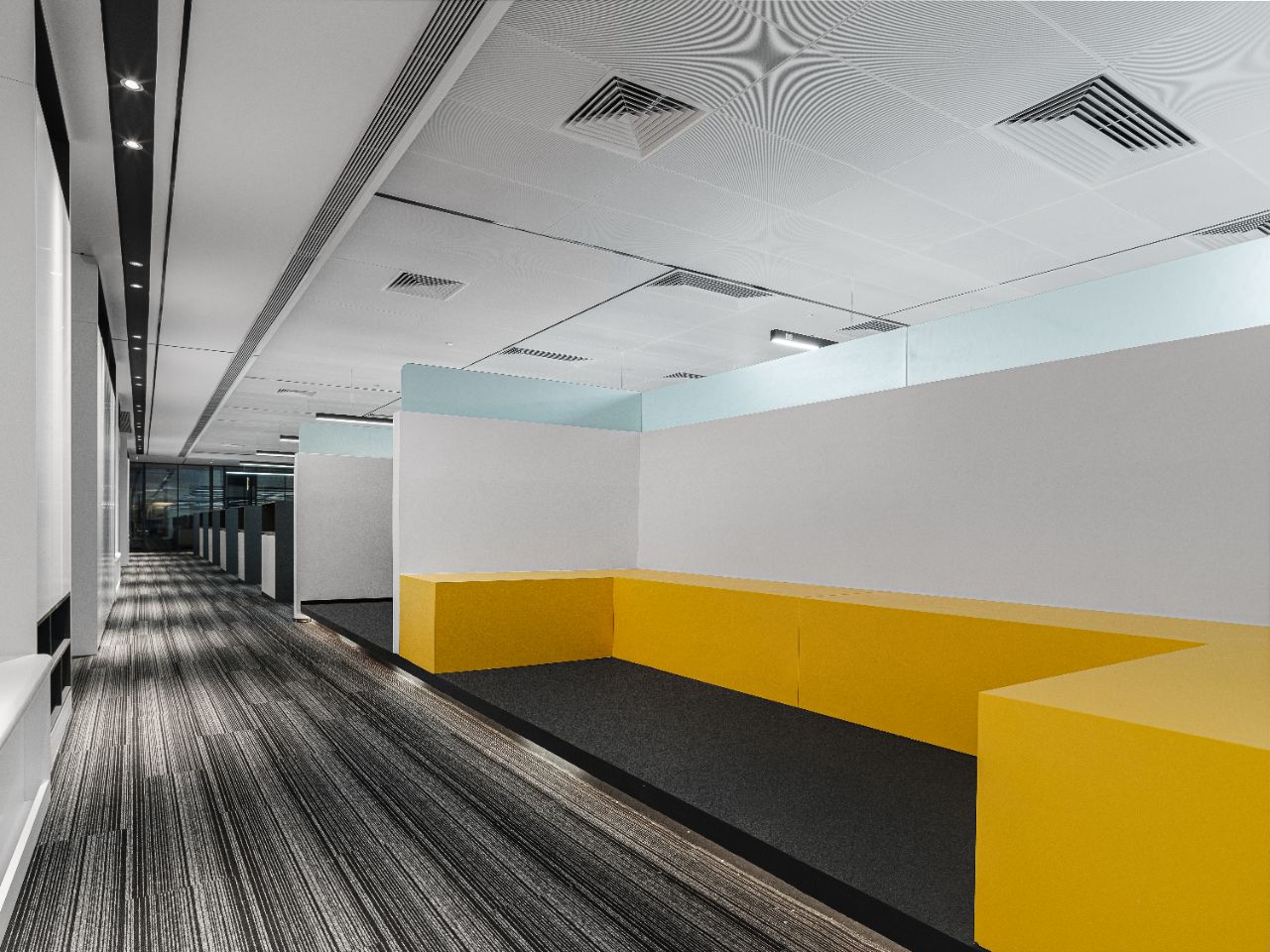 办公区域以太空灰金属隔栅点缀,地面铺设BOLON地毯营造品质空间。顶部方形的灯具设计打破了沉闷,形成多维度的视觉体验。
