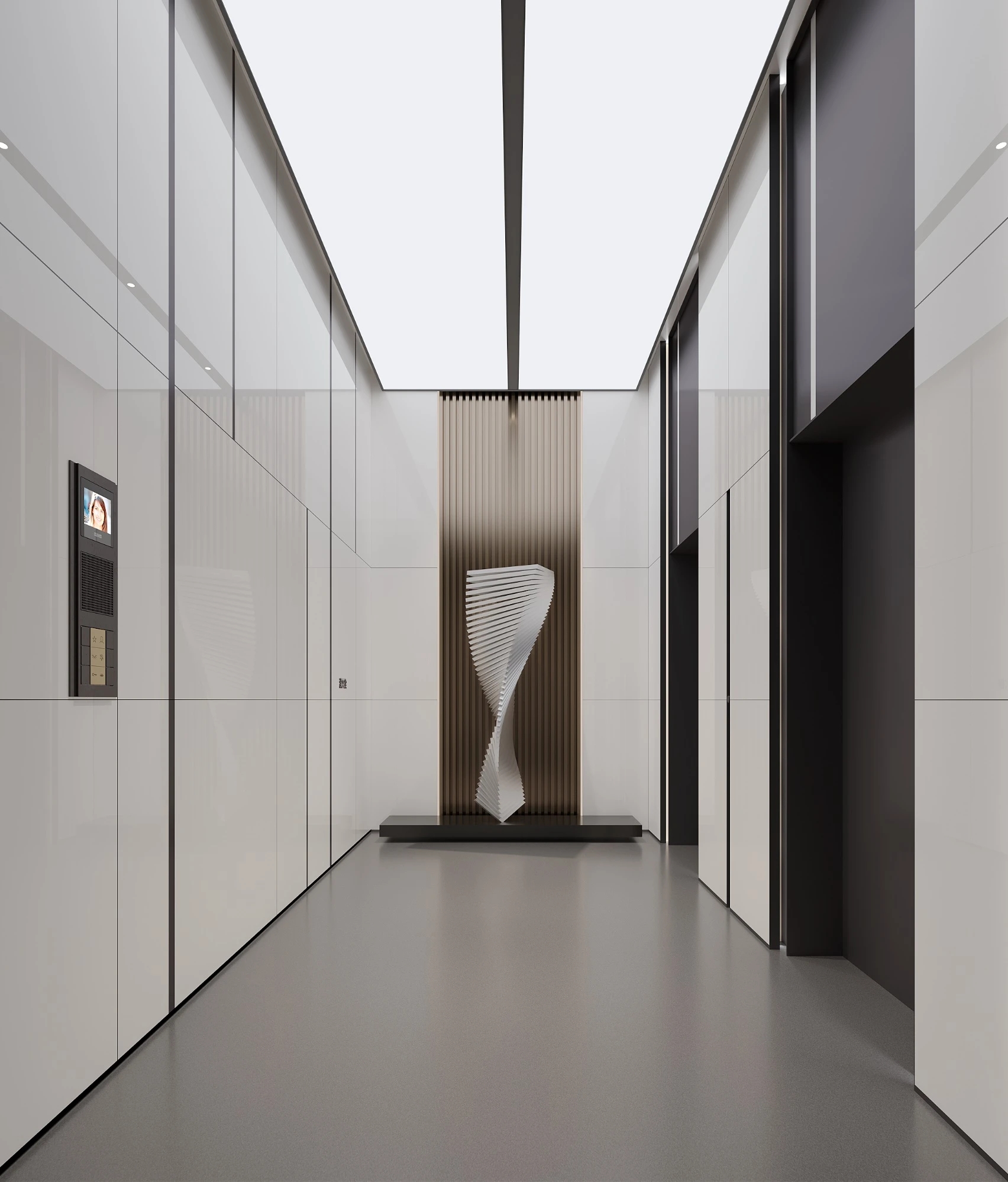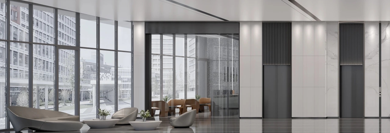 艾德公司是低调务实的公司,公司根植本土文化,具有国际视野。对设计的追求是德式的严谨和内敛。大堂运用了不同明度的灰创造出隽永的商务气息。不同层次的光影叠加让空间有未来的体验感。大堂结合著名艺术家的金属雕塑提升价值观的同时谙合了风水文化。