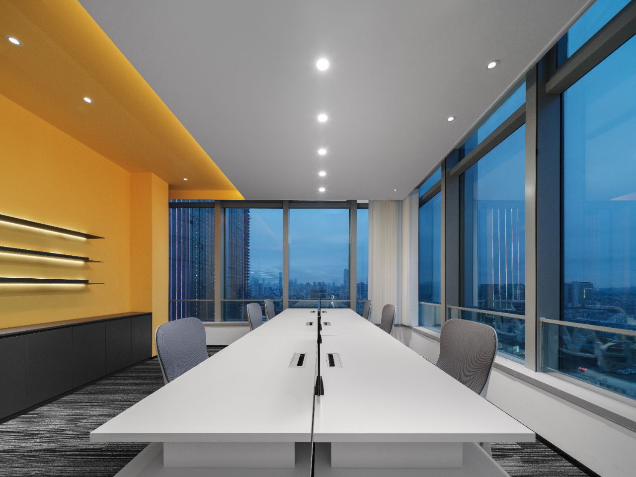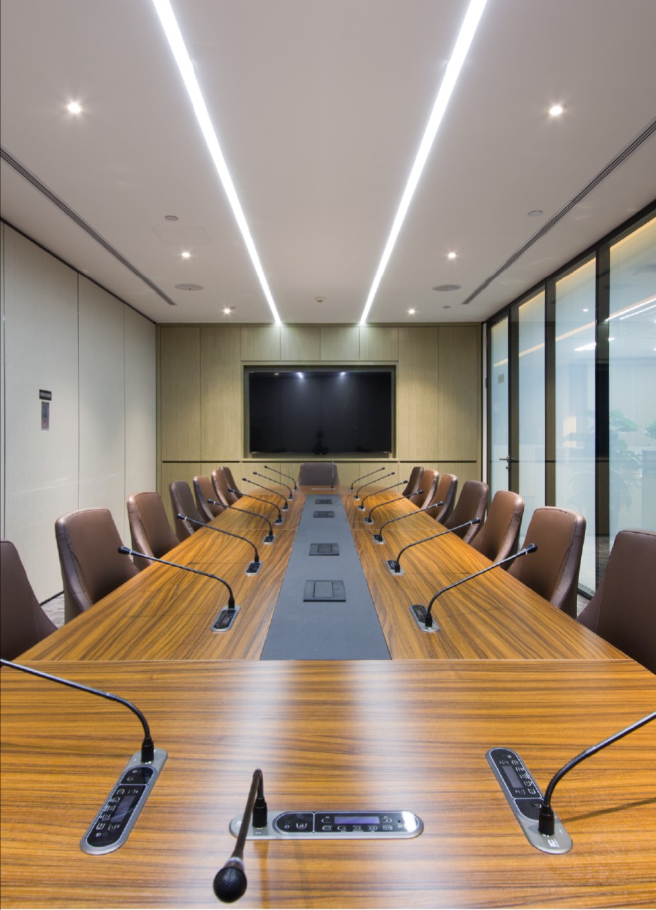简洁通亮的会议室成为办公区的最大亮点,通电玻璃让会议室与外部形成整体,必要时又可以具有一定的私密性。
