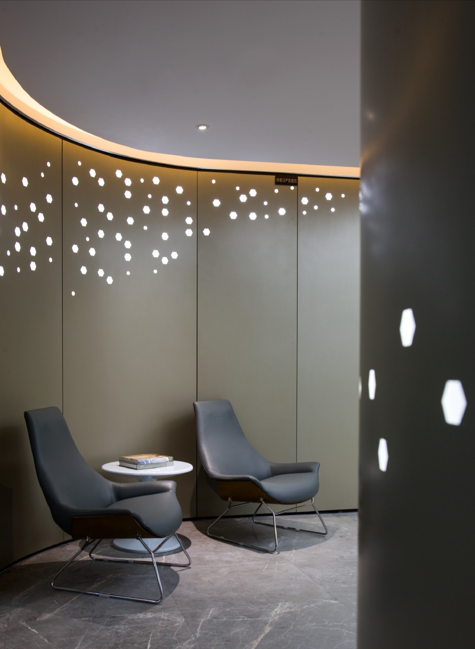 电梯厅入口作为空间开场,米灰亮光岩板为基底的金属材质在空间四周围绕,上方大面积铺设透光灯膜使得空间明亮极具质感,“生活碳元素”的设计概念在此得到体现。