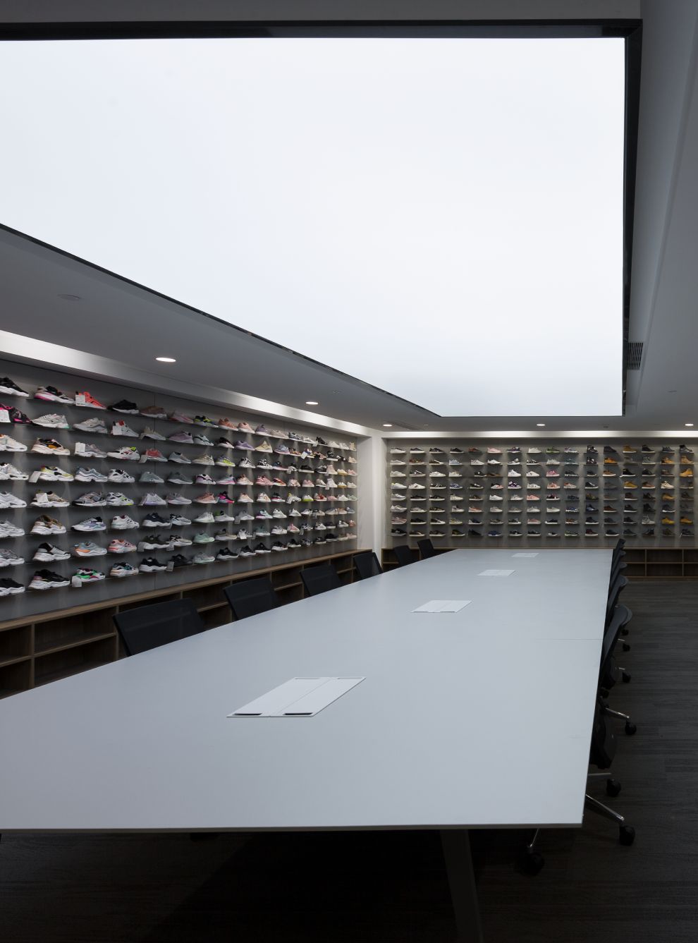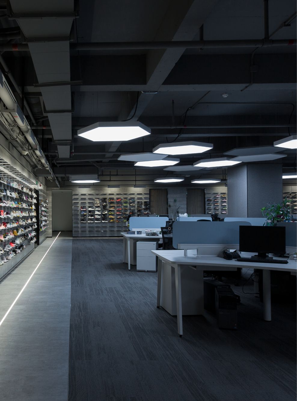 研发区是鞋类设计师的工作区,每个设计师要根据设计图进行面料、鞋底、鞋带等不同物料进行搭配。确定后再送往打样工厂。所以设计师每天要和诸多样鞋工作。空间解决了样鞋陈列收纳的问题,并给设计师创造一个轻松、有序的工作空间。