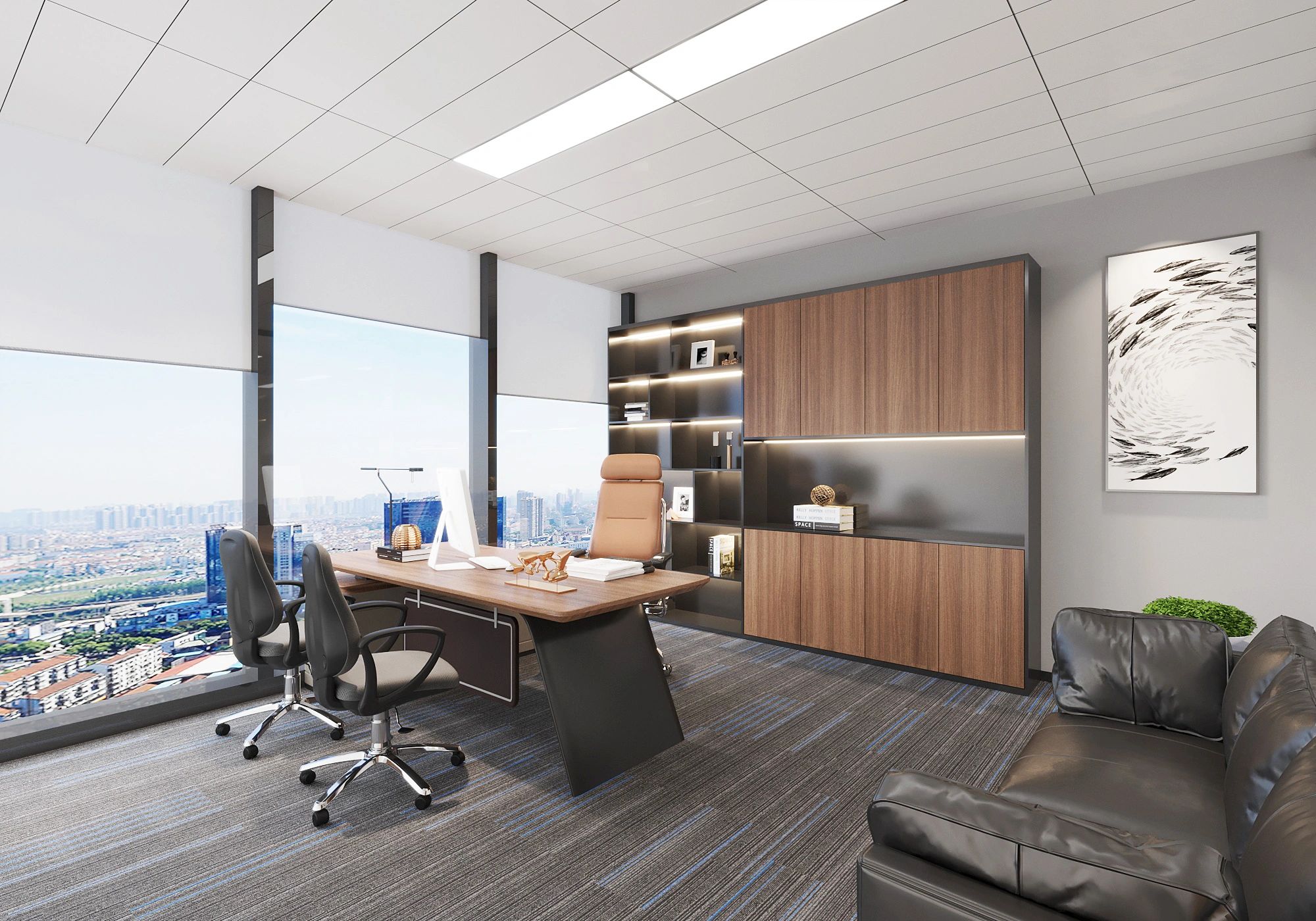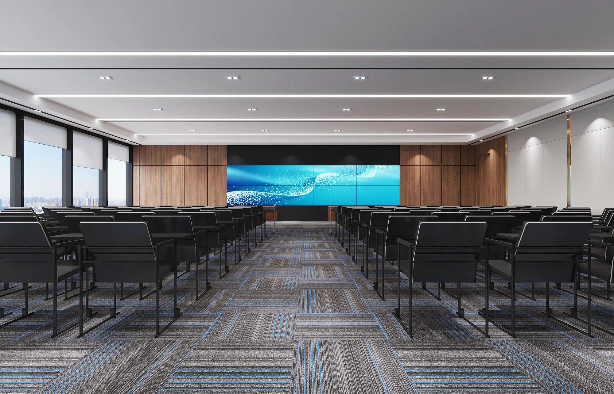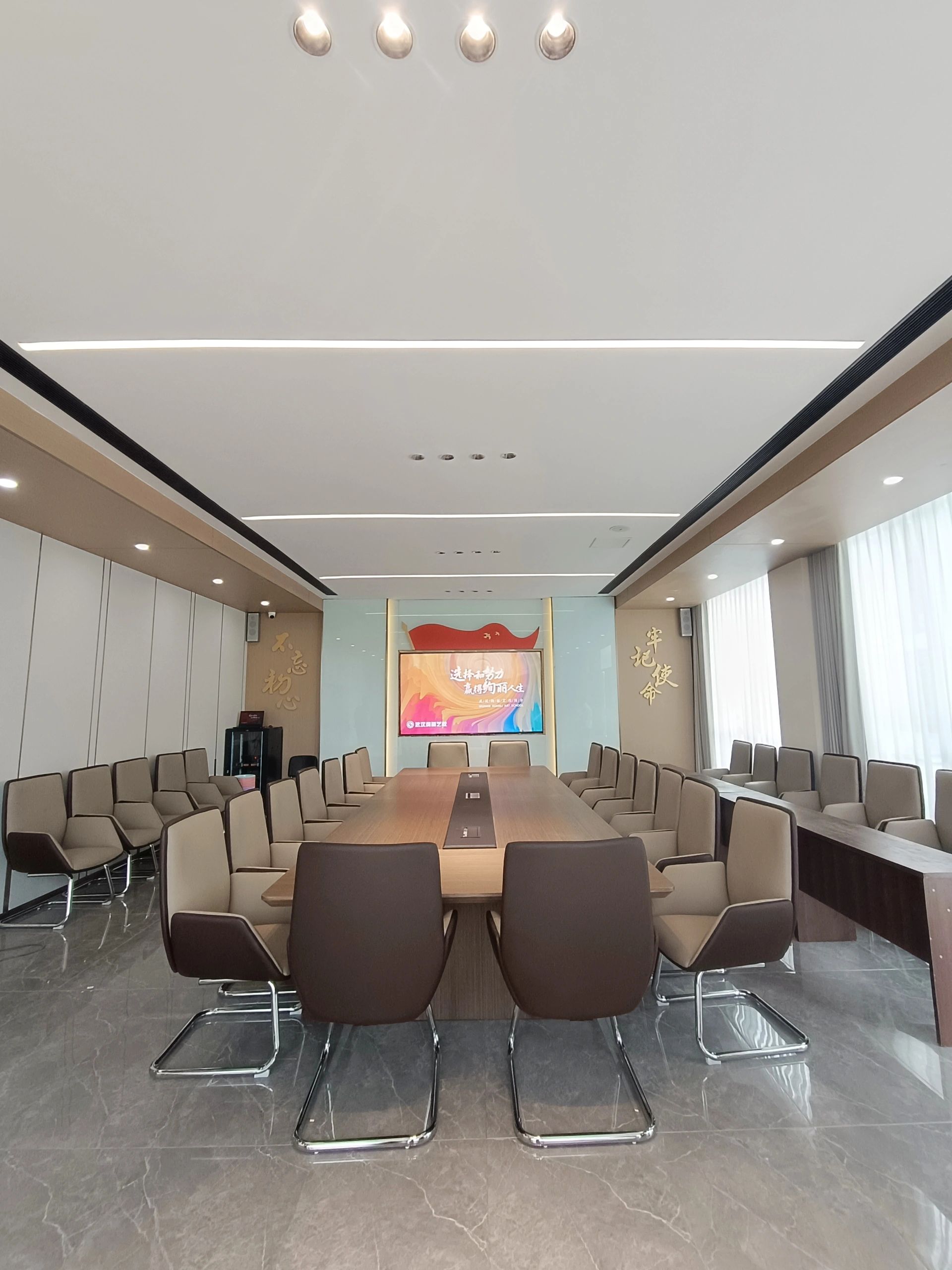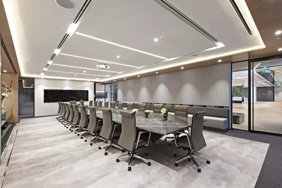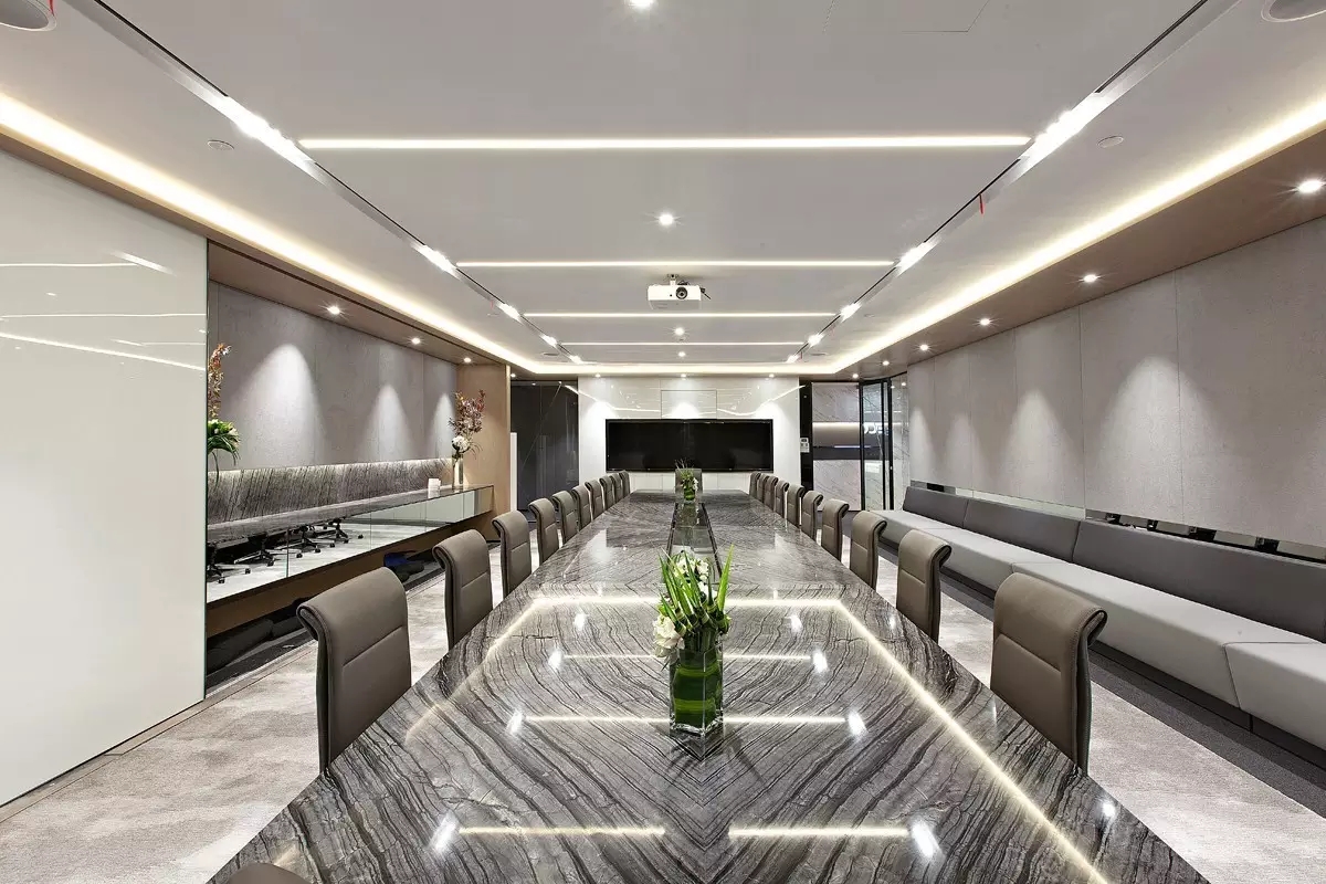 会议桌光面石材的黑白灰流线型纹理,地毯的不规则水墨痕迹,再配合咖灰色真皮Ona executive的抛光金属五星脚。VIP会议区通过不同材料、纹理、色彩的运用使会议区增添了空间层次感与高贵气质。