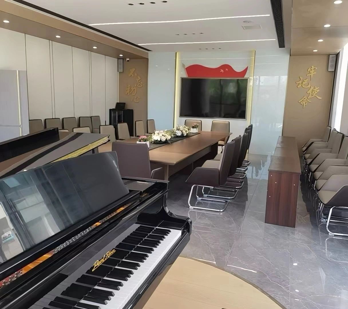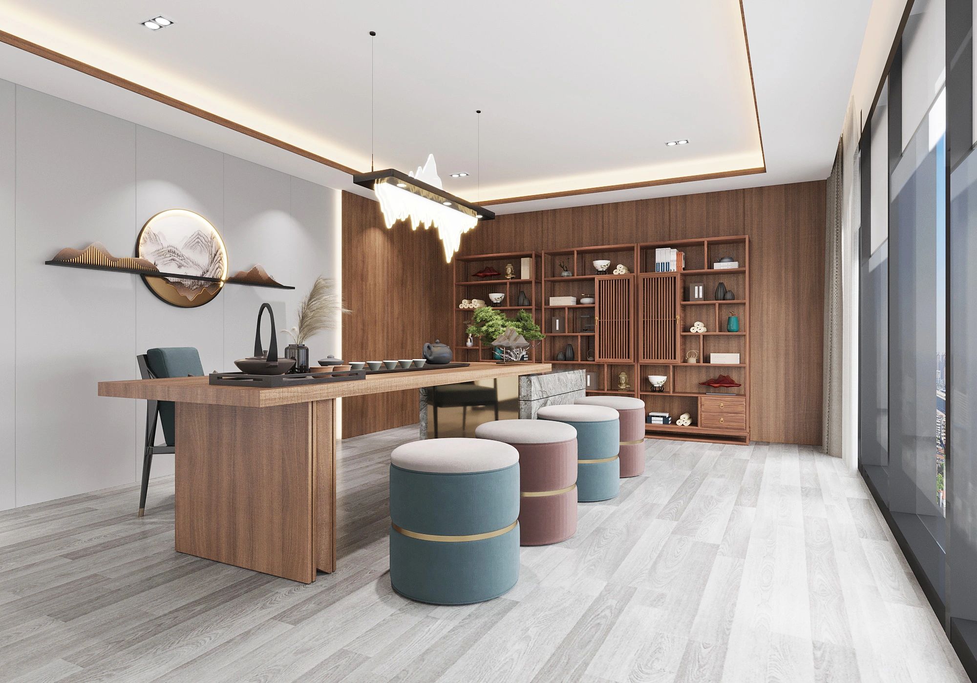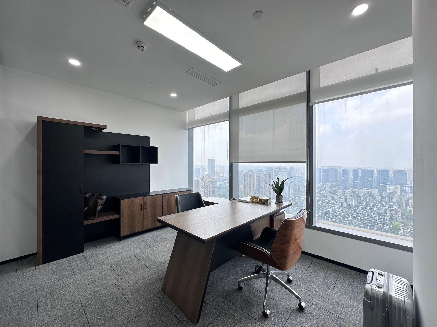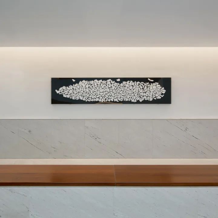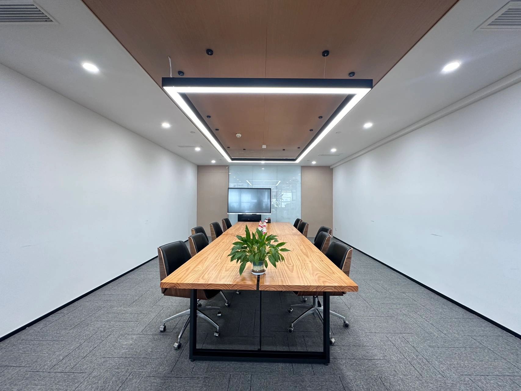 会议桌光面石材的黑白灰流线型纹理,地毯的不规则水墨痕迹,再配合咖灰色真皮Ona executive的抛光金属五星脚。VIP会议区通过不同材料、纹理、色彩的运用使会议区增添了空间层次感与高贵气质。