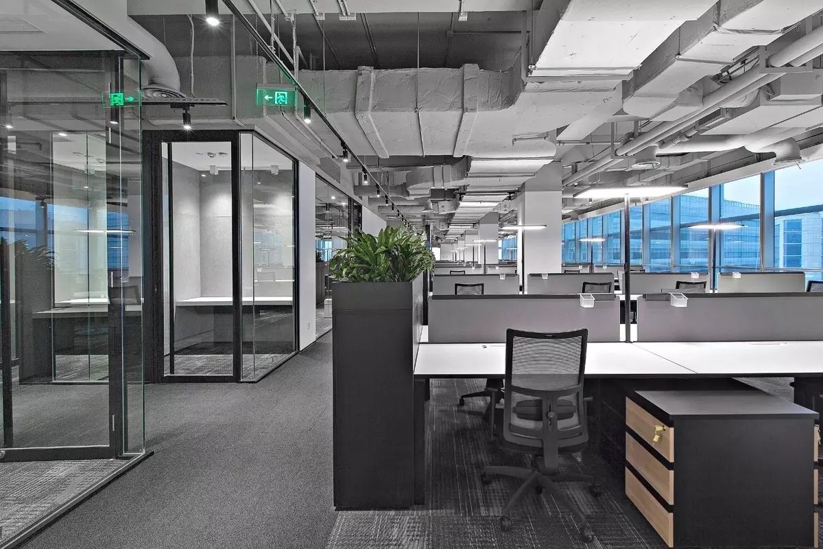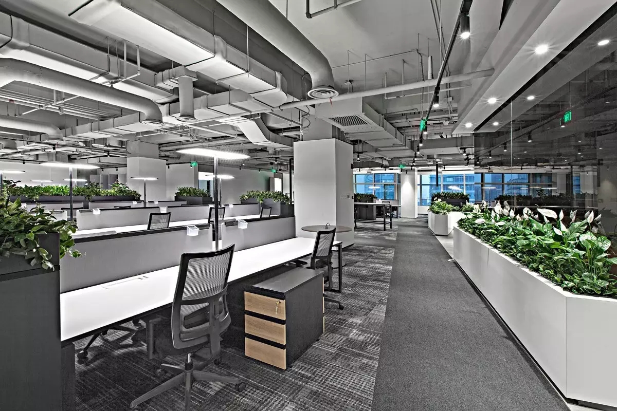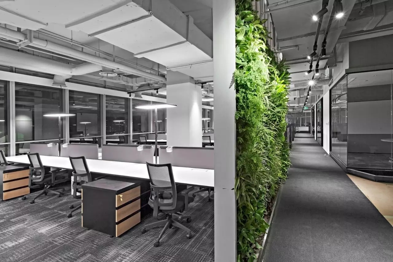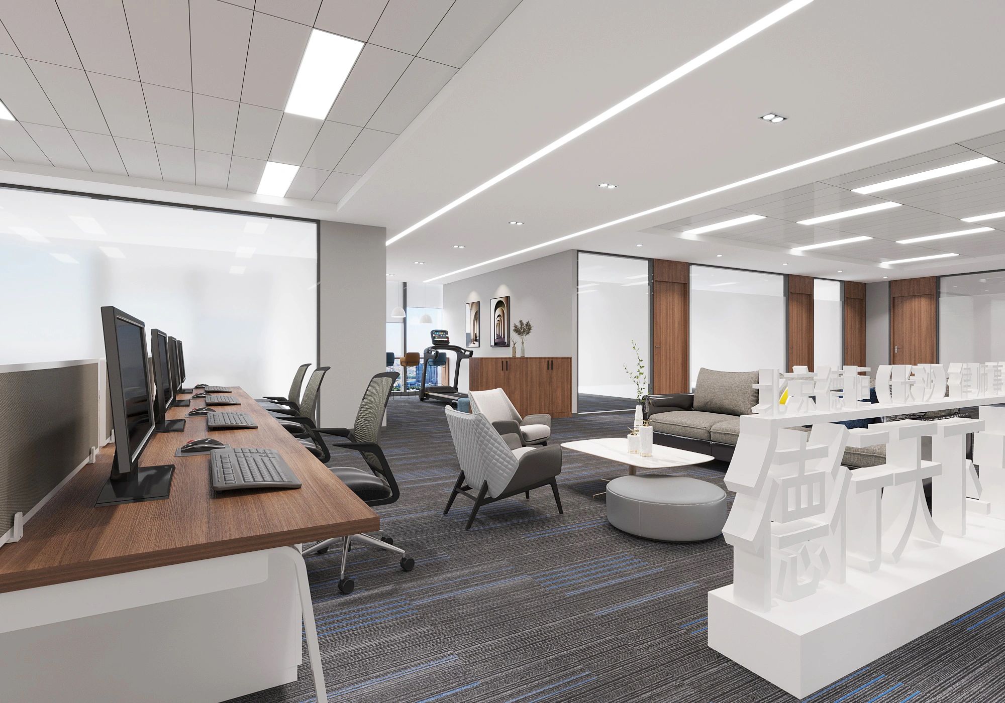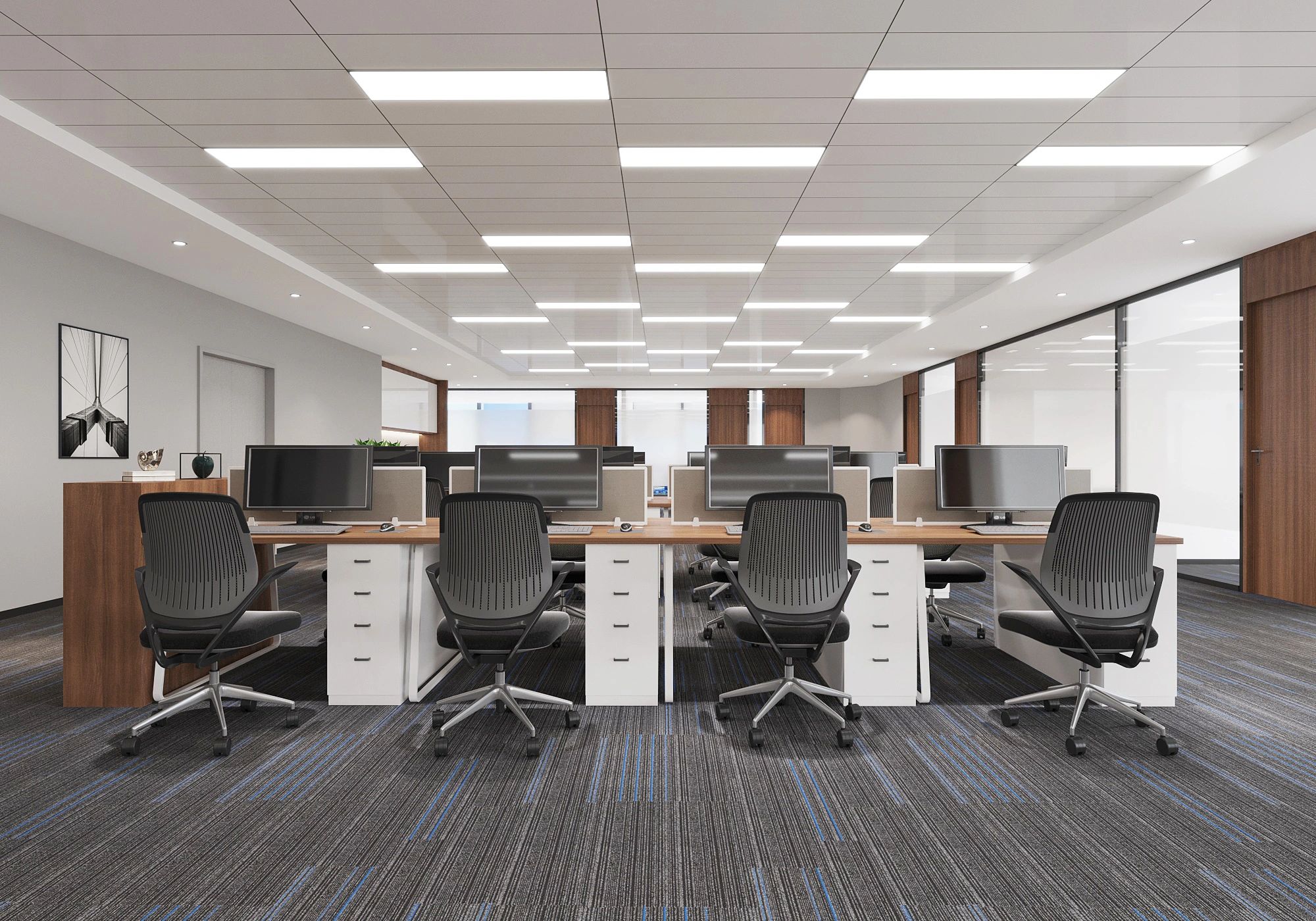 Matsu将灯具与员工位整合,让开放式的办公空间更显整洁。每个员工位都配有文具收纳挂件。让员工管理好桌面的最好方式,提供科学的收纳空间。 员工工作区域地毯,与公共走道采用不同花色但同一色系的地毯,并且与工作位的桌上屏风保持一致。因此整体空间统一感极强。