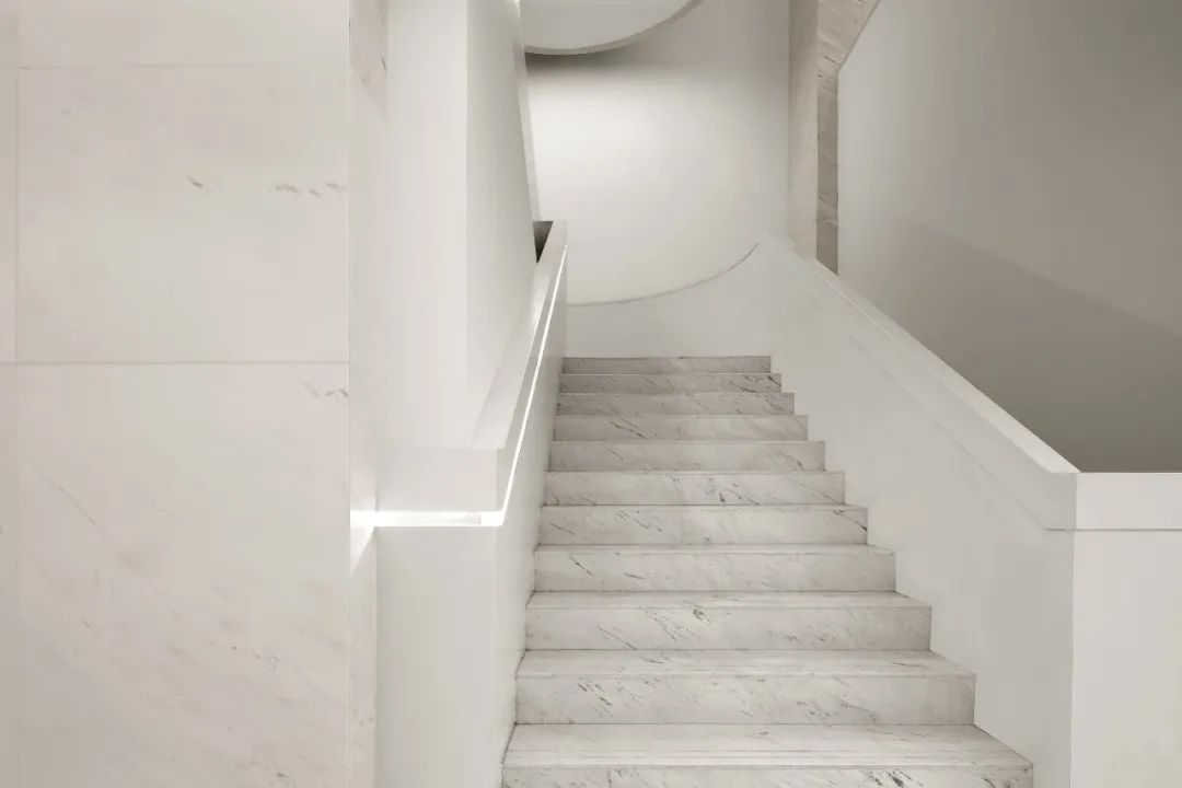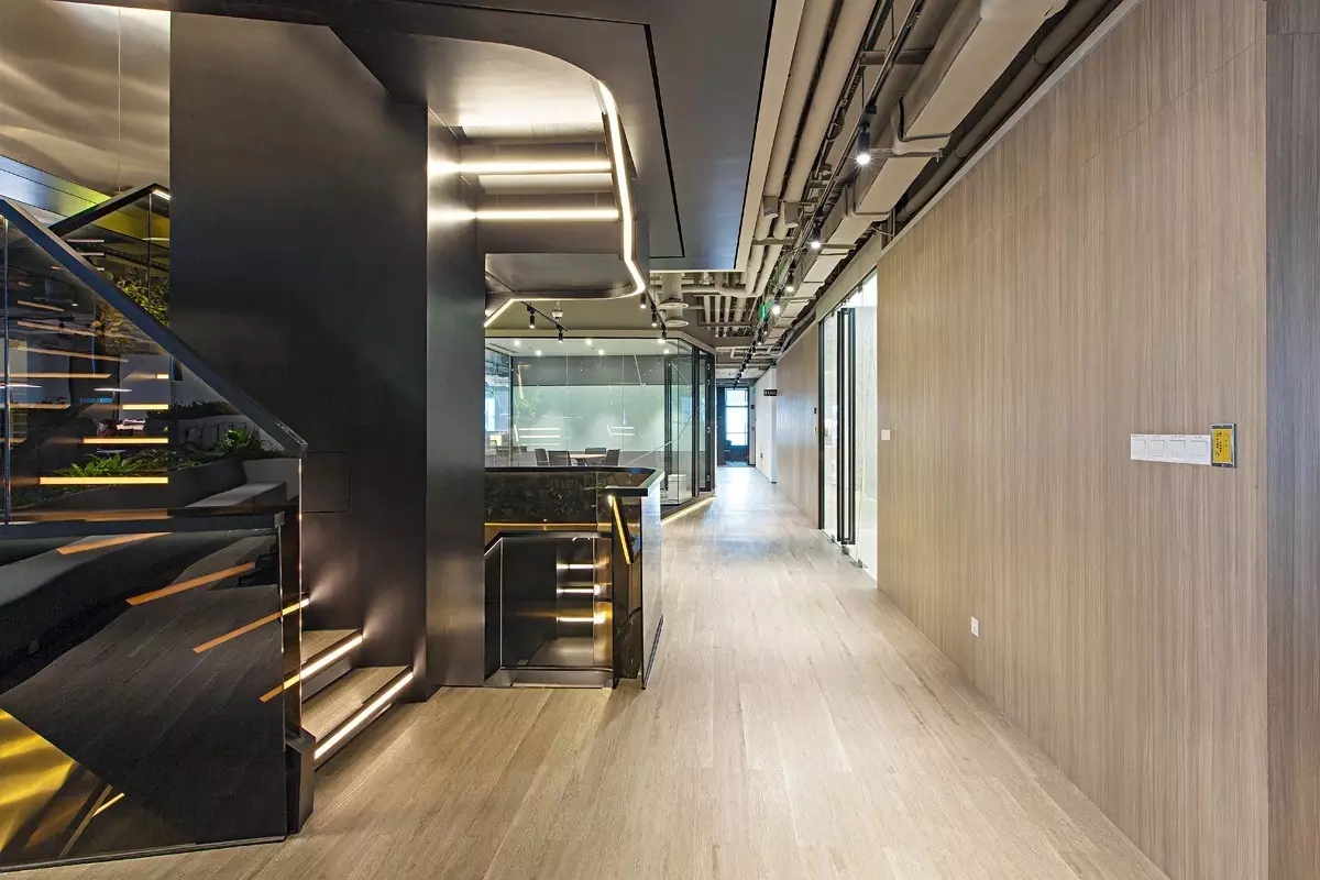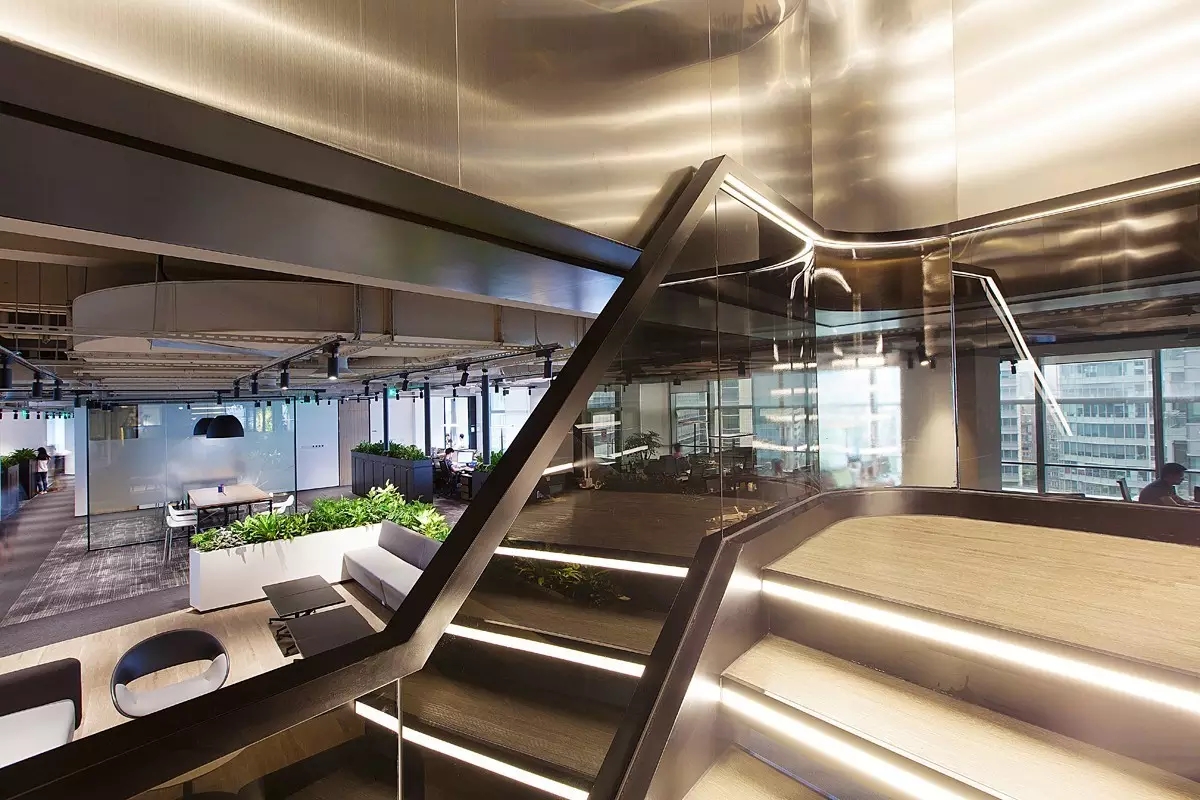 AECOM办公室共有四层楼,面积达7000多平米,中央楼梯在四个楼层的串连中至关重要。楼梯设计以黑色为基调,配合茶色玻璃与灯带,在旋转中通过不同角度的视觉叠加更显时尚与设计感。