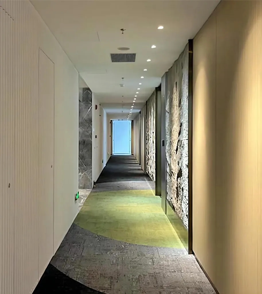 外部的走廊区域,墙面是仿石材的泡沫板,仿真的岩石纹路带来稳重感的同时,又带来些许生机;地毯选择了绿色与灰色的撞色系来点缀活泼的气氛,当人经过这里的时候,都忍不住会愉悦起来。