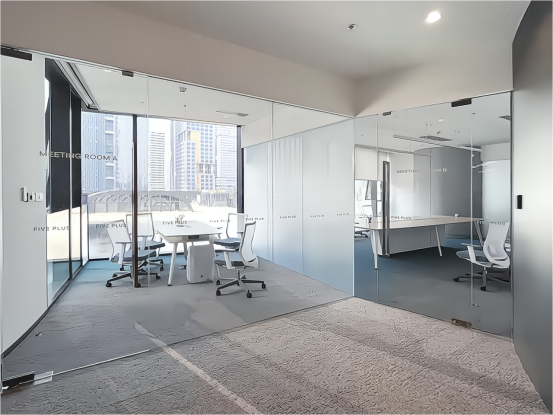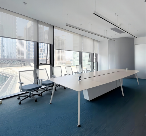 与前台金灿灿的感觉形成鲜明对比的是,会议区由冷静优雅的银白色搭配些许的沉着蓝色,使氛围增加肃静感,让人交流时的思绪能沉淀下来。