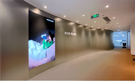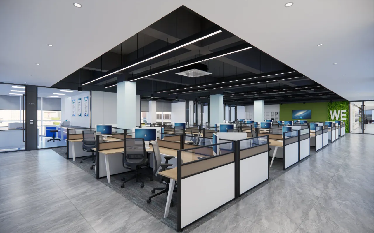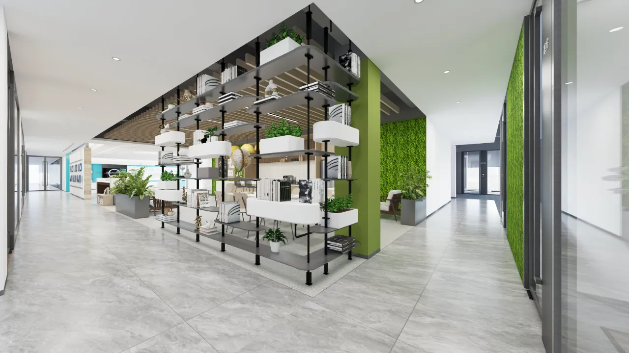 天蓝是研发部的主题色,这具有疗愈效果的色彩能舒缓思维创作带来的压力,另外还设置了一整面碧绿墙壁,让身心更为舒适放松。