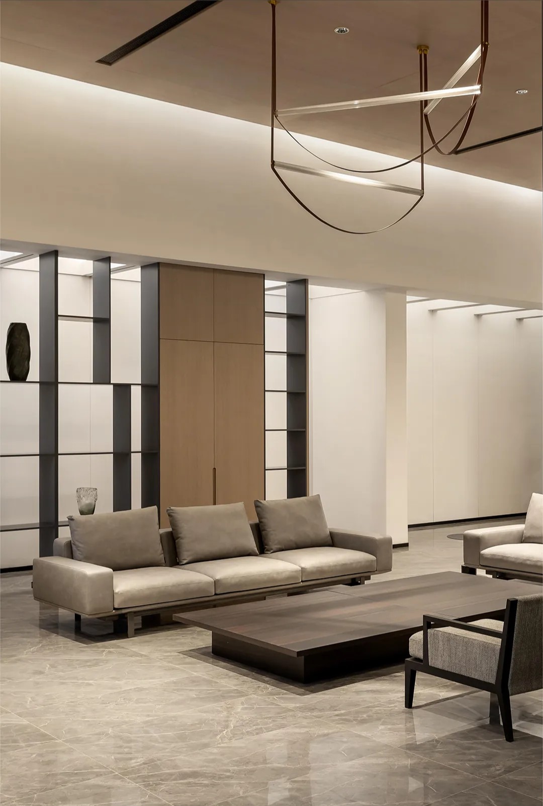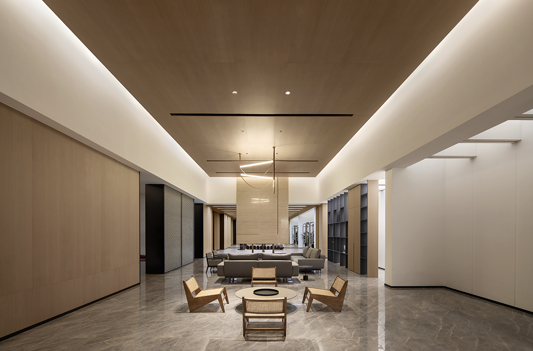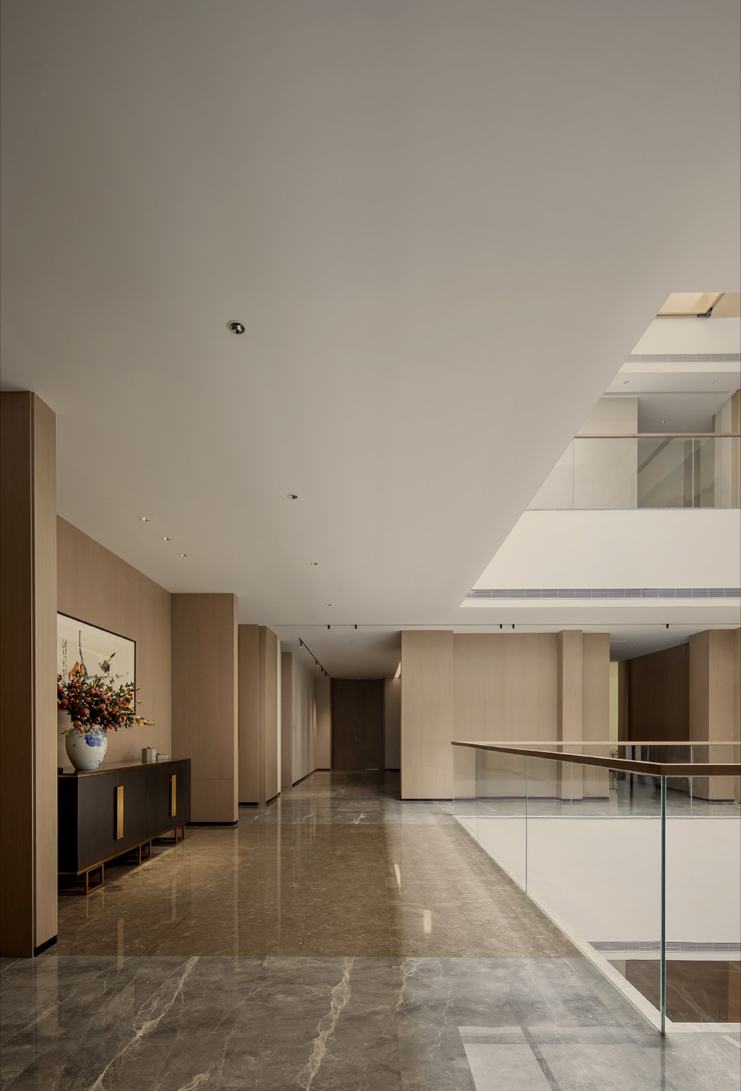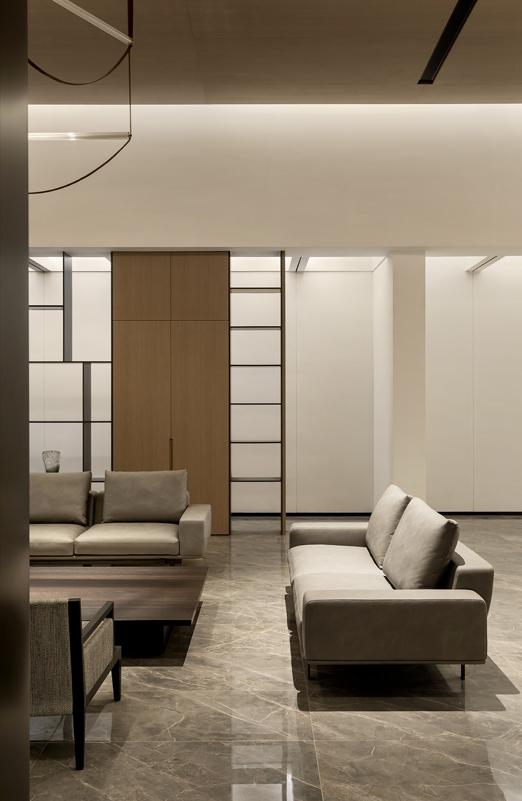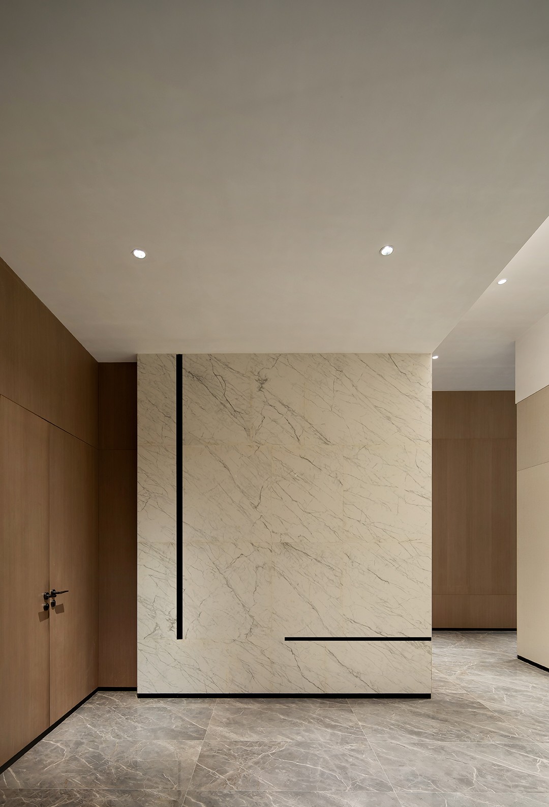 原木饰面的墙壁与精细的大理石地板相互映衬,就像⼀幅巨大的对比画卷 。玻璃隔断如同空间的镜子,反射出了线条和块面的交织,构成了⼀个隔而不断的视觉场景,将视线和光线都引向了更深的空间。